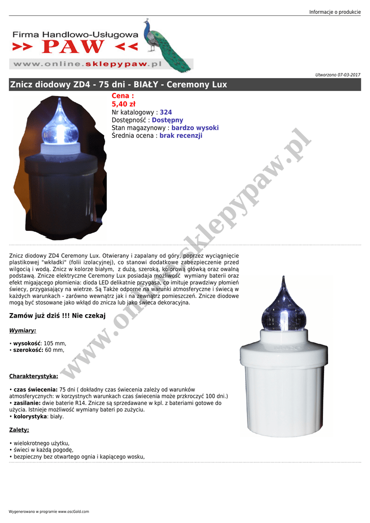 Informacje o produkcie Utworzono 07-03-2017 Znicz diodowy ZD4 - 75 dni - BIAŁY - Ceremony Lux Cena : 5,40 zł sk le py pa w .p l Nr katalogowy : 324 Dostępność : Dostępny Stan magazynowy : bardzo wysoki Średnia ocena : brak recenzji Wymiary: w w • wysokość: 105 mm, • szerokość: 60 mm, w .o Zamów już dziś !!! Nie czekaj nl in e. Znicz diodowy ZD4 Ceremony Lux. Otwierany i zapalany od góry, poprzez wyciągnięcie plastikowej "wkładki" (folii izolacyjnej), co stanowi dodatkowe zabezpieczenie przed wilgocią i wodą. Znicz w kolorze białym, z dużą, szeroką, kolorową główką oraz owalną podstawą. Znicze elektryczne Ceremony Lux posiadaja możliwość wymiany baterii oraz efekt migającego płomienia: dioda LED delikatnie przygasa, co imituje prawdziwy płomień świecy, przygasający na wietrze. Są Także odporne na warunki atmosferyczne i świecą w każdych warunkach - zarówno wewnątrz jak i na zewnątrz pomieszczeń. Znicze diodowe mogą być stosowane jako wkłąd do znicza lub jako świeca dekoracyjna. Charakterystyka: • czas świecenia: 75 dni ( dokładny czas świecenia zależy od warunków atmosferycznych: w korzystnych warunkach czas świecenia może przkroczyć 100 dni.) • zasilanie: dwie baterie R14. Znicze są sprzedawane w kpl. z bateriami gotowe do użycia. Istnieje możliwość wymiany bateri po zużyciu. • kolorystyka: biały. Zalety; • wielokrotnego użytku, • świeci w każdą pogodę, • bezpieczny bez otwartego ognia i kapiącego wosku, Wygenerowano w programie www.oscGold.com