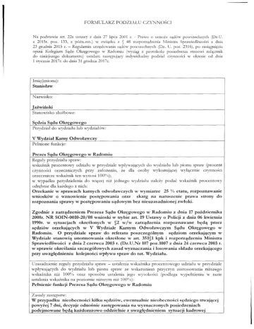 FORMULARZ PODZIAŁU CZYNNOŚCI Na podstawie art. 22a ustawy z dnia 27 lipca 2001 r. - Prawo o ustroju sądów powszechnych (Dz.U. z 2015r. póz. 133, z późn.zm.) w związku z § 48 rozporządzenia Ministra Sprawiedliwości z dnia 23 grudnia 2015 r. — Regulamin urzędowania sądów powszechnych (Dz. U. póz. 2316), po zasięgnięciu opinii Kolegium Sądu Okręgowego w Radomiu (wyciąg z protokołu posiedzenia stanowi załącznik do niniejszego dokumentu) ustalam następujący indywidualny podział czynności w okresie od dnia l stycznia 2017r. do dnia 31 grudnia 2017r. Imię (imiona): Stanisław Nazwisko: Jazwiński Stanowisko służbowe: Sędzia Sądu Okręgowego Przydział do wydziału lub wydziałów: V Wydział Karny Odwoławczy Pełnione funkcje: Prezes Sądu Okręgowego w Radomiu Reguły przydziału spraw: wskaźnik procentów)' udziału w przydziale wpływających do wydziału lub pionu spraw (procent czynności orzeczniczych przy założeniu, że dla osoby wykonującej wyłącznie czynności orzecznicze wskaźnik ten wynosi 100%); w wypadku przydzielenia do więcej niż jednego wydziału należy podać wskaźnik procentowy odrębnie dla każdego z nich; Orzekanie w sprawach karnych odwoławczych w wymiarze 25 % etatu, rozpoznawanie wniosków o wznowienie postępowania oraz skarg na naruszenie prawa strony do rozpoznania sprawy w postępowaniu sądowym bez nieuzasadnionej zwłoki. Zgodnie z zarządzeniem Prezesa Sądu Okręgowego w Radomiu z dnia 17 października 2008r. NR SOIN-0010-20/08 wnioski w trybie art. 19 Ustawy o Policji z dnia 06 kwietnia 1990r. w sytuacjach określonych w §2 w/w zarządzenia rozpoznawane będą przez sędziów orzekających w V Wydziale Karnym Odwoławczym Sądu Okręgowego w Radomiu. O przydziale spraw do referatu poszczególnym sędziom orzekającym w Wydziale stanowią unormowania określone w art. 351§1 kpk i rozporządzeniu Ministra Sprawiedliwości z dnia 2 czerwca 2003 r. (Dz.U.Nr 107 póz.1007 z dnia 24 czerwca 2003 r. w sprawie określania szczegółowych zasad wyznaczania i losowania składu orzekającego przy uwzględnieniu kolejności wpływu spraw do tut. Wydziału. Uzasadnienie reguły przydziału spraw — ustalenia wskaźnika procentowego udziału w przydziale wpływających do wydziału lub pionu spraw ze wskazaniem przyczyn zastosowania niższego wskaźnika niż 100% oraz sposobu ustalenia jego wysokości (podlega wypełnieniu w razie ustalenia wskaźnika na poziomie niższym niż 100%): Pełnienie funkcji Prezesa Sądu Okręgowego w Radomiu Zasady zastępstw: W przypadku nieobecności kilku sędziów, ewentualnie nieobecności sędziego trwającej powyżej 7 dni, decyzje odnośnie zastępowania na wyznaczonych posiedzeniach podejmowane będą każdorazowo oddzielnie z uwzględnieniem sytuacji kadrowej Wydziału, za wyjątkiem nieobecności związanej z wykorzystywaniem urlopu wypoczynkowego Dodatkowe obciążenia oraz ich wymiar (np. dyżury aresztowe, dyżury sędziów rodzinnych, koordynatorzy): ! OKRĘGOWEGO 2 9 LIS, 2016 Podpis PREZES -WypisZ protokołu posiedzenia 23 2016r. listopada Kolegium Obrady Sądu Kolegium Okręgowego rozpoczęto w w Radomiu Sądzie z dnia Okręgowym w Radomiu o godz. 14.00. W obradach uczestniczyli: Przewodniczący Kolegium Prezes Sądu Okręgowego w Radomiu SSO Stanisław Jaźwiński. Członkowie sędziowie: SSO Anna Glin, SSO Anna Kierończyk, SSO Adriana Orzechowska, SSO Adam Piechota, SSR Anna Barwicka-Zając, SSR Krzysztof Duchnik, SSR Jacek Łata. Protokołował: SSR Anna Barwicka-Zając. Porządek posiedzenia: 1. Wyrażenie opinii w sprawie projektu podziału czynności w Sądzie Okręgowym w Radomiu i sądach rejonowych okręgu radomskiego sędziów i referendarzy sądowych oraz określenie zastępstw sędziów i referendarzy sądowych i zasad przydziału spraw poszczególnym sędziom i referendarzom sądowym na 2017 rok, 2. (...), 3. (...), 4. (...) Kolegium jednogłośnie przyjęło zaproponowany porządek posiedzenia Ad. l Przewodniczący Kolegium przedstawił projekt podziału czynności sędziów w Sądzie Okręgowym w Radomiu w Wydziałach od II do VII Kolegium w głosowaniu jawnym, bez udziału w głosowaniu Prezesa Sądu Okręgowego w Radomiu jednogłośnie w drodze uchwały, pozytywnie zaopiniowało projekt podziału czynności sędziów Sądu Okręgowego w Radomiu w Wydziałach od II do VII oraz określenia zastępstw tych sędziów i zasad przydziału spraw poszczególnym sędziom na 2017 rok Kolegium zakończyło obrady o godz. 15.40 Przewodniczący Prezes Sądu Okręgowego Stanisław j azwinski Protokolant . . Sędzia Sądu Re onowego Anna Barwicka-Zając na oryginale tulaściuiy(e) podpis(y^ l STARSZY INSPEKTOR mgr ^wdlma Karpińska