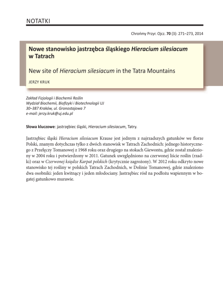 NOTATKI Nowe stanowisko jastrzębca śląskiego Hieracium