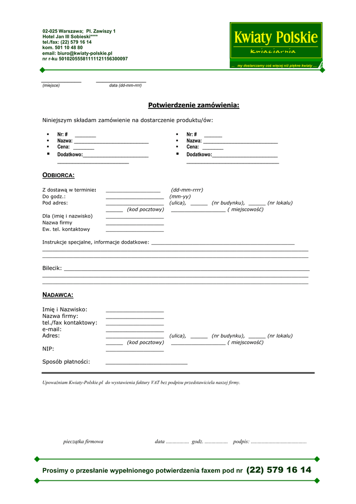 02-025 Warszawa; Pl. Zawiszy 1 Hotel Jan III Sobieski**** tel./fax: (22) 579 16 14 kom. 501 10 48 80 email: [email protected] nr r-ku 50102055581111121156300097 ____________ _______________ (miejsce) data (dd-mm-rrrr) Potwierdzenie zamówienia: Niniejszym składam zamówienie na dostarczenie produktu/ów: Nr: # _______ Nazwa: _________________________ Cena: _______ Dodatkowo:______________________ ________________________ Nr: # ______ Nazwa: _________________________ Cena: _______ Dodatkowo:______________________ _______________________________ ODBIORCA: Z dostawą w terminie: Do godz.: Pod adres: Dla (imię i nazwisko) Nazwa firmy Ew. tel. kontaktowy ________________ (dd-mm-rrrr) _________________ (mm-yy) _________________ (ulica), _____ (nr budynku), _____ (nr lokalu) _____ (kod pocztowy) ________________ ( miejscowość) _________________ _________________ _________________ Instrukcje specjalne, informacje dodatkowe: __________________________________________ ______________________________________________________________________________ ______________________________________________________________________________ Bilecik: ________________________________________________________________________ ______________________________________________________________________________ ______________________________________________________________________________ NADAWCA: Imię i Nazwisko: Nazwa firmy: tel./fax kontaktowy: e-mail: Adres: NIP: _________________ _________________ _________________ _________________ _________________ (ulica), _____ (nr budynku), _____ (nr lokalu) _____ (kod pocztowy) ________________ ( miejscowość) _________________ Sposób płatności: ________________________ Upoważniam Kwiaty-Polskie.pl do wystawienia faktury VAT bez podpisu przedstawiciela naszej firmy. pieczątka firmowa data ................. godz. ................. podpis: ......................................... Prosimy o przesłanie wypełnionego potwierdzenia faxem pod nr (22) 579 16 14