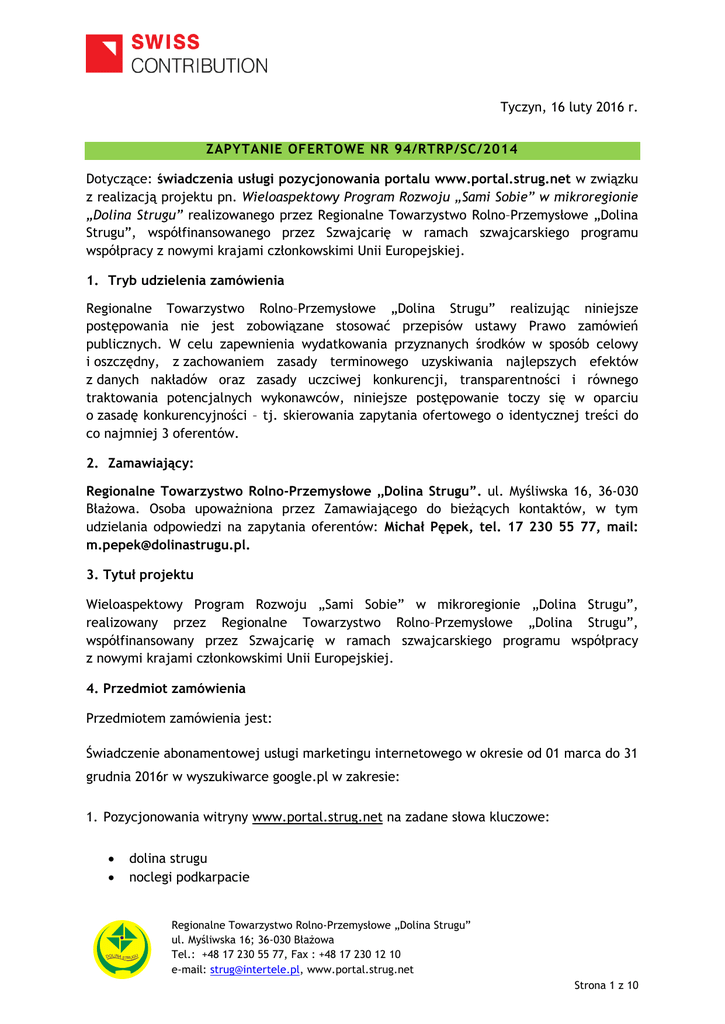 Tyczyn, 16 luty 2016 r. ZAPYTANIE OFERTOWE NR 94/RTRP/SC/2014 Dotyczące: świadczenia usługi pozycjonowania portalu www.portal.strug.net w związku z realizacją projektu pn. Wieloaspektowy Program Rozwoju „Sami Sobie” w mikroregionie „Dolina Strugu” realizowanego przez Regionalne Towarzystwo Rolno–Przemysłowe „Dolina Strugu”, współfinansowanego przez Szwajcarię w ramach szwajcarskiego programu współpracy z nowymi krajami członkowskimi Unii Europejskiej. 1. Tryb udzielenia zamówienia Regionalne Towarzystwo Rolno–Przemysłowe „Dolina Strugu” realizując niniejsze postępowania nie jest zobowiązane stosować przepisów ustawy Prawo zamówień publicznych. W celu zapewnienia wydatkowania przyznanych środków w sposób celowy i oszczędny, z zachowaniem zasady terminowego uzyskiwania najlepszych efektów z danych nakładów oraz zasady uczciwej konkurencji, transparentności i równego traktowania potencjalnych wykonawców, niniejsze postępowanie toczy się w oparciu o zasadę konkurencyjności – tj. skierowania zapytania ofertowego o identycznej treści do co najmniej 3 oferentów. 2. Zamawiający: Regionalne Towarzystwo Rolno-Przemysłowe „Dolina Strugu”. ul. Myśliwska 16, 36-030 Błażowa. Osoba upoważniona przez Zamawiającego do bieżących kontaktów, w tym udzielania odpowiedzi na zapytania oferentów: Michał Pępek, tel. 17 230 55 77, mail: [email protected]. 3. Tytuł projektu Wieloaspektowy Program Rozwoju „Sami Sobie” w mikroregionie „Dolina Strugu”, realizowany przez Regionalne Towarzystwo Rolno–Przemysłowe „Dolina Strugu”, współfinansowany przez Szwajcarię w ramach szwajcarskiego programu współpracy z nowymi krajami członkowskimi Unii Europejskiej. 4. Przedmiot zamówienia Przedmiotem zamówienia jest: Świadczenie abonamentowej usługi marketingu internetowego w okresie od 01 marca do 31 grudnia 2016r w wyszukiwarce google.pl w zakresie: 1. Pozycjonowania witryny www.portal.strug.net na zadane słowa kluczowe: dolina strugu noclegi podkarpacie DOLINA S TR UGU Regionalne Towarzystwo Rolno-Przemysłowe „Dolina Strugu” ul. Myśliwska 16; 36-030 Błażowa Tel.: +48 17 230 55 77, Fax : +48 17 230 12 10 e-mail: [email protected], www.portal.strug.net Strona 1 z 10 noclegi Rzeszów noclegi podkarpacie agroturystyka noclegi Rzeszów agroturystyka agroturystyka podkarpacie agroturystyka Rzeszów agroturystyka okolice Rzeszowa agroturystyka Rzeszów i okolice gospodarstwa agroturystyczne podkarpacie gospodarstwa agroturystyczne na podkarpaciu gospodarstwa ekologiczne podkarpacie turystyka podkarpackie wypoczynek podkarpackie wypoczynek na podkarpaciu aktywny wypoczynek na podkarpaciu turystyka aktywna podkarpacie turystyka aktywna na podkarpaciu turystyka i rekreacja na podkarpaciu rekreacja na podkarpaciu rekreacja na wsi zdrowa żywność podkarpacie żywność ekologiczna podkarpacie ekologiczna żywność podkarpacie producenci żywności ekologicznej podkarpacie produkty ekologiczne podkarpacie rolnictwo ekologiczne podkarpacie uprawy ekologiczne podkarpacie warzywa ekologiczne podkarpacie pszczelarstwo Rzeszów pszczelarstwo podkarpacie miody ekologiczne podkarpacie pasieki podkarpacie miód podkarpackie miód podkarpacie producent miodu podkarpackie przetwórstwo warzyw i owoców podkarpacie przetwórstwo mięsne podkarpacie potrawy regionalne podkarpacia produkty regionalne podkarpacia produkty lokalne podkarpacie produkty tradycyjne podkarpacie szkolenia dla rolników podkarpacie dotacje dla rolników podkarpacie DOLINA S TR UGU Regionalne Towarzystwo Rolno-Przemysłowe „Dolina Strugu” ul. Myśliwska 16; 36-030 Błażowa Tel.: +48 17 230 55 77, Fax : +48 17 230 12 10 e-mail: [email protected], www.portal.strug.net Strona 2 z 10 rękodzieło podkarpacie rękodzieło artystyczne podkarpacie rękodzieło podkarpacia 2. Prowadzenia i obsługi przez cały okres trwania umowy, tekstowych kampanii reklamowych AdWords (wyszukiwarka Google i partnerzy wyszukiwania) na zadane słowa kluczowe zorientowane na lokalizację Podkarpacie (co najmniej 300 kliknięć miesięcznie) na proponowane poniżej hasła. Zamawiający dopuszcza możliwość zmiany haseł (ich dodawania, wstrzymywania, usuwania, zastępowania): agroturystyka gospodarstwa agroturystyczne gospodarstwo agroturystyczne gospodarstwo ekologiczne zdrowa żywność żywność ekologiczna ekologiczna żywność zdrowa żywność producent zdrowa żywność producenci zdrowa żywność sprzedaż żywność ekologiczna producent żywność ekologiczna producenci żywność ekologiczna sprzedaż producenci żywności ekologicznej turystyka turystyka aktywna rekreacja wypoczynek produkty tradycyjne produkty lokalne produkty regionalne produkt tradycyjny produkt lokalny produkt regionalny pszczelarstwo miody producent miodu producenci miodu pasieki potrawy regionalne szkolenia dla rolników DOLINA S TR UGU Regionalne Towarzystwo Rolno-Przemysłowe „Dolina Strugu” ul. Myśliwska 16; 36-030 Błażowa Tel.: +48 17 230 55 77, Fax : +48 17 230 12 10 e-mail: [email protected], www.portal.strug.net Strona 3 z 10 dotacje dla rolników agrobiznes rękodzieło rękodzieło artystyczne rękodzieło ludowe produkty ekologiczne rolnictwo ekologiczne uprawy ekologiczne warzywa ekologiczne miody ekologiczne 2. Przygotowania i umieszczenia jednego artykułu miesięcznie na portalu o zasięgu ogólnopolskim, dotyczącym zagadnień związanych z ekologiczną żywnością/turystyką/rolnictwem mających na celu promocję Doliny Strugu. Ostateczna treść publikowanego artykułu oraz miejsce jego zamieszczenia podlega akceptacji przez Zamawiającego. 3. Comiesięcznego przedkładania raportów z pozycji strony składanego do 3 dni roboczych po upływie miesiąca, którego dotyczy raport. Wykonawca wyznaczy osobę odpowiedzialną za przygotowywanie i składanie raportów. 4. Konfiguracja narzędzi Google Search Console – w szczególności Google Analytics w celu mierzenia odwiedzin 