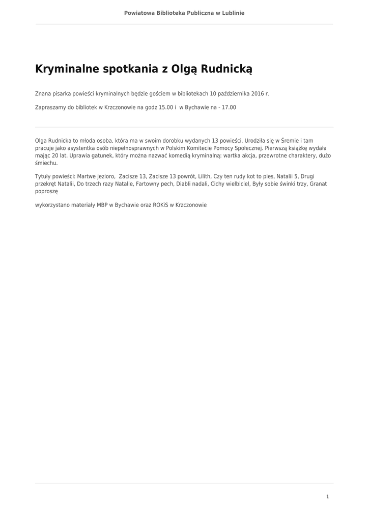 Powiatowa Biblioteka Publiczna w Lublinie Kryminalne spotkania z Olgą Rudnicką Znana pisarka powieści kryminalnych będzie gościem w bibliotekach 10 października 2016 r. Zapraszamy do bibliotek w Krzczonowie na godz 15.00 i w Bychawie na - 17.00 Olga Rudnicka to młoda osoba, która ma w swoim dorobku wydanych 13 powieści. Urodziła się w Śremie i tam pracuje jako asystentka osób niepełnosprawnych w Polskim Komitecie Pomocy Społecznej. Pierwszą książkę wydała mając 20 lat. Uprawia gatunek, który można nazwać komedią kryminalną: wartka akcja, przewrotne charaktery, dużo śmiechu. Tytuły powieści: Martwe jezioro, Zacisze 13, Zacisze 13 powrót, Lilith, Czy ten rudy kot to pies, Natalii 5, Drugi przekręt Natalii, Do trzech razy Natalie, Fartowny pech, Diabli nadali, Cichy wielbiciel, Były sobie świnki trzy, Granat poproszę wykorzystano materiały MBP w Bychawie oraz ROKiS w Krzczonowie 1