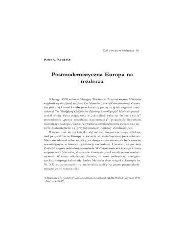 C z ł o w i e k w kulturze 16 Peter A. Redpath Postmodernistyczna Europa na rozdrożu 9 lutego 1939 roku w Marigny Théâtre w Paryżu Jacques Maritain wygłosił wykład pod tytułem Les Nouvelles Lettres (Nowa literatura). Cztery lata później Lionel Landry przełożył tę pracę na język angielski i zaty tułował The Twilight of Civilisation (Zmierzch cywilizacji)'. Maritain przed stawił w niej świat pogrążony w „aktualnej walce na śmierć i życie" prowadzonej „przez rewolucję nazistowską", pogańskie imperium miażdżące Europę. Uznał, że walka ta jest nieodzownie związana z no wym humanizmem i z przygotowaniem odnowy cywilizacyjnej . Wracam dziś do tej książki, aby od niej rozpocząć moją refleksję nad p r z y s z ł o ś c i ą Europy w świetle jej metafizycznej przeszłości. Maritain zdawał sobie sprawę, że druga wojna światowa była czasem rewolucyjnym w historii cywilizacji zachodniej. Uważał, że po niej Zachód ulegnie radykalnej przemianie. Walkę na śmierć i życie, o której w s p o m i n a ł Maritain, skutecznie kontynuował totalitaryzm marksi stowski. W nieco odmiennej formie, te same sofistyczne, neo-gnostyckie, neopogańskie siły, które Maritain dostrzegał w Europie lat 30. XX w, zaszczepiły tę śmiertelną walkę na grunt postmoderni stycznej współczesności. 2 'J. Maritain, The Twilight of Civilisation, tłum. L. Landry, Sheed & Ward, New York 1943. Ibid., s. V I I I - I V . 1 1u fêter A. Redpath Na kartach Twilight of Civilisation Maritain odkrył źródła proble m ó w współczesnego Zachodu, dochodząc do konkretnej logiki wy d a r z e ń historycznych. U t r z y m y w a ł , że ta konkretna logika wymiata wiele teorii, ponieważ są one nie do pogodzenia z p r a k t y k ą . Z braku lepszego terminu, Maritain odwołał się do neognostyckiej, neosofistycznej metafizyki współczesnego Zachodu, która wpro wadziła współczesną historię zachodnią na tory „antropocentrycznego pojęcia człowieka i kultury" czy też antropocentrycznego hu manizmu, „ h u m a n i z m u , który przez trzy ostatnie stulecia trwa nie przerwanie od czasów renesansu". Samo wyrażenie — co podkreśla au tor - nie jest do końca udane. Jednak przyznaje, że użył go „z braku lepszego terminu dla wyrażenia pojęcia, które zamyka człowieka w nim samym, separując jednocześnie od natury, łaski i Boga" . Wyrażenie Maritaina rzeczywiście nie było szczęśliwe. Przecież antropocentryczny humanizm, do którego się odniósł, był czymś więcej niż humanizmem: był czymś metafizycznym. M ó w i ą c o humanizmie antropocentrycznym, Maritain, co sam potwierdza, miał na myśli pojęcie człowieka i kultury ufundowane na fałszywej ludzkiej naturze i fałszywym ludzkim poznaniu, na wyizo lowanej ludzkiej naturze i wyizolowanym rozumie, zamkniętych w so bie, miał na myśli pojęcie, które redukuje ludzką naturę do możliwo ści czystego rozumu, stąd izoluje ludzką naturę wobec świata i wszyst kiego, co nie da się odnieść do czystego rozumu, w tym wobec jego woli i uczuć. 3 4 Według mnie, Maritaina pojęcie humanizmu antropocentryczne go obejmuje pewien rodzaj neognostyckiej i neosofistycznej metafi zyki, która rozwinęła się na Zachodzie jako jedna z pochodnych słyn nej walki sztuk, sięgającej korzeniami Uniwersytetu w Paryżu w X I I I wieku i znajdującej swą ostateczną podstawę historyczną na Zacho dzie w walce pomiędzy poezją, sofistyką i filozofią, która niegdyś przy3 4 Ibid., s. 4. Ibid. Postmodernistyczna Europa na rozdrożu 17 czyniła się do skazania na śmierć Sokratesa oraz do ucieczki Arysto telesa z A t e n . Antropocentryczny humanizm Maritaina jest r ó w n o z n a c z n y z pewnego rodzaju „neo-Protagoreizmem", konstruktem wygenero wanym politycznie przez zachodnich poetów, matematyków i logi ków, którzy przez wiele wieków walczyli ze sobą, próbując ustalić swoje sposoby myślenia jako miarę wszystkich rzeczy. Nasza histo ryczna i filozoficzna ignorancja przez całe stulecia wprowadzała nas - na Zachodzie - w błąd, iż walka ta stanowi element historii filozofii nowożytnej. W grudniu 1990 roku w Treviso we W ł o s z e c h wygłosiłem wy kład zatytułowany The New World Disorder: A Crisis of Philosophical Identity (Nowy nielad świata: kryzys tożsamości filozoficzny) podczas w a ż nego m i ę d z y n a r o d o w e g o kolokwium na temat Transition in Eastern Europe (Przemiany w Europie Wschodniej). Podczas tego kolokwium w y p o w i e d z i a ł e m kilka myśli odnośnie do współczesnej sceny kul turalnej i politycznej, do której — jak mi się zdawało - m o ż n a w spo sób jasny o d n i e ś ć poglądy Maritaina zawarte w The Twilight of Civi lisation. Mając na uwadze rok 1990, powiedziałem wtedy, że nasze kultu ralne instytucje są w poważnym nieładzie. Moglibyśmy znaleźć przy kłady tego nieporządku w języku naszego moralnego, politycznego, filozoficznego, teologicznego, naukowego i społecznego dyskursu, jak też w generalnej niezdolności ludzi parających się tzw. wolnymi za wodami co do wyjaśnienia metod własnych dyscyplin, pochodze nia ich zasad oraz uzasadnienia zasad ich działania, o ile działają. Coraz częściej na Zachodzie spotykaliśmy ludzi ignorujących kulturalny „es tablishment", ponieważ jego instytucje miały niewiele, albo nie miały nic „istotnego", do powiedzenia ludziom. A co za tym idzie, wniosły 5 Na temat gruntownej obrony tego stanowiska, zob. P.A. Redpath, Odyseja mądrości. Odfilozofii do transcendentalnej sofistyki, tłum. M. Pieczyrak, Fundacja Rozwoju Kultu ry Polskiej, Lublin 2003; oraz tenże, Masquerade of the Dream Walkers: Prophetic The ologyfrom the Cartesians to Hegel, Editions Rodopi, B. V., Amsterdam & Atlanta 1997. 1 18 Peter A. Redpath niewiele albo nie wniosły niczego do ludzkiego życia w zakresie praw dziwej mądrości. Zwykli ludzie - dodałem — zdają sobie sprawę, że to z