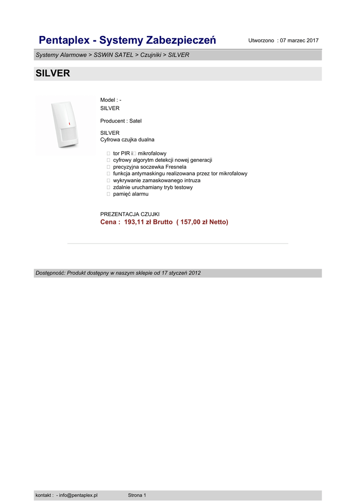 Pentaplex - Systemy Zabezpieczeń Systemy Alarmowe > SSWiN SATEL > Czujniki > SILVER SILVER Model : SILVER Producent : Satel SILVER Cyfrowa czujka dualna � tor PIR i mikrofalowy � cyfrowy algorytm detekcji nowej generacji � precyzyjna soczewka Fresnela � funkcja antymaskingu realizowana przez tor mikrofalowy � wykrywanie zamaskowanego intruza � zdalnie uruchamiany tryb testowy � pamięć alarmu PREZENTACJA CZUJKI Cena : 193,11 zł Brutto ( 157,00 zł Netto) Dostępność: Produkt dostępny w naszym sklepie od 17 styczeń 2012 kontakt : - [email protected] Strona 1 Utworzono : 07 marzec 2017