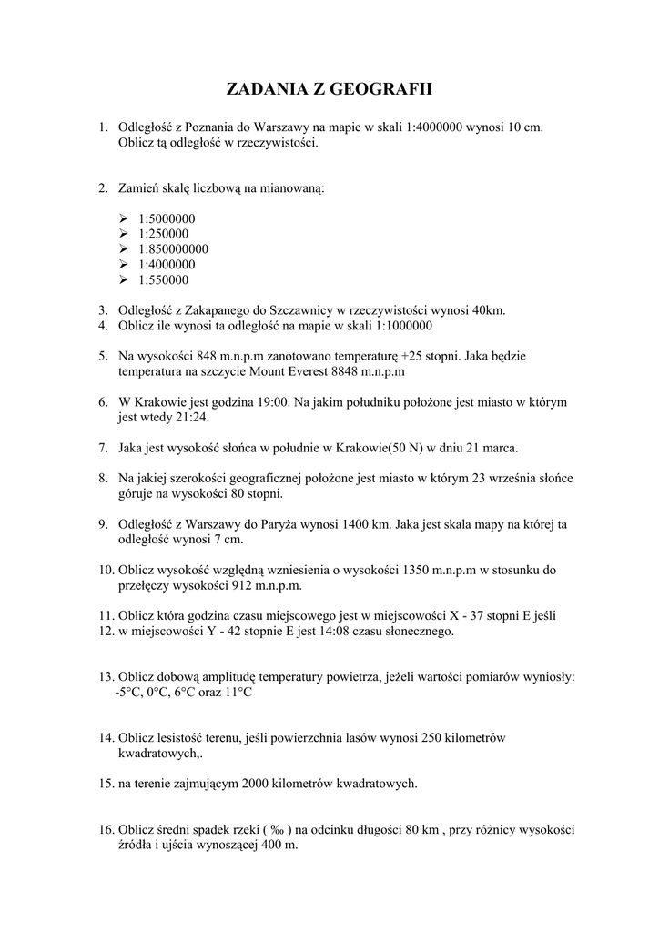 ZADANIA Z GEOGRAFII 1. Odległość z Poznania do Warszawy na mapie w skali 1:4000000 wynosi 10 cm. Oblicz tą odległość w rzeczywistości. 2. Zamień skalę liczbową na mianowaną: 1:5000000 1:250000 1:850000000 1:4000000 1:550000 3. Odległość z Zakapanego do Szczawnicy w rzeczywistości wynosi 40km. 4. Oblicz ile wynosi ta odległość na mapie w skali 1:1000000 5. Na wysokości 848 m.n.p.m zanotowano temperaturę +25 stopni. Jaka będzie temperatura na szczycie Mount Everest 8848 m.n.p.m 6. W Krakowie jest godzina 19:00. Na jakim południku położone jest miasto w którym jest wtedy 21:24. 7. Jaka jest wysokość słońca w południe w Krakowie(50 N) w dniu 21 marca. 8. Na jakiej szerokości geograficznej położone jest miasto w którym 23 września słońce góruje na wysokości 80 stopni. 9. Odległość z Warszawy do Paryża wynosi 1400 km. Jaka jest skala mapy na której ta odległość wynosi 7 cm. 10. Oblicz wysokość względną wzniesienia o wysokości 1350 m.n.p.m w stosunku do przełęczy wysokości 912 m.n.p.m. 11. Oblicz która godzina czasu miejscowego jest w miejscowości X - 37 stopni E jeśli 12. w miejscowości Y - 42 stopnie E jest 14:08 czasu słonecznego. 13. Oblicz dobową amplitudę temperatury powietrza, jeżeli wartości pomiarów wyniosły: -5°C, 0°C, 6°C oraz 11°C 14. Oblicz lesistość terenu, jeśli powierzchnia lasów wynosi 250 kilometrów kwadratowych,. 15. na terenie zajmującym 2000 kilometrów kwadratowych. 16. Oblicz średni spadek rzeki ( ‰ ) na odcinku długości 80 km , przy różnicy wysokości źródła i ujścia wynoszącej 400 m. 17. Oblicz wartość przyrostu rzeczywistego (tyś.) w danym roku wiedząc , że z kraju wyemigrowało 50 tyś. osób, zmarło 0,4 mln urodziło się 670 tys, a przybyło zza granicy 42 tys. 18. Oblicz średnią gęstość zaludnienia , jeśli na obszarze 400 tys. kilometrów kwadratowych żyje 80 mln osób. 19. Oblicz stopę bezrobocia , jeśli liczba ludności zawodowo czynnej wynosi 50 tys, osób, a bezrobotnych jest 10 tys. 20. Oblicz wskaźnik urbanizacji Jeśli 24 mln osób mieszka w miastach w państwie o liczbie ludności wynoszącej 30 mln. 21. Oblicz odległość rzeczywistą Jeśli na mapie w skali l : 25000 wynosi ona 15 cm 22. Oblicz powierzchnię rzeczywistą, jeśli na mapie w skali l : 300000 wynosi ona 4,5 centymetrów kwadratowych. 23. Oblicz stopę przyrostu naturalnego ( ‰), wiedząc , że przyrost naturalny wyniósł w ciągu roku 100 tys. osób , a na początku roku było 20 mln o