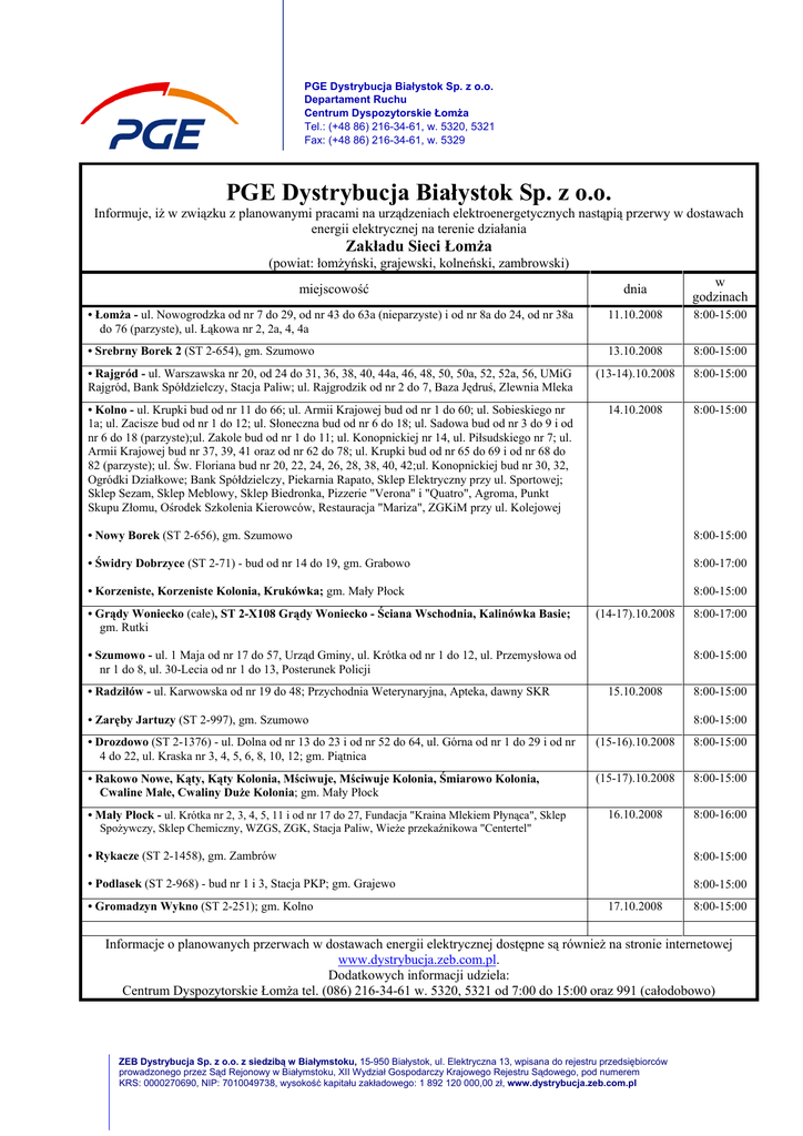 PGE Dystrybucja Białystok Sp. z o.o. Departament Ruchu Centrum Dyspozytorskie Łomża Tel.: (+48 86) 216-34-61, w. 5320, 5321 Fax: (+48 86) 216-34-61, w. 5329 PGE Dystrybucja Białystok Sp. z o.o. Informuje, iż w związku z planowanymi pracami na urządzeniach elektroenergetycznych nastąpią przerwy w dostawach energii elektrycznej na terenie działania Zakładu Sieci Łomża (powiat: łomżyński, grajewski, kolneński, zambrowski) miejscowość dnia w godzinach • Łomża - ul. Nowogrodzka od nr 7 do 29, od nr 43 do 63a (nieparzyste) i od nr 8a do 24, od nr 38a do 76 (parzyste), ul. Łąkowa nr 2, 2a, 4, 4a 11.10.2008 8:00-15:00 • Srebrny Borek 2 (ST 2-654), gm. Szumowo 13.10.2008 8:00-15:00 • Rajgród - ul. Warszawska nr 20, od 24 do 31, 36, 38, 40, 44a, 46, 48, 50, 50a, 52, 52a, 56, UMiG Rajgród, Bank Spółdzielczy, Stacja Paliw; ul. Rajgrodzik od nr 2 do 7, Baza Jędruś, Zlewnia Mleka (13-14).10.2008 8:00-15:00 • Kolno - ul. Krupki bud od nr 11 do 66; ul. Armii Krajowej bud od nr 1 do 60; ul. Sobieskiego nr 1a; ul. Zacisze bud od nr 1 do 12; ul. Słoneczna bud od nr 6 do 18; ul. Sadowa bud od nr 3 do 9 i od nr 6 do 18 (parzyste);ul. Zakole bud od nr 1 do 11; ul. Konopnickiej nr 14, ul. Piłsudskiego nr 7; ul. Armii Krajowej bud nr 37, 39, 41 oraz od nr 62 do 78; ul. Krupki bud od nr 65 do 69 i od nr 68 do 82 (parzyste); ul. Św. Floriana bud nr 20, 22, 24, 26, 28, 38, 40, 42;ul. Konopnickiej bud nr 30, 32, Ogródki Działkowe; Bank Spółdzielczy, Piekarnia Rapato, Sklep Elektryczny przy ul. Sportowej; Sklep Sezam, Sklep Meblowy, Sklep Biedronka, Pizzerie "Verona" i "Quatro", Agroma, Punkt Skupu Złomu, Ośrodek Szkolenia Kierowców, Restauracja "Mariza", ZGKiM przy ul. Kolejowej 14.10.2008 8:00-15:00 • Nowy Borek (ST 2-656), gm. Szumowo 8:00-15:00 • Świdry Dobrzyce (ST 2-71) - bud od nr 14 do 19, gm. Grabowo 8:00-17:00 • Korzeniste, Korzeniste Kolonia, Krukówka; gm. Mały Płock 8:00-15:00 • Grądy Woniecko (całe), ST 2-X108 Grądy Woniecko - Ściana Wschodnia, Kalinówka Basie; gm. Rutki (14-17).10.2008 • Szumowo - ul. 1 Maja od nr 17 do 57, Urząd Gminy, ul. Krótka od nr 1 do 12, ul. Przemysłowa od nr 1 do 8, ul. 30-Lecia od nr 1 do 13, Posterunek Policji • Radziłów - ul. Karwowska od nr 19 do 48; Przychodnia Weterynaryjna, Apteka, dawny SKR 8:00-17:00 8:00-15:00 15.10.2008 • Zaręby Jartuzy (ST 2-997), gm. Szumowo 8:00-15:00 8:00-15:00 • Drozdowo (ST 2-1376) - ul. Dolna od nr 13 do 23 i od nr 52 do 64, ul. Górna od nr 1 do 29 i od nr 4 do 22, ul. Kraska nr 3, 4, 5, 6, 8, 10, 12; gm. Piątnica (15-16).10.2008 8:00-15:00 • Rakowo Nowe, Kąty, Kąty Kolonia, Mściwuje, Mściwuje Kolonia, Śmiarowo Kolonia, Cwaline Małe, Cwaliny Duże Kolonia; gm. Mały Płock (15-17).10.2008 8:00-15:00 16.10.2008 8:00-16:00 • Mały Płock - ul. Krótka nr 2, 3, 4, 5, 11 i od nr 17 do 27, Fundacja "Kraina Mlekiem Płynąca", Sklep Spożywczy, Sklep Chemiczny, WZGS, ZGK, Stacja Paliw, Wieże przekaźnikowa "Centertel" • Rykacze (ST 2-1458), gm. Zambrów 8:00-15:00 • Podlasek (ST 2-968) - bud nr 1 i 3, Stacja PKP; gm. Grajewo 8:00-15:00 • Gromadzyn Wykno (ST 2-251); gm. Kolno 17.10.2008 8:00-15:00 Informacje o planowanych przerwach w dostawach energii elektrycznej dostępne są również na stronie internetowej www.dystrybucja.zeb.com.pl. Dodatkowych informacji udziela: Centrum Dyspozytorskie Łomża tel. (086) 216-34-61 w. 5320, 5321 od 7:00 do 15:00 oraz 991 (całodobowo) ZEB Dystrybucja Sp. z o.o. z siedzibą w Białymstoku, 15-950 Białystok, ul. Elektryczna 13, wpisana do rejestru przedsiębiorców prowadzonego przez Sąd Rejonowy w Białymstoku, XII Wydział Gospodarczy Krajowego Rejestru Sądowego, pod numerem KRS: 0000270690, NIP: 7010049738, wysokość kapitału zakładowego: 1 892 120 000,00 zł, www.dystrybucja.zeb.com.pl