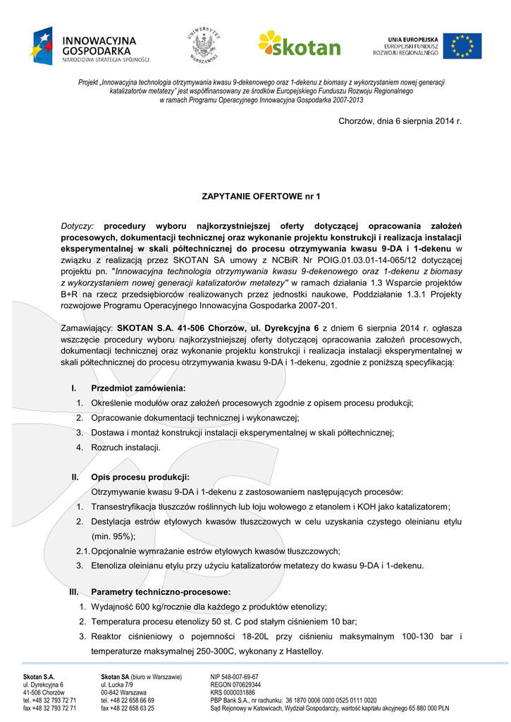 Projekt „Innowacyjna technologia otrzymywania kwasu 9-dekenowego oraz 1-dekenu z biomasy z wykorzystaniem nowej generacji katalizatorów metatezy” jest współfinansowany ze środków Europejskiego Funduszu Rozwoju Regionalnego w ramach Programu Operacyjnego Innowacyjna Gospodarka 2007-2013 www.skotansa.pl Chorzów, dnia 6 sierpnia 2014 r. ZAPYTANIE OFERTOWE nr 1 Dotyczy: procedury wyboru najkorzystniejszej oferty dotyczącej opracowania założeń procesowych, dokumentacji technicznej oraz wykonanie projektu konstrukcji i realizacja instalacji eksperymentalnej w skali półtechnicznej do procesu otrzymywania kwasu 9-DA i 1-dekenu w związku z realizacją przez SKOTAN SA umowy z NCBiR Nr POIG.01.03.01-14-065/12 dotyczącej projektu pn. "Innowacyjna technologia otrzymywania kwasu 9-dekenowego oraz 1-dekenu z biomasy z wykorzystaniem nowej generacji katalizatorów metatezy" w ramach działania 1.3 Wsparcie projektów B+R na rzecz przedsiębiorców realizowanych przez jednostki naukowe, Poddziałanie 1.3.1 Projekty rozwojowe Programu Operacyjnego Innowacyjna Gospodarka 2007-201. Zamawiający: SKOTAN S.A. 41-506 Chorzów, ul. Dyrekcyjna 6 z dniem 6 sierpnia 2014 r. ogłasza wszczęcie procedury wyboru najkorzystniejszej oferty dotyczącej opracowania założeń procesowych, dokumentacji technicznej oraz wykonanie projektu konstrukcji i realizacja instalacji eksperymentalnej w skali półtechnicznej do procesu otrzymywania kwasu 9-DA i 1-dekenu, zgodnie z poniższą specyfikacją: I. Przedmiot zamówienia: 1. Określenie modułów oraz założeń procesowych zgodnie z opisem procesu produkcji; 2. Opracowanie dokumentacji technicznej i wykonawczej; 3. Dostawa i montaż konstrukcji instalacji eksperymentalnej w skali półtechnicznej; 4. Rozruch instalacji. II. Opis procesu produkcji: Otrzymywanie kwasu 9-DA i 1-dekenu z zastosowaniem następujących procesów: 1. Transestryfikacja tłuszczów roślinnych lub łoju wołowego z etanolem i KOH jako katalizatorem; 2. Destylacja estrów etylowych kwasów tłuszczowych w celu uzyskania czystego oleinianu etylu (min. 95%); 2.1. Opcjonalnie wymrażanie estrów etylowych kwasów tłuszczowych; 3. Etenoliza oleinianu etylu przy użyciu katalizatorów metatezy do kwasu 9-DA i 1-dekenu. III. Parametry techniczno-procesowe: 1. Wydajność 600 kg/rocznie dla każdego z produktów etenolizy; 2. Temperatura procesu etenolizy 50 st. C pod stałym ciśnieniem 10 bar; 3. Reaktor ciśnieniowy o pojemności 18-20L przy ciśnieniu maksymalnym 100-130 bar i temperaturze maksymalnej 250-300C, wykonany z Hastelloy. Skotan S.A. ul. Dyrekcyjna 6 41-506 Chorzów tel. +48 32 793 72 71 fax +48 32 793 72 71 Skotan SA (biuro w Warszawie) ul. Łucka 7/9 00-842 Warszawa tel. +48 22 658 66 69 fax +48 22 658 63 25 NIP 548-007-69-67 REGON 070629344 KRS 0000031886 PBP Bank S.A., nr rachunku: 36 1870 0006 0000 0525 0111 0020 Sąd Rejonowy w Katowicach, Wydział Gospodarczy, wartość kapitału akcyjnego 65 880 000 PLN Projekt „Innowacyjna technologia otrzymywania kwasu 9-dekenowego oraz 1-dekenu z biomasy z wykorzystaniem nowej generacji katalizatorów metatezy” jest współfinansowany ze środków Europejskiego Funduszu Rozwoju Regionalnego w ramach Programu Operacyjnego Innowacyjna Gospodarka 2007-2013 www.skotansa.pl IV. Termin i miejsce realizacji zamówienia: 1. Realizacja całości zamówienia powinna nastąpić nie później niż do dnia 30 listopada 2014 r. 2. Miejsce realizacji zamówienia: ul. Łukasiewicza 2, 43-502 Czechowice-Dziedzice. V. Ocena oferty: Zamawiający dokona wyboru najkorzystniejszej oferty w oparciu o następujące kryteria: 1. Łączna oferowana cena [PLN] (waga kryterium – 60%) 2. Doświadczenia Oferenta w przedmiocie umowy (waga kryterium – 30%) 3. Termin wykonania (waga kryterium – 10%) 1.1. Kryterium nr 1 – cena przedstawiona w ofercie będzie oceniana zgodnie z zależnością: P1 = 100 * Cn / Cr * 0,60 gdzie: P1 – liczba punktów w kryterium 1 przyznanych rozpatrywanej ofercie 100 – maksymalna liczba punktów Cn – najniższa łączna oferowana cena w przetargu Cr – łączna cena rozpatrywanej oferty 0,60 – waga kryterium Maksymalną liczbę punktów 60 otrzyma najniższa łączna oferowana cena. 2.1. Kryterium nr 2 – Doświadczenie Oferenta w przedmiocie Umowy przedstawione w ofercie będzie oceniane w oparciu o następujące parametry: a) Załączenie dowodów (dokumentacji/referencji) potwierdzających pełnienie funkcji generalnego wykonawcy kompletnych instalacji chemicznych o łącznej wartości min. 5.000.000,00 zł netto. Oferenci mogą przedłożyć kopie dokumentów wskazujących zakres i wartość dotychczas realizowanych instalacji. Maksymalną liczbę punktów 30 otrzyma Oferent, który przedstawi najwięcej potwierdzających dokumentów/referencji. 3.1. Kryterium nr 3 – Termin wykonania: Maksymalną liczbę punktów 10 otrzyma najkrótszy oferowany niezbędny czas realizacji kompleksowej instalacji. Maksymalny czas realizacji zamówienia 30 listopada 2014 r. VI. Kontakt z Oferentami: Pytania w formie pisemnej prosimy kierować na adres mailowy: [email protected] do dnia 14.08.2014 r. do godz. 12.00, podając numer zapytania w tytule wiadomości. Skotan S.A. ul. Dyrekcyjna 6 41-506 Chorzów tel. +48 32 793 72 71 fax +48 32 793 72 71 Skotan SA (biuro w Warszawie) ul. Łucka 7/9 00-842 Warszawa tel. +48 22 658 66 69 fax +48 22 658 63 25 NIP 548-007-69-67 REGON 070629344 KRS 0000031886 PBP Bank S.A., nr rachunku: 36 1870 0006 0000 0525 0111 0020 Sąd Rejonowy w Katowicach, Wydział Gospodarczy, wartość kapitału akcyjnego 65 880 000 PLN Projekt „Innowacyjna technologia otrzymywania kwasu 9-dekenowego oraz 1-dekenu z biomasy z wykorzystaniem nowej generacji katalizatorów metatezy” jest współfinansowany ze środków Europejskiego Funduszu Rozwoju Regionalnego w ramach Programu Operacyjnego Innowacyjna Gospodarka 2007-2013 www.skotansa.pl VII. Wybór najkorzystniejszej oferty: 1. Oferty zawierające: a) 