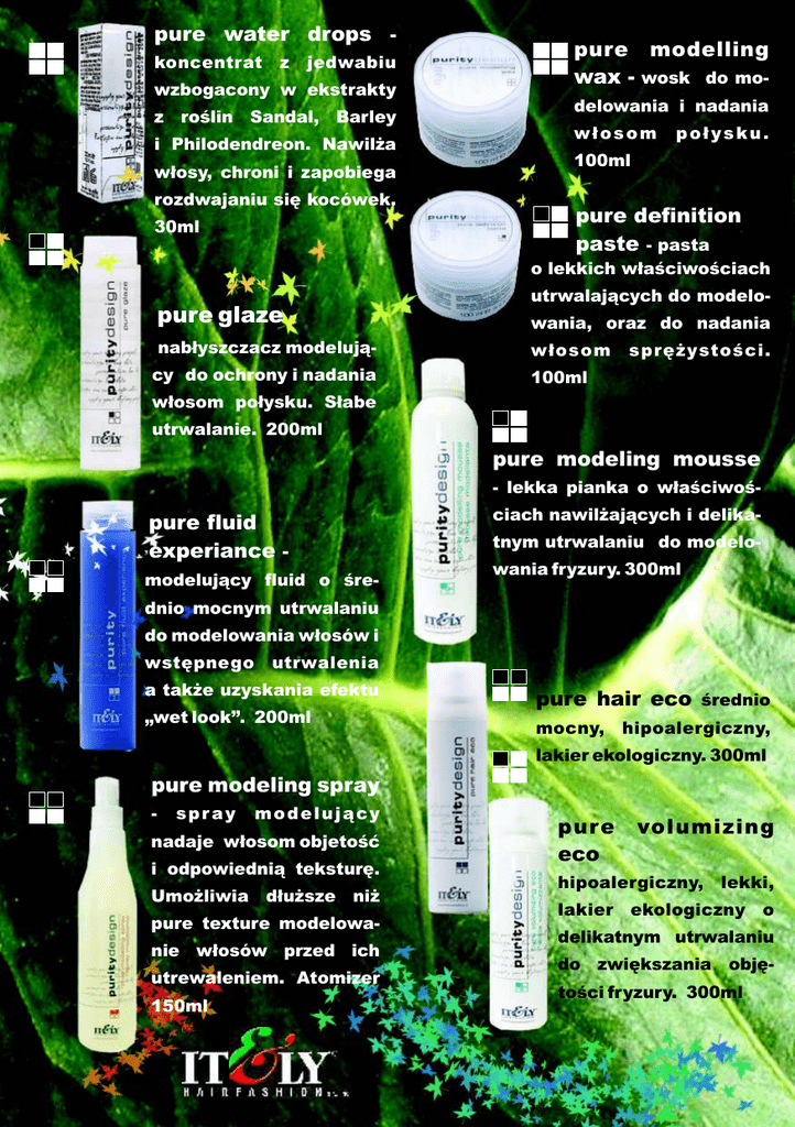 pure water drops koncentrat z jedwabiu wzbogacony w ekstrakty z roślin Sandal, Barley i Philodendreon. Nawilża włosy, chroni i zapobiega rozdwajaniu się kocówek. 30ml pure modelling wax - wosk do modelowania i nadania włosom połysku. 100ml pure definition paste - pasta o lekkich właściwościach utrwalających do modelo- pure glaze wania, oraz do nadania nabłyszczacz modelujący do ochrony i nadania włosom sprężystości. 100ml włosom połysku. Słabe utrwalanie. 200ml pure modeling mousse - lekka pianka o właściwościach nawilżających i delika- pure fluid experiance - tnym utrwalaniu do modelo- modelujący fluid o śre- wania fryzury. 300ml dnio mocnym utrwalaniu do modelowania włosów i wstępnego utrwalenia a także uzyskania efektu „wet look”. 200ml pure hair eco średnio mocny, hipoalergiczny, lakier ekologiczny. 300ml pure modeling spray - spray modelujący nadaje włosom objetość i odpowiednią teksturę. Umożliwia dłuższe niż pure texture modelowanie włosów przed ich utrewaleniem. Atomizer 150ml pur e eco volumizing hipoalergiczny, lakier lekki, ekologiczny o delikatnym utrwalaniu do zwiększania obję- tości fryzury. 300ml