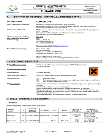 1. KARTY CHARAKTERYSTYKI Data utworzenia: Rozporządzenie WE 1907/2006 - załącznik II zmieniony 2013-01-01 FUMAGRI OPP Data ostatniej poprawki: 2013-01-01 IDENTYFIKACJA MIESZANINY I IDENTYFIKACJA PRZEDSIĘBIORSTWA Identyfikator produktu : FUMAGRI OPP Znane zastosowania mieszaniny : Dezynfekcja bakteriobójcza i grzybobójcza drogą powietrzną pomieszczeń, urządzeń do hodowli i transportu, wylęgarni i pustych silosów, pomieszczeń do przechowywania i transportu paszy dla zwierząt. zastosowania niezalecane : UE: Produkt nie powinien być stosowany do celów fitofarmaceutycznych objętych rozporządzeniem WE nr 1107/2009 Stosować pod nieobecność osób i zwierząt oraz produktów żywnościowych Zarezerwowane do użytku profesjonalnego Informacje dotyczące: dostawcy karty charakterystyk produktu niebezpiecznego : Producent: LCB 71260 LA SALLE (F) Tel.:+33 (0)3.85.36.81.00 Faks: +33 (0)3.85.36.01.28 Informacje na temat karty: [email protected] Numer telefonu alarmowego : tel. na ratunek : 999 Centrum Toksykologii Gdańsk : tel. na ratunek +48586820404 Warszawa : tel. na ratunek +48607218174 ORFILA (INRS): +33 (0)1.45.42.59.59 Krajowa baza produktów i składów: +33 (0)3.83.32.36.36 (24h/24h) 2 – IDENTYFIKACJA ZAGROŻEŃ 2.1 Klasyfikacja mieszaniny Produkt jest sklasyfikowany w rozumieniu dyrektywy 1999/45/WE ze zmianami Xi: Produkt drażniący 2.2 Elementy oznakowania Symbol zagrożenia : Zwroty określające zagrożenie: Zasady ostrożności R36/37/38: Działa drażniąco na oczy, drogi oddechowe i skórę : 2.3 Inne zagrożenia Xi: Produkt drażniący S23: S26: S37: nie wdychać dymu Zanieczyszczone oczy przemyć natychmiast dużą ilością wody i zasięgnąć porady lekarza Nosić odpowiednie rękawice ochronne Podczas reakcji, uwalnianie tlenku azotu, dwutlenku azotu, tlenku węgla, kwasu cyjanowodorowego i amoniaku. Proszek może podtrzymywać palenie podczas pożaru. Ryzyko poparzeń w przypadku wyjmowania dawek przed całkowitym schłodzeniem. W przypadku rozproszenia pyłu w środowisku wodnym, ryzyko szybkich lokalnych zniszczeń fauny. W przypadku stosowania w pomieszczeniu, w którym znajduje się akwarium lub otwarty basen do hodowli ryb, ryzyko zatrucia ryb. W przypadku stosowania w obecności roślin zielonych, ryzyko fitotoksyczności. 3 - SKŁAD / INFORMACJA O SKŁADNIKACH 3.2 Mieszaniny Substancje stanowiące zagrożenie dla zdrowia lub środowiska Elementy składowe 2-fenylfenol Azotan amonu % Nr rejestracji Rozp. WE 1907/2006 NR INDEKSU NR CE NR CAS Klasyfikacja wg 67/548/EWG. 20 01-2119511183-53 604-020-00-6 201-993-5 90-43-7 Xi R36/37/38 N R50 ≥ 20 01-2119490981-27 - 229-347-8 6484-52-2 Xi R36 O R8 REF.FUOPP-F130101V07 P C&D-F011 FDS Wersja z 101201 FDS/ FUOPP-PL Wersja: 01 Klasyfikacja CLO Rozp. WE 1272/2008 skin irrit. 2 H315 Eye irrit . 2 H 319 STOT SE 3 H335 aquatic acute 1 H400 ox. Solid 3 H272 eye irr. 2 H319 1/8 KARTY CHARAKTERYSTYKI Data utworzenia: Rozporządzenie WE 1907/2006 - załącznik II zmieniony 2013-01-01 FUMAGRI OPP Data ostatniej poprawki: 2013-01-01 Substancje posiadające graniczne wartości narażenia zawodowego: brak Substancje PBT lub vPvB : brak Substancje objęte aneksem XIV : brak Kompletny opis zwrotów R i H : patrz rubryka 16 4 – ŚRODKI PIERWSZEJ POMOCY 4.1 Opis środków pierwszej pomocy Pomoc natychmiastowa : Jeżeli poszkodowany jest przytomny, wezwać ratownika znajdującego się na miejscu, ułożyć poszkodowanego w pozycji bezpiecznej bocznej i nadzorować oddychanie. W przypadku wdychania oparów : Stosować środki ochrony indywidualnej zgodnie z §8 i ewakuować poszkodowanego z lokalu z oparami. Pozostawić go na świeżym powietrzu. W przypadku przedłużonego podrażnienia dróg oddechowych, wezwać lekarza lub ratownika medycznego, którzy podejmą decyzję co do dalszego postępowania. W przypadku kontaktu z proszkiem ze skórą : Umyć wodą, zdjąć zabrudzone ubrania i wyprać je W przypadku kontaktu z oczami : Natychmiast umyć oczy płynem do płukania oczu lub, w razie jego braku wodą pitną (przez 15 minut); jeżeli wystąpi trwające ponad godzinę podrażnienie, ból lub zakłócenia widzenia, wezwać okulistę W przypadku połknięcia : Nie podawać napojów, jedzenia ani nie prowokować wymiotów. Wezwać lekarza lub ratownika medycznego, którzy podejmą decyzję co do dalszego postępowania. W przypadku poparzenia : W przypadku poparzenia powierzchownego (zaczerwienienie), schładzać ranę pod bezpośrednim strumieniem zimnej wody przez 15 min. 4.2 Najważniejsze ostre i opóźnione objawy oraz skutki narażenia Objawy i skutki ostre W przypadku wdychania oparów : W przypadku przedłużonego narażenia i/lub znacznego przedawkowania: podrażnienie błon śluzowych dróg oddechowych, kaszel, utrudnione oddychanie przy wysiłku, tachykardia; nudności; zawroty głowy W przypadku wdychania proszku : Kaszel; utrudnione oddychanie W przypadku kontaktu z oczami : Opary: podrażnienie błon śluzowych oczu, łzawienie, a nawet zapalenie spojówek Proszek: podrażnienie, łzawienie W przypadku połknięcia dużej ilości : Podrażnienie błony śluzowej ust i przewodu pokarmowego, wymioty, biegunka, bóle brzucha, zaburzenia trawienia W przypadku kontaktu ze skórą : Może powodować wysuszenie skóry w przypadku przedłużonego kontaktu: Objawy i skutki opóźnione : Przewlekłe i przedłużone narażenie na opary może ułatwiać pojawienie się rozedmy. 4.3 Wymagana pomoc medyczna natychmiastowa i szczególne leczenie Pomoc natychmiastowa: Leczyć objawowo. Przeciwwskazania: niedostępne Odtrutka: niedostępna Wyposażenie pomieszczeń: Zalecana oczomyjka i przenośny natrysk w miejscu stosowania REF.FUOPP-F130101V07 P C&D-F011 FDS Wersja z 101201 FDS/ FUOPP-PL Wersja: 01 2/8 KARTY CHARAKTERYSTYKI Data utworzenia: Rozporządzenie WE 1907/2006 - załącznik II zmieniony 2013-01-01 FUMAGRI OPP Data ostatniej poprawki: 2013-01-01 5 – POSTĘPOWANIE W PRZYPADKU POŻARU Odpowiednie środki gaśnic