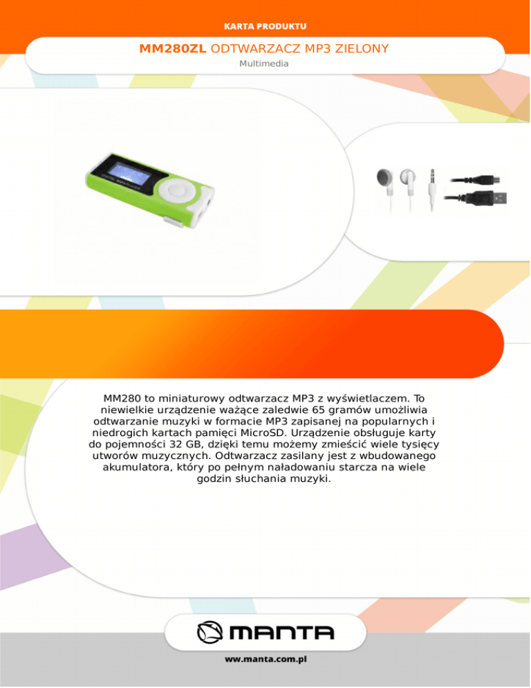 MM280ZLODTWARZACZMP3ZIELONY Multimedia MM280tominiaturowyodtwarzaczMP3zwyświetlaczem.To niewielkieurządzenieważącezaledwie65gramówumożliwia odtwarzaniemuzykiwformacieMP3zapisanejnapopularnychi niedrogichkartachpamięciMicroSD.Urządzenieobsługujekarty dopojemności32GB,dziękitemumożemyzmieścićwieletysięcy utworówmuzycznych.Odtwarzaczzasilanyjestzwbudowanego akumulatora,którypopełnymnaładowaniustarczanawiele godzinsłuchaniamuzyki. MM280ZLODTWARZACZMP3ZIELONY Multimedia Specyfikacja Odtwarzaczwyposażonyjestklipsumożliwiający zamocowaniedopaskalubdokieszeniubrania, dziękitemuorazniewielkiejwadze,MM280może byćidelanymkompanemcodziennychtreningów, czywieczornegojoggingu.Dodatkowoodtwarzacz wyposażonyjestwminilatarkę,dziękiktórej przyświecimysobie,gdyprzedwcześniezgaśnie światłonaschodach,alboniemożemyodczytać rozkładujazdynaprzystankuautobusowym. Zasilanie akumulator Gniazdokartpamięci MicroSD Złącza MiniUSB,słuchawkowe Pamięćwbudowana Brak OdtwarzanieMP3 TAK RadioFM TAK OdtwarzaczMP3MM280dostępnyjestwpięciu atrakcyjnychkolorach:czarnym,niebieskim, zielonym,różowym,szarym.Wkompleciez urządzeniemużytkownikotrzymujesłuchawki douszneorazprzewódUSBumożliwiający ładowanieurządzeniaitransmisjędanych. http://www.manta.com.pl/pl/mm280zl EAN:5902510604509