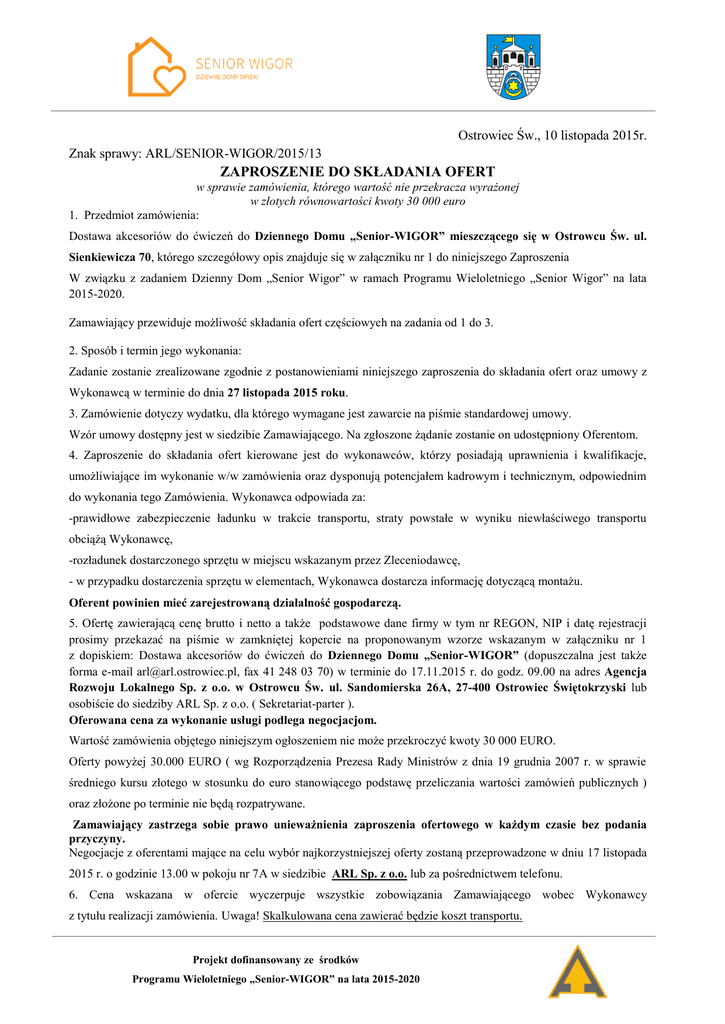 Ostrowiec Św., 10 listopada 2015r. Znak sprawy: ARL/SENIOR-WIGOR/2015/13 ZAPROSZENIE DO SKŁADANIA OFERT w sprawie zamówienia, którego wartość nie przekracza wyrażonej w złotych równowartości kwoty 30 000 euro 1. Przedmiot zamówienia: Dostawa akcesoriów do ćwiczeń do Dziennego Domu „Senior-WIGOR” mieszczącego się w Ostrowcu Św. ul. Sienkiewicza 70, którego szczegółowy opis znajduje się w załączniku nr 1 do niniejszego Zaproszenia W związku z zadaniem Dzienny Dom „Senior Wigor” w ramach Programu Wieloletniego „Senior Wigor” na lata 2015-2020. Zamawiający przewiduje możliwość składania ofert częściowych na zadania od 1 do 3. 2. Sposób i termin jego wykonania: Zadanie zostanie zrealizowane zgodnie z postanowieniami niniejszego zaproszenia do składania ofert oraz umowy z Wykonawcą w terminie do dnia 27 listopada 2015 roku. 3. Zamówienie dotyczy wydatku, dla którego wymagane jest zawarcie na piśmie standardowej umowy. Wzór umowy dostępny jest w siedzibie Zamawiającego. Na zgłoszone żądanie zostanie on udostępniony Oferentom. 4. Zaproszenie do składania ofert kierowane jest do wykonawców, którzy posiadają uprawnienia i kwalifikacje, umożliwiające im wykonanie w/w zamówienia oraz dysponują potencjałem kadrowym i technicznym, odpowiednim do wykonania tego Zamówienia. Wykonawca odpowiada za: -prawidłowe zabezpieczenie ładunku w trakcie transportu, straty powstałe w wyniku niewłaściwego transportu obciążą Wykonawcę, -rozładunek dostarczonego sprzętu w miejscu wskazanym przez Zleceniodawcę, - w przypadku dostarczenia sprzętu w elementach, Wykonawca dostarcza informację dotyczącą montażu. Oferent powinien mieć zarejestrowaną działalność gospodarczą. 5. Ofertę zawierającą cenę brutto i netto a także podstawowe dane firmy w tym nr REGON, NIP i datę rejestracji prosimy przekazać na piśmie w zamkniętej kopercie na proponowanym wzorze wskazanym w załączniku nr 1 z dopiskiem: Dostawa akcesoriów do ćwiczeń do Dziennego Domu „Senior-WIGOR” (dopuszczalna jest także forma e-mail [email protected], fax 41 248 03 70) w terminie do 17.11.2015 r. do godz. 09.00 na adres Agencja Rozwoju Lokalnego Sp. z o.o. w Ostrowcu Św. ul. Sandomierska 26A, 27-400 Ostrowiec Świętokrzyski lub osobiście do siedziby ARL Sp. z o.o. ( Sekretariat-parter ). Oferowana cena za wykonanie usługi podlega negocjacjom. Wartość zamówienia objętego niniejszym ogłoszeniem nie może przekroczyć kwoty 30 000 EURO. Oferty powyżej 30.000 EURO ( wg Rozporządzenia Prezesa Rady Ministrów z dnia 19 grudnia 2007 r. w sprawie średniego kursu złotego w stosunku do euro stanowiącego podstawę przeliczania wartości zamówień publicznych ) oraz złożone po terminie nie będą rozpatrywane. Zamawiający zastrzega sobie prawo unieważnienia zaproszenia ofertowego w każdym czasie bez podania przyczyny. Negocjacje z oferentami mające na celu wybór najkorzystniejszej oferty zostaną przeprowadzone w dniu 17 listopada 2015 r. o godzinie 13.00 w pokoju nr 7A w siedzibie ARL Sp. z o.o. lub za pośrednictwem telefonu. 6. Cena wskazana w ofercie wyczerpuje wszystkie zobowiązania Zamawiającego wobec Wykonawcy z tytułu realizacji zamówienia. Uwaga! Skalkulowana cena zawierać będzie koszt transportu. Projekt dofinansowany ze środków Programu Wieloletniego „Senior-WIGOR” na lata 2015-2020 7. Kryterium oceny oferty: CENA – 100 % 8. Ewentualne wyjaśnienia uzyskać można kontaktując się z Zamawiającym pod nr telefonu : 41 2480370 – Pani Karolina Kargulewicz – Mrozińska- lub osobiście pokój nr 7A, przed upływem terminu składania ofert. 9. Realizacja zamówienia zostanie zlecona wykonawcy, który zaoferował ostatecznie najkorzystniejsze warunki realizacji Zamówienia i przyjął wymagania określone w Zaproszeniu do składania ofert oraz zgodził się na zawarcie pisemnej umowy. 10. Zamawiający zastrzega możliwość udzielenia kolejnego zamówienia do wysokości 50% wartości zamówienia określonego w umowie z Wykonawcą w tym samym roku kalendarzowym, jeżeli zachodzi konieczność udzielenia zamówienia tożsamego z uprzednio udzielonym zamówieniem, a udzielenie zamówienia w ten sposób jest z korzyścią dla Zamawiającego. Prezes Zarządu Magdalena Salwerowicz Projekt dofinansowany ze środków Programu Wieloletniego „Senior-WIGOR” na lata 2015-2020 Nr zadania L.P NAZWA SZACUNKOWA LICZBA OPIS Zadanie 1 1. Materac składany 2częściowy 2 Dwuczęściowy, składany materac do rehabilitacji i masażu; -Kolor: np. niebieski; -Wymiary minimum: 170x65x5 cm -Wymiary po złożeniu 85x65x10 cm -Waga 3,5 kg -Materiał: Pianka poliuretanowa średniej twardości i wysokiej jakości skaj. -Powierzchnia odporna na działanie preparatów bakteriobójczych. Zadanie 2 2. Kijki do Nordic Walking – komplet (2 szt.) 6 Parametry: Jednostkowa cena netto -materiał aluminium -grot: stal -rękojeść: tworzywo syntetyczne+ korek -1-stopniowa regulacja (2 segmenty) -długość kijów po całkowitym złożeniu ok.83cm -długość kijów po rozłożeniu min.115 cm, max. 135 cm Producent Axersport lub równoważny Projekt dofinansowany ze środków Programu Wieloletniego „Senior-WIGOR” na lata 2015-2020 Jednostkowa cena brutto Łączna cena netto Łączna cena brutto 3. Piłka lekarska 1kg 1 Materiał: tworzywo syntetyczne odporne na ścieranie, powierzchnia antypoślizgowa ; Waga 0,5 kg 4. Piłka lekarska 0,5 kg 4 Materiał: tworzywo syntetyczne odporne na ścieranie , powierzchnia antypoślizgowa ; Waga 1 kg 5. Piłeczka żelowa z kolcami 5 5 Piłka żelowa z kolcami; średnica nim. 5 cm; kolor: dowolny Producent SANITY lub równoważny 6. Piłeczka żelowa z kolcami 6 5 Piłka żelowa z kolcami; średnica nim. 6 cm; kolor: dowolny Producent SANITY lub równoważny Zadanie 3 7. Piłeczka żelowa z kolcami 7 5 Piłka żelowa z kolcami; średnica nim. 7 cm; kolor: dowolny Producent SANITY lub równoważny 8. 9. Piłeczki żelowe