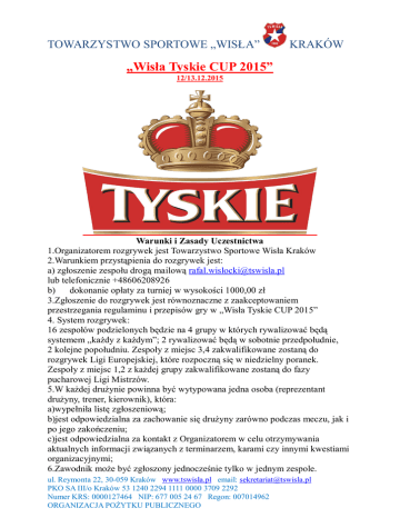 TOWARZYSTWO SPORTOWE „WISŁA” KRAKÓW „Wisła Tyskie CUP 2015” 12/13.12.2015 Warunki i Zasady Uczestnictwa 1.Organizatorem rozgrywek jest Towarzystwo Sportowe Wisła Kraków 2.Warunkiem przystąpienia do rozgrywek jest: a) zgłoszenie zespołu drogą mailową [email protected] lub telefonicznie +48606208926 b) dokonanie opłaty za turniej w wysokości 1000,00 zł 3.Zgłoszenie do rozgrywek jest równoznaczne z zaakceptowaniem przestrzegania regulaminu i przepisów gry w „Wisła Tyskie CUP 2015” 4. System rozgrywek: 16 zespołów podzielonych będzie na 4 grupy w których rywalizować będą systemem „każdy z każdym”; 2 rywalizować będą w sobotnie przedpołudnie, 2 kolejne popołudniu. Zespoły z miejsc 3,4 zakwalifikowane zostaną do rozgrywek Ligi Europejskiej, które rozpoczną się w niedzielny poranek. Zespoły z miejsc 1,2 z każdej grupy zakwalifikowane zostaną do fazy pucharowej Ligi Mistrzów. 5.W każdej drużynie powinna być wytypowana jedna osoba (reprezentant drużyny, trener, kierownik), która: a)wypełniła listę zgłoszeniową; b)jest odpowiedzialna za zachowanie się drużyny zarówno podczas meczu, jak i po jego zakończeniu; c)jest odpowiedzialna za kontakt z Organizatorem w celu otrzymywania aktualnych informacji związanych z terminarzem, karami czy innymi kwestiami organizacyjnymi; 6.Zawodnik może być zgłoszony jednocześnie tylko w jednym zespole. ul. Reymonta 22, 30-059 Kraków www.tswisla.pl email: [email protected] PKO SA III/o Kraków 53 1240 2294 1111 0000 3709 2292 Numer KRS: 0000127464 NIP: 677 005 24 67 Regon: 007014962 ORGANIZACJA POŻYTKU PUBLICZNEGO TOWARZYSTWO SPORTOWE „WISŁA” KRAKÓW 7.Turniej dedykowany jest głownie pracownikom firm i osobom powyżej 30.r.ż. W rozgrywkach mogą uczestniczyć 2 zawodnicy którzy nie ukończyli 30 roku życia, ale muszą być to osoby pełnoletnie. 9.Każda drużyna biorąca udział w rozgrywkach ma obowiązek występowania w jednolitych koszulkach z różnymi numerami na plecach (bramkarze nie mają obowiązku noszenia numerów) w koszulce bez numeru, pod warunkiem, że jest ona w tym samym kolorze co reszty zespołu; 10.Każdy zawodnik winien występować w obuwiu sportowym, przez co rozumie się buty halowe na płaskiej podeszwie, 11.Zawodnik nie powinien nosić jakichkolwiek przedmiotów (np. biżuteria, okulary),które mogą stanowić zagrożenie dla niego samego oraz innych uczestników meczu, a sędzia zawodów ma prawo nie dopuścić do gry zawodników, którzy nie spełniają powyższego warunku. 12. Za kibiców odpowiada drużyna i jej kierownictwo. Jeżeli sympatycy danego zespołu zakłócają spokój rozgrywek, organizator ma prawo nałożyć na drużynę karę nawet w postaci wykluczenia z rozgrywek. 13.Kibice są zobowiązani do przestrzegania regulaminu obiektu na którym są rozgrywane mecze. 14.Drużynom, które zostały wykluczone lub wycofały się z rozgrywek nie przysługuje zwrot kosztów. 15.Organizator zastrzega sobie prawo do wykorzystania wizerunku zawodników grających w turnieju w celu relacjonowania rozgrywek oraz dla celów marketingowych. 16. Każdy zawodnik zgłoszony do rozgrywek powinien posiadać na zawodach dokument tożsamości oraz jest zobowiązany do okazania go na wezwanie Organizatora lub sędziego. 17. W meczach nie mogą brać udziału zawodnicy będący pod wpływem alkoholu lub innych środków odurzających. 18.W każdej drużynie do rozgrywek może być zgłoszonych maksymalnie 12 zawodników (w tym trener lub kierownik zespołu) przy czym na boisku przebywa 4 zawodników z pola oraz bramkarz. Cały sztab zespołu nie może przekraczać tej liczby. ROZGRYWKI 1. Rozgrywki będą prowadzone markową piłką futsalową, na bramki o rozmiarach 3m x 2m na HALI GŁOWNEJ TS WISŁA KRAKÓW. 2. Strój bramkarza musi wyraźnie różnić się od strojów zawodników z pola. 3. Kapitan drużyny powinien posiadać na rękawie widoczną opaskę. 4. Podczas meczu tylko kapitan drużyny ma prawo rozmowy z sędzią. ul. Reymonta 22, 30-059 Kraków www.tswisla.pl email: [email protected] PKO SA III/o Kraków 53 1240 2294 1111 0000 3709 2292 Numer KRS: 0000127464 NIP: 677 005 24 67 Regon: 007014962 ORGANIZACJA POŻYTKU PUBLICZNEGO TOWARZYSTWO SPORTOWE „WISŁA” KRAKÓW 5. Mecz trwa 22 minuty (ostatnia minuta zatrzymywana). 6. W sytuacji gdy drużyna nie stawiła się o planowanej godzinie rozpoczęcia spotkania sędzia odlicza 5 minut i w przypadku dalszej nieobecności oznajmia koniec spotkania. Drużyna, która nie rozpoczęła meczu zostaje ukarana walkowerem (0 punktów i 0:3 w bramkach). W przypadku gdy na meczu nie stawi się żadna z drużyn, obie karane są ujemnym punktem. 7. W rozgrywkach za zwycięstwo drużyna otrzymuje 3 punkty, za remis 1 punkt, a za przegraną 0 punktów. 8. O pozycji w tabeli decyduje większa liczba zdobytych punktów. W przypadku równej liczby punktów o wyższej pozycji w tabeli decyduje: wynik bezpośredniego spotkania, a w sytuacji gdy sprawa dotyczy więcej niż dwóch drużyn tworzona jest mała tabela, w której uzględniane są mecze między zainteresowanymi zespołami. W przypadku, gdy w małej tabeli także dojdzie do sytuacji, gdzie więcej niż dwa zespoły mają równą liczbę punktów, tworzona jest kolejna mała tabela itd.; bilans bramek, większa ilość strzelonych goli, losowanie. Obowiązują przepisy gry w futsal zgodnie z wytycznymi PZPN. Postanowienia końcowe 1.Każdy uczestnik jest zobowiązany do zapoznania się z niniejszym regulaminem i przestrzegania go podczas rozgrywek. 2.Organizator ma pełne i wyłączne prawo interpretacji niniejszego regulaminu. 3.Organizator zastrzega sobie prawo dokonania zmian w regulaminie jeśli uzna to za stosowne. W przypadku wycofania się z rozgrywek którejś z drużyn, nie przewiduje się rozegrania dodatkowych meczów i zwrotu kosztów za nierozegrane mecze. 4.Niniejszy regulamin rozgrywek jest jedyną podstawą rozgrywek. Wszystkie wątpliwe kwestie doty