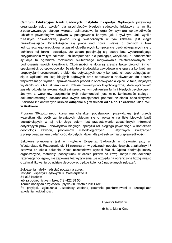 Centrum Edukacyjne Nauk Sądowych Instytutu Ekspertyz Sądowych przewiduje organizację cyklu szkoleń dla psychologów biegłych sądowych. Inicjatywa ta wynika z obserwowanego stałego wzrostu zainteresowania organów wymiaru sprawiedliwości udziałem psychologów zarówno w postępowaniu karnym, jak i cywilnym. Jak wynika z naszych doświadczeń, jakość usług świadczonych w tym zakresie jest ciągle niezadowalająca. Przedłużające się prace nad nową ustawą o biegłych i brak jednoznacznego uregulowania zasad określających kompetencje osób ubiegających się o pełnienie tej funkcji powodują, że zadań podejmują się osoby bez wystarczającego przygotowania w tym zakresie, ich kompetencje nie podlegają weryfikacji, a jednocześnie sytuacja ta ogranicza możliwości skutecznego motywowania zainteresowanych do podnoszenia swoich kwalifikacji. Okoliczności te dotyczą zresztą także biegłych innych specjalności, co spowodowało, że niektóre środowiska zawodowe występują z konkretnymi propozycjami uregulowania problemów dotyczących oceny kompetencji osób ubiegających się o wpisanie na listę biegłych sądowych oraz opracowania adekwatnych do potrzeb współczesnego wymiaru sprawiedliwości procedur opracowywania opinii. Z taką inicjatywą wystąpiło np. kilka lat temu m.in. Polskie Towarzystwo Psychologiczne, które opracowało zasady udzielania rekomendacji zainteresowanym pełnieniem funkcji biegłych psychologom. Jednym z warunków przyznania tych rekomendacji jest m.in. konieczność stałego i dokumentowanego doskonalenia swych umiejętności poprzez szkolenia specjalistyczne Pierwsze z planowanych szkoleń odbędzie się w dniach od 14 do 17 czerwca 2011 roku w Krakowie. Program 30-godzinnego kursu ma charakter podstawowy, przewidziany jest przede wszystkim dla osób zamierzających ubiegać się o wpisanie na listę biegłych bądź początkujących w tej roli.· Jego celem jest przedstawienie zasadniczych informacji dotyczących praw i obowiązków biegłego, specyfiki roli biegłego psychologa w kontekście deontologii zawodu, problemów metodologicznych i etycznych związanych z przeprowadzaniem badań osób dorosłych i dzieci dla potrzeb wymiaru sprawiedliwości. Szkolenie planowane jest w Instytucie Ekspertyz Sądowych w Krakowie, przy ul. Westerplatte 9. Rozpocznie się 14 czerwca br. w godzinach popołudniowych, a zakończy 17 czerwca br. około południa. Koszt uczestnictwa wynosi 600 zł. Opłata obejmuje koszty organizacyjne, materiały, poczęstunek w czasie przerw na kawę. Instytut nie dokonuje rezerwacji noclegów, nie zapewnia też wyżywienia. Ze względu na ograniczoną liczbę miejsc o zakwalifikowaniu do udziału decydować będzie kolejność nadsyłanych zgłoszeń. Zgłoszenia należy nadsyłać pocztą na adres: Instytut Ekspertyz Sądowych ul. Westerplatte 9 31-033 Kraków lub za pośrednictwem faxu: (12) 422 38 50 Termin nadsyłania zgłoszeń upływa 30 kwietnia 2011 roku. Po przyjęciu zgłoszenia uczestnicy zostaną pisemnie poinformowani o szczegółach szkolenia i odpłatności. Dyrektor Instytutu dr hab. Maria Kała