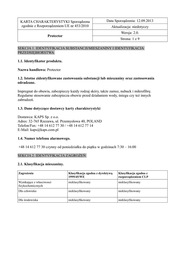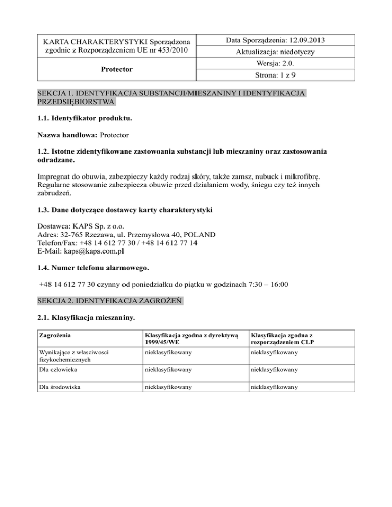 KARTA CHARAKTERYSTYKI Sporządzona zgodnie z Rozporządzeniem UE nr 453/2010 Data Sporządzenia: 12.09.2013 Aktualizacja: niedotyczy Wersja: 2.0. Protector Strona: 1 z 9 SEKCJA 1. IDENTYFIKACJA SUBSTANCJI/MIESZANINY I IDENTYFIKACJA PRZEDSIĘBIORSTWA 1.1. Identyfikator produktu. Nazwa handlowa: Protector 1.2. Istotne zidentyfikowane zastowoania substancji lub mieszaniny oraz zastosowania odradzane. Impregnat do obuwia, zabezpieczy każdy rodzaj skóry, także zamsz, nubuck i mikrofibrę. Regularne stosowanie zabezpiecza obuwie przed działaniem wody, śniegu czy też innych zabrudzeń. 1.3. Dane dotyczące dostawcy karty charakterystyki Dostawca: KAPS Sp. z o.o. Adres: 32-765 Rzezawa, ul. Przemysłowa 40, POLAND Telefon/Fax: +48 14 612 77 30 / +48 14 612 77 14 E-Mail: [email protected] 1.4. Numer telefonu alarmowego. +48 14 612 77 30 czynny od poniedziałku do piątku w godzinach 7:30 – 16:00 SEKCJA 2. IDENTYFIKACJA ZAGROŻEŃ 2.1. Klasyfikacja mieszaniny. Zagrożenia Klasyfikacja zgodna z dyrektywą 1999/45/WE Klasyfikacja zgodna z rozporządzeniem CLP Wynikające z własciwosci fizykochemicznych nieklasyfikowany nieklasyfikowany Dla człowieka nieklasyfikowany nieklasyfikowany Dla środowiska nieklasyfikowany nieklasyfikowany Data Sporządzenia: 12.09.2013 KARTA CHARAKTERYSTYKI Sporządzona zgodnie z Rozporządzeniem UE nr 453/2010 Aktualizacja: niedotyczy Wersja: 2.0. Protector Strona: 2 z 9 2.2. Elementy oznakowania Nie dotyczy 2.3. Inne zagrożenia Nie są znane. SEKCJA 3. SKŁAD/INFORMACJA O SKŁADNIKACH Nazwa substancji Izopropanol % wag. ok. 1,0 Klasyfikacja wg Identyfikator Dyrektywy 67/548/EWG produktu Symbol Zwroty R zagrożenia Numer CAS 67-63-0 Numer WE 200-661-7 F Xi R 11 R 36 R 67 Klasyfikacja wg Rozporządzenia (WE) nr 1272/2008 (CLP) Klasa zagrożenia Zwroty H Flam. Liq. 2 Eye Irrit. 2 STOT SE 3 H 225 H 319 H 336 Lista zwrotów R i H – zob. sekcja 16 karty charakterystyki. SEKCJA 4. ŚRODKI PIERWSZEJ POMOCY 4.1.Opis srodkow pierwszej pomocy Wdychanie: W przypadku narażenia inhalacyjnego wyprowadzić poszkodowanego z miejsca narażenia, zapewnić spokój w dowolnej pozycji. W razie dusznosci wykwalifikowany personel powinien podac tlen. Kontakt ze skórą W razie kontaktu ze skórą zdjąć odzież, zmyć skórę dużą iloscić wody z mydłem (jesli nie ma oparzeń). W razie objawów podrażnienia skóry – konsultacja dermatologiczna. Kontakt z oczami W wypadku kontaktu z oczami natychmiastowe obfite płukanie oczu chłodną wodą co najmniej 15 minut. Unikać silnego strumienia wody ze względu na ryzyko mechanicznego uszkodzenia rogówki. Spożycie W razie spożycia nie powodowac wymiotów. Podać do wypicia ok. 150Ml płynnej parafiny. Nie podawać do picia mleka, tłuszczów i alkoholu. Wezwać lekarza. KARTA CHARAKTERYSTYKI Sporządzona zgodnie z Rozporządzeniem UE nr 453/2010 Data Sporządzenia: 12.09.2013 Protector Aktualizacja: niedotyczy Wersja: 2.0. Strona: 3 z 9 SEKCJA 5. POSTĘPOWIANIE W PRZYPADKU POŻARU 5.1.Środki gaśnicze Odpwiednie środki gaśnicze : proszki gaśnicze, dwutlenek węgla, piany odporne na alkohol, woda – prądy rozproszone Niewłaściwe środki gaśnicze: zwarty strumień wody 5.2. Szczególne zagrożenia związane z mieszaniną Uwaga! Pojemnik pod ciśnieniem - niebezpieczeństwo eksplozji. Podczas spalania się produktu mogą wydzielać się niebezpieczne produkty rozkładu - tlenki węgla. 5.3. Informacje dla straży pożarnej Chłodzić zagrożone pojemniki rozproszonym strumieniem wody. Upewnić się że nie ma bezpośredniego kontaktu produktu z wodą. Nie dopuścić do przedostania się ścieków po gaszeniu pożaru do kanalizacji i zbiorników wodnych. Powstałe ścieki i pozostałości po pożarze usuwać zgodnie z obowiązującymi przepisami. Osoby biorące udział w gaszeniu pożaru powinny być przeszkolone, wyposażone we właściwą odzież i sprzęt ochronny. SEKCJA 6. PSTĘPOWANIE W PRZYPADKU NIEZAMIERZONEGO UWOLNIENIA DO ŚRODOWISKA 6.1. Indywidualne środki ostrożności, wyposażenie ochronne i procedury w sytuacjach awaryjnych Unikać kontaktu z oczami. Nie wdychać rozpylonej cieczy. Stosować środki ochrony indywidualnej – zob. sekcja 8 karty charakterystyki. 6.2. Środki ostrożności w zakresie ochrony środowiska Unikać przedostania się produktu do gleby, ścieków, cieków wodnych. 6.3. Metody i materiały zapobiegające rozprzestrzenianiu się skażenia i służące do usuwania skażenia Usunąć źródła zapłonu. Ograniczyć wyciek produktu np. poprzez obwałowanie terenu. Posypać produkt materiałem chłonnym (np. suchy piasek) i zebrać do specjalnie przygotowanych i oznakowanych pojemników. Odzyskać lub przekazać do utylizacji zgodnie z obowiązującymi przepisami. Zabrudzoną powierzchnię spłukać dużą ilością wody. 6.4. Odniesienia do innych sekcji Odnieść się również do sekcji 8 i 13 karty charakterystyki. Data Sporządzenia: 12.09.2013 KARTA CHARAKTERYSTYKI Sporządzona zgodnie z Rozporządzeniem UE nr 453/2010 Aktualizacja: niedotyczy Wersja: 2.0. Protector Strona: 4 z 9 SEKCJA 7. PSTĘPOWANIE Z SUBSTANCJAKI I MIESZANINAMI ORAZ ICH MAGAZYNOWANIE 7.1. Środki ostrożności dotyczące bezpiecznego postępowania Stosować odpowiednią wentylację. Uwaga! Pojemnik pod ciśnieniem. Chronić przed promieniami słonecznymi i temperaturami powyżej 50 °C. Także po zużyciu nie otwierać gwałtownie ani nie spalać. Nie rozpylać w kierunku płomienia ani żarzących się przedmiotów, trzymać z dala od źródeł ognia, nie palić tytoniu, trzymać w miejscu niedostępnym dla dzieci. Nie spawać i nie dziurawić pojemnika. Stosować uziemienie oraz urządzenia odporne na eksplozje. Unikać kumulacji ładunków. Zachować zwykłe środki ostrożności przy pracy z produktem - Nie pić, nie jeść i nie palić. Myć ręce przed i po pracy z produktem. Stosować środki ochrony indywidualnej – zob. sekcja 8 karty charakterystyki. 7.2. Warunki bezpiecznego magazynowania, łączni