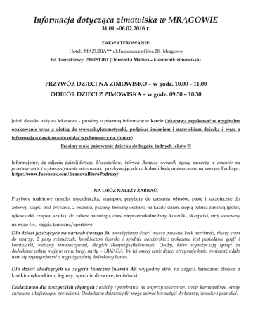Informacja dotycząca zimowiska w MRĄGOWIE 31.01 –06.02.2016 r. ZAKWATEROWANIE: Hotel: MAZURIA*** ul. Jaszczurcza Góra 28, Mrągowo tel. kontaktowy: 798 051 051 (Dominika Mathea – kierownik zimowiska) PRZYWÓZ DZIECI NA ZIMOWISKO – w godz. 10.00 – 11.00 ODBIÓR DZIECI Z ZIMOWISKA – w godz. 09:30 – 10.30 Jeżeli dziecko zażywa lekarstwa - prosimy o pisemną informację w karcie (lekarstwa zapakować w oryginalne opakowanie wraz z ulotką do woreczka/kosmetyczki, podpisać imieniem i nazwiskiem dziecka i wraz z informacją o dawkowaniu oddać wychowawcy na zbiórce). Prosimy o nie pakowanie dziecku do bagażu żadnych leków !!! Informujemy, że zdjęcia dzieci(dotyczy Uczestników, których Rodzice wyrazili zgodę zawartą w umowie na przetwarzanie i wykorzystywanie wizerunku), przebywających na kolonii będą umieszczone na naszym FanPagu: https://www.facebook.com/EranovaBiuroPodrozy/ NA OBÓZ NALEŻY ZABRAĆ: Przybory toaletowe (mydło, mydelniczka, szampon, przybory do czesania włosów, pastę i szczoteczkę do zębów), klapki pod prysznic, 2 ręczniki, piżamę, bieliznę osobistą na każdy dzień, ciepłą odzież zimową (polar, rękawiczki, czapka, szalik) do zabaw na śniegu, dres, nieprzemakalne buty, koszulki, skarpetki, strój stosowny na mszę św., zajęcia taneczne/sportowe. Dla dzieci jeżdżących na nartach (wersja B): obowiązkowo dzieci muszą posiadać kask narciarski, tłusty krem do twarzy, 2 pary rękawiczek, kombinezon (kurtka i spodnie narciarskie); wskazane jest posiadanie gogli i kominiarki, bielizny termoaktywnej, długich skarpet/podkolanowek. Osoby, które wypożyczają sprzęt za dodatkową opłatą mają w cenie buty, narty – UWAGA! W tej samej cenie dzieci otrzymają kask, ponieważ udało nam się wynegocjować z wypożyczalnią dodatkowy bonus. Dla dzieci chodzących na zajęcia taneczne (wersja A): wygodny strój na zajęcia teneczne: bluzka z krótkim rękawkiem, leginsy, spodnie dresowe, tenisówki. Dodatkowo dla wszystkich chętnych : ozdoby i przebrania na imprezy wieczorne, stroje karnawałowe, stroje związane z bajkowymi postaciami. Dodatkowo dziewczynki mogą zabrać kosmetyki do twarzy, włosów i paznokci. Dzieci mogą posiadać telefony komórkowe !!! Będą one wydawane dzieciom tylko i wyłącznie w czasie poobiednim od 3 dnia zimowiska (26.01.2016 r.). Poza tym czasem wyłączone komórki będą pod opieką wychowawcy. Centrum Tańca Wasilewski – Felska i wychowawcy nie ponoszą odpowiedzialności za telefony, w czasie, gdy korzystają z nich dzieci Prosimy o umieszczenie na telefonie naklejki z imieniem i nazwiskiem dziecka oraz nr PIN oraz prosimy spakować ładowarkę do telefonu. UWAGA!!! Przez pierwsze dwa dni nie dzwonimy do dzieci. Od 3 dnia zimowiska (26 stycznia) istnieją dwie możliwości kontaktu z dzieckiem: 1. Dzwonimy podczas godzin posiłków tj. Wersja A – 9.00-9.30, 14.00-14:30 tel. 517 499 774 Wersja B- 8.45-9.15, 14.00-14.30 tel. 798 051 051 2. Dzwonimy w czasie ciszy poobiedniej na numer telefonu komórkowego dziecka w godz. 14.30 – 15.15 od dnia 26 I 2016r. Nie będzie możliwości poproszenia dzieci do tel. o innej porze dnia (komórki będą wyłączone). W nagłych przypadkach telefonować do: kierownika zimowiska - Dominika Mathea - 798 051 051 lub prosimy o pozostawianie informacji w recepcji hotelu bądź sms-a na komórkę kierownika, skontaktujemy się tak szybko jak to będzie możliwe. Prosimy jednocześnie o informowanie kierownika kolonii o życzeniach lub uwagach, które dziecko Państwu przekazało telefonicznie, a o których my nie wiemy. Drodzy Rodzice !!! Serdecznie prosimy, by odwiedzać dzieci jedynie w wyjątkowej potrzebie, gdyż spotkanie takie wzmaga tęsknotę za domem, a chcielibyśmy, aby dziecko pozostało z nami do końca zimowiska. Zasada ta została podyktowana prośbami rodziców. W razie rezygnacji podczas trwania obozu nie zwracamy żadnych kosztów.