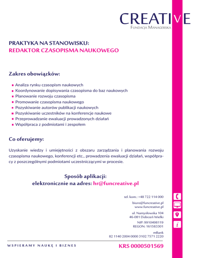 PRAKTYKA NA STANOWISKU: REDAKTOR CZASOPISMA NAUKOWEGO Zakres obowiązków: Analiza rynku czasopism naukowych Koordynowanie dopisywania czasopisma do baz naukowych Planowanie rozwoju czasopisma Promowanie czasopisma naukowego Pozyskiwanie autorów publikacji naukowych Pozyskiwanie uczestników na konferencje naukowe Przeprowadzanie ewaluacji prowadzonych działań Współpraca z podmiotami i zespołem Co oferujemy: Uzyskanie wiedzy i umiejętności z obszaru zarządzania i planowania rozwoju czasopisma naukowego, konferencji etc., prowadzenia ewaluacji działań, współpracy z poszczególnymi podmiotami uczestniczącymi w procesie. Sposób aplikacji: elektronicznie na adres: [email protected] tel. kom.: +48 722 114 000 [email protected] www.funcreative.pl ul. Namysłowska 104 46-081 Dobrzeń Wielki NIP: 9910498119 REGON: 161583301 mBank 82 1140 2004 0000 3102 7571 2220 WSPIERAMY NAUKĘ I BIZNES KRS 0000501569