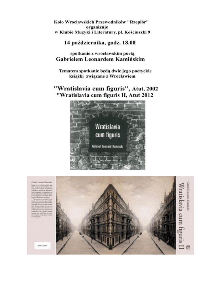 Koło Wrocławskich Przewodników "Rzepiór" organizuje w Klubie Muzyki i Literatury, pl. Kościuszki 9 14 października, godz. 18.00 spotkanie z wrocławskim poetą Gabrielem Leonardem Kamińskim Tematem spotkanie będą dwie jego poetyckie książki związane z Wrocławiem "Wratislavia cum figuris", Atut, 2002 "Wratislavia cum figuris II, Atut 2012