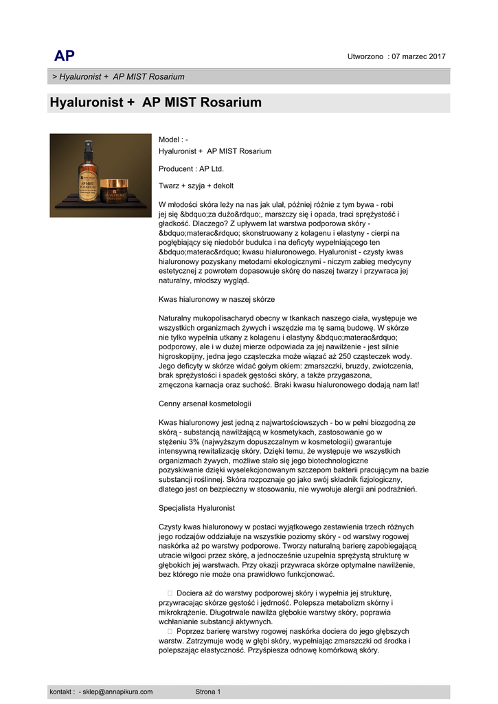 AP Utworzono : 07 marzec 2017 > Hyaluronist + AP MIST Rosarium Hyaluronist + AP MIST Rosarium Model : Hyaluronist + AP MIST Rosarium Producent : AP Ltd. Twarz + szyja + dekolt W młodości skóra leży na nas jak ulał, później różnie z tym bywa - robi jej się „za dużo”, marszczy się i opada, traci sprężystość i gładkość. Dlaczego? Z upływem lat warstwa podporowa skóry „materac” skonstruowany z kolagenu i elastyny - cierpi na pogłębiający się niedobór budulca i na deficyty wypełniającego ten „materac” kwasu hialuronowego. Hyaluronist - czysty kwas hialuronowy pozyskany metodami ekologicznymi - niczym zabieg medycyny estetycznej z powrotem dopasowuje skórę do naszej twarzy i przywraca jej naturalny, młodszy wygląd. Kwas hialuronowy w naszej skórze Naturalny mukopolisacharyd obecny w tkankach naszego ciała, występuje we wszystkich organizmach żywych i wszędzie ma tę samą budowę. W skórze nie tylko wypełnia utkany z kolagenu i elastyny „materac” podporowy, ale i w dużej mierze odpowiada za jej nawilżenie - jest silnie higroskopijny, jedna jego cząsteczka może wiązać aż 250 cząsteczek wody. Jego deficyty w skórze widać gołym okiem: zmarszczki, bruzdy, zwiotczenia, brak sprężystości i spadek gęstości skóry, a także przygaszona, zmęczona karnacja oraz suchość. Braki kwasu hialuronowego dodają nam lat! Cenny arsenał kosmetologii Kwas hialuronowy jest jedną z najwartościowszych - bo w pełni biozgodną ze skórą - substancją nawilżającą w kosmetykach, zastosowanie go w stężeniu 3% (najwyższym dopuszczalnym w kosmetologii) gwarantuje intensywną rewitalizację skóry. Dzięki temu, że występuje we wszystkich organizmach żywych, możliwe stało się jego biotechnologiczne pozyskiwanie dzięki wyselekcjonowanym szczepom bakterii pracującym na bazie substancji roślinnej. Skóra rozpoznaje go jako swój składnik fizjologiczny, dlatego jest on bezpieczny w stosowaniu, nie wywołuje alergii ani podrażnień. Specjalista Hyaluronist Czysty kwas hialuronowy w postaci wyjątkowego zestawienia trzech różnych jego rodzajów oddziałuje na wszystkie poziomy skóry - od warstwy rogowej naskórka aż po warstwy podporowe. Tworzy naturalną barierę zapobiegającą utracie wilgoci przez skórę, a jednocześnie uzupełnia sprężystą strukturę w głębokich jej warstwach. Przy okazji przywraca skórze optymalne nawilżenie, bez którego nie może ona prawidłowo funkcjonować. � Dociera aż do warstwy podporowej skóry i wypełnia jej strukturę, przywracając skórze gęstość i jędrność. Polepsza metabolizm skórny i mikrokrążenie. Długotrwale nawilża głębokie warstwy skóry, poprawia wchłanianie substancji aktywnych. � Poprzez barierę warstwy rogowej naskórka dociera do jego głębszych warstw. Zatrzymuje wodę w głębi skóry, wypełniając zmarszczki od środka i polepszając elastyczność. Przyśpiesza odnowę komórkową skóry. kontakt : - [email protected] Strona 1 AP Utworzono : 07 marzec 2017 > Hyaluronist + AP MIST Rosarium Hyaluronist + AP MIST Rosarium � Zapobiega utracie wody przez naskórek, tworząc na jego powierzchni delikatny film, zarazem zabezpieczający skórę przed szkodliwymi czynnikami środowiska, jak bakterie patogenne, kurz, promieniowanie UV. Błyskawicznie nawilża, napina i wygładza naskórek. Wskazania: Skóra dojrzała, starzejąca się, zmarszczki, bruzdy, zwiotczenia, opadające rysy twarzy, przesuszenie bądź suchość skóry. Działanie � uelastycznia, odżywia i rewitalizuje skórę � poprawia jędrność i gęstość skóry � nawilża i wygładza skórę okolic oczu � wygładza zmarszczki i bruzdy � zapewnia maksymalne nawilżenie � przywraca prawidłowe funkcje skóry � stymuluje odnowę komórkową � zwalcza wolne rodniki � Rezultaty: Skóra wygładzona, jędrna i dobrze nawilżona, spłycone bruzdy i zmarszczki, stymulacja naturalnych procesów regeneracji. Sposób stosowania: Nakładać na dokładnie oczyszczoną skórę po obfitym zwilżeniu jej różaną mgiełką AP Mist Rosarium, która nie tylko ułatwi penetrację Hyaluronist w głąb skóry, ale i wydatnie podniesie poziom nawilżenia i odżywienia. Po aplikacji nałożyć odpowiednio dobrany krem ANNA PIKURA bądź naturalny olejek botaniczny. Stosować dwa razy dziennie (bądź częściej w miarę potrzeby). Dla wzmocnienia pozytywnych rezultatów pielęgnację za pomocą Hyaluronist można łączyć ze stosowaniem kolagenu aktywnego biologicznie AP BIOAKTIV, który odbudowuje włókna kolagenowe warstwy podporowej skóry. Aplikacja kolagenu (również na mocno zwilżoną skórę) powinna poprzedzać nałożenie preparatu Hyaluronist. � AP Mist Rosarium� Aromatyczna wodna mgiełka z róży białej, przeznaczona do twarzy i ciała, jest niezbędnym składnikiem kuracji kolagenowej, ułatwiając wchłanianie się kolagenu i�podnosząc jego skuteczność, a przy okazji poprawiając nawilżenie skóry. Cenna woda kwiatowa z róży białej Rosa x alba L., pochodząca ze słynnej Doliny Ró�w Bułgarii i stanowiąca bazę wodnej mgiełki, jest również znakomitym samodzielnym�kosmetykiem, szczególnie w upalne dni, w suchych, ogrzewanych, klimatyzowanych pomieszczeniach czy w podróży. Regeneruje i koi skórę, wzmacnia drobne naczynia�krwionośne. Optymalizuje pH skóry i normalizuje wydzielanie sebum. Ma właściwości�oczyszczające, łagodnie ściągające i wygładzające.�Jest to ekologiczny, certyfikowany przez kontakt : - [email protected] Strona 2 AP Utworzono : 07 marzec 2017 > Hyaluronist + AP MIST Rosarium Hyaluronist + AP MIST Rosarium organizacje CERES i USDA Organic destylat�z kwiatów róż, uzyskiwany z roślin uprawianych na kontrolowanych, certyfikowanych�plantacjach ekologicznych.� INCI: Rosa Alba (Rose) Flower Water, Aqua, Gluconolactone, Sodium Benzoate� W atrakcyjnym zestawie z kolagenem AP BIOAKTIV specjalna promocyjna cena. � C