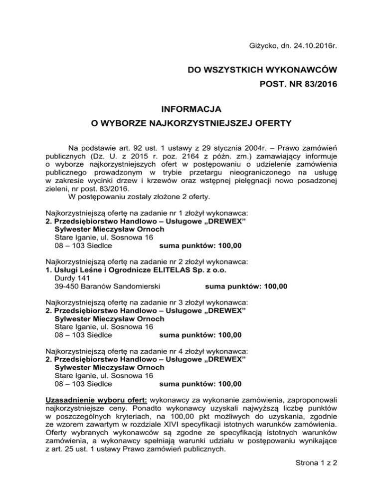 Giżycko, dn. 24.10.2016r. DO WSZYSTKICH WYKONAWCÓW POST. NR 83/2016 INFORMACJA O WYBORZE NAJKORZYSTNIEJSZEJ OFERTY Na podstawie art. 92 ust. 1 ustawy z 29 stycznia 2004r. – Prawo zamówień publicznych (Dz. U. z 2015 r. poz. 2164 z późn. zm.) zamawiający informuje o wyborze najkorzystniejszych ofert w postępowaniu o udzielenie zamówienia publicznego prowadzonym w trybie przetargu nieograniczonego na usługę w zakresie wycinki drzew i krzewów oraz wstępnej pielęgnacji nowo posadzonej zieleni, nr post. 83/2016. W postępowaniu zostały złożone 2 oferty. Najkorzystniejszą ofertę na zadanie nr 1 złożył wykonawca: 2. Przedsiębiorstwo Handlowo – Usługowe „DREWEX” Sylwester Mieczysław Ornoch Stare Iganie, ul. Sosnowa 16 08 – 103 Siedlce suma punktów: 100,00 Najkorzystniejszą ofertę na zadanie nr 2 złożył wykonawca: 1. Usługi Leśne i Ogrodnicze ELITELAS Sp. z o.o. Durdy 141 39-450 Baranów Sandomierski suma punktów: 100,00 Najkorzystniejszą ofertę na zadanie nr 3 złożył wykonawca: 2. Przedsiębiorstwo Handlowo – Usługowe „DREWEX” Sylwester Mieczysław Ornoch Stare Iganie, ul. Sosnowa 16 08 – 103 Siedlce suma punktów: 100,00 Najkorzystniejszą ofertę na zadanie nr 4 złożył wykonawca: 2. Przedsiębiorstwo Handlowo – Usługowe „DREWEX” Sylwester Mieczysław Ornoch Stare Iganie, ul. Sosnowa 16 08 – 103 Siedlce suma punktów: 100,00 Uzasadnienie wyboru ofert: wykonawcy za wykonanie zamówienia, zaproponowali najkorzystniejsze ceny. Ponadto wykonawcy uzyskali najwyższą liczbę punktów w poszczególnych kryteriach, na 100,00 pkt możliwych do uzyskania, zgodnie ze wzorem zawartym w rozdziale XIVI specyfikacji istotnych warunków zamówienia. Oferty wybranych wykonawców są zgodne ze specyfikacją istotnych warunków zamówienia, a wykonawcy spełniają warunki udziału w postępowaniu wynikające z art. 25 ust. 1 ustawy Prawo zamówień publicznych. Strona 1 z 2 Poniższa tabela przedstawia w postępowaniu, wraz z ich punktacją: Nr oferty Nazwa firmy; Adres Wykonawcy wszystkie oferty, złożone Liczba pkt Termin gwarancji Liczba pkt Termin wykonania zamówienia Suma punktów 28,08 15,00 25,00 68,08 60,00 15,00 25,00 100,00 60,00 15,00 25,00 100,00 35,66 15,00 25,00 75,66 10,98 15,00 25,00 50,98 60,00 15,00 25,00 100,00 28,88 15,00 25,00 68,88 60,00 15,00 25,00 100,00 Liczba pkt /Cena brutto/ ważne ZADANIE NR 1 Oferta nr 1 Oferta nr2 Usługi Leśne i Ogrodnicze ELITELAS Sp. z o.o. Durdy 141 39-450 Baranów Sandomierski Przedsiębiorstwo Handlowo – Usługowe „DREWEX” Sylwester Mieczysław Ornoch Stare Iganie, ul. Sosnowa 16 08 – 103 Siedlce ZADANIE NR 2 Oferta nr 1 Oferta nr 2 Usługi Leśne i Ogrodnicze ELITELAS Sp. z o.o. Durdy 141 39-450 Baranów Sandomierski Przedsiębiorstwo Handlowo – Usługowe „DREWEX” Sylwester Mieczysław Ornoch Stare Iganie, ul. Sosnowa 16 08 – 103 Siedlce ZADANIE NR 3 Oferta nr 1 Oferta nr 2 Usługi Leśne i Ogrodnicze ELITELAS Sp. z o.o. Durdy 141 39-450 Baranów Sandomierski Przedsiębiorstwo Handlowo – Usługowe „DREWEX” Sylwester Mieczysław Ornoch Stare Iganie, ul. Sosnowa 16 08 – 103 Siedlce ZADANIE NR 4 Oferta nr 1 Oferta nr 2 Usługi Leśne i Ogrodnicze ELITELAS Sp. z o.o. Durdy 141 39-450 Baranów Sandomierski Przedsiębiorstwo Handlowo – Usługowe „DREWEX” Sylwester Mieczysław Ornoch Stare Iganie, ul. Sosnowa 16 08 – 103 Siedlce KOMENDANT /-/ wz. ppłk Lechosław WOLIŃSKI Strona 2 z 2