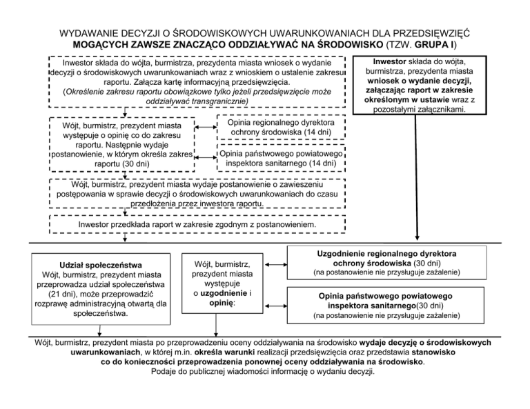 WYDAWANIE DECYZJI O ŚRODOWISKOWYCH UWARUNKOWANIACH DLA PRZEDSIĘWZIĘĆ MOGĄCYCH ZAWSZE ZNACZĄCO ODDZIAŁYWAĆ NA ŚRODOWISKO (TZW. GRUPA I) Inwestor składa do wójta, burmistrza, prezydenta miasta wniosek o wydanie decyzji o środowiskowych uwarunkowaniach wraz z wnioskiem o ustalenie zakresu raportu. Załącza kartę informacyjną przedsięwzięcia. (Określenie zakresu raportu obowiązkowe tylko jeŜeli przedsięwzięcie moŜe oddziaływać transgranicznie) Wójt, burmistrz, prezydent miasta występuje o opinię co do zakresu raportu. Następnie wydaje postanowienie, w którym określa zakres raportu (30 dni) Inwestor składa do wójta, burmistrza, prezydenta miasta wniosek o wydanie decyzji, załączając raport w zakresie określonym w ustawie wraz z pozostałymi załącznikami. Opinia regionalnego dyrektora ochrony środowiska (14 dni) Opinia państwowego powiatowego inspektora sanitarnego (14 dni) Wójt, burmistrz, prezydent miasta wydaje postanowienie o zawieszeniu postępowania w sprawie decyzji o środowiskowych uwarunkowaniach do czasu przedłoŜenia przez inwestora raportu. Inwestor przedkłada raport w zakresie zgodnym z postanowieniem. Udział społeczeństwa Wójt, burmistrz, prezydent miasta przeprowadza udział społeczeństwa (21 dni), moŜe przeprowadzić rozprawę administracyjną otwartą dla społeczeństwa. Wójt, burmistrz, prezydent miasta występuje o uzgodnienie i opinię: Uzgodnienie regionalnego dyrektora ochrony środowiska (30 dni) (na postanowienie nie przysługuje zaŜalenie) Opinia państwowego powiatowego inspektora sanitarnego(30 dni) (na postanowienie nie przysługuje zaŜalenie) Wójt, burmistrz, prezydent miasta po przeprowadzeniu oceny oddziaływania na środowisko wydaje decyzję o środowiskowych uwarunkowaniach, w której m.in. określa warunki realizacji przedsięwzięcia oraz przedstawia stanowisko co do konieczności przeprowadzenia ponownej oceny oddziaływania na środowisko. Podaje do publicznej wiadomości informację o wydaniu decyzji. WYDAWANIE DECYZJI O ŚRODOWISKOWYCH UWARUNKOWANIACH PRZEZ REGIONALNEGO DYREKTORA OCHRONY ŚRODOWISKA dla dróg, linii kolejowych, napowietrznych linii elektroenergetycznych, sztucznych zbiorników wodnych, instalacji do przesyłu ropy naftowej, produktów naftowych, substancji chemicznych lub gazu, będących przedsięwzięciami mogącymi zawsze znacząco oddziaływać na środowisko (grupa I) Inwestor składa do regionalnego dyrektora ochrony środowiska wniosek o wydanie decyzji o środowiskowych uwarunkowaniach wraz z wnioskiem o ustalenie zakresu raportu. Załącza kartę informacyjną przedsięwzięcia. (Określenie zakresu raportu obowiązkowe tylko jeŜeli przedsięwzięcie moŜe oddziaływać transgranicznie) Regionalny dyrektor ochrony środowiska występuje o opinię co do zakresu raportu. Następnie wydaje postanowienie, w którym określa zakres raportu. (30 dni) Inwestor składa do regionalny dyrektora ochrony środowiska wniosek o wydanie decyzji, załączając raport w zakresie określonym w ustawie wraz z pozostałymi załącznikami. . Opinia państwowego wojewódzkiego inspektora sanitarnego (14 dni) Regionalny dyrektor ochrony środowiska wydaje postanowienie o zawieszeniu postępowania w sprawie decyzji o środowiskowych uwarunkowaniach do czasu przedłoŜenia przez inwestora raportu. Inwestor przedkłada raport w zakresie zgodnym z postanowieniem. Udział społeczeństwa Regionalny dyrektor ochrony środowiska przeprowadza udział społeczeństwa (21 dni), moŜe przeprowadzić rozprawę administracyjną otwartą dla społeczeństwa. Regionalny dyrektor ochrony środowiska występuje o opinię: Opinia państwowego wojewódzkiego inspektora sanitarnego (30 dni). (na postanowienie nie przysługuje zaŜalenie) Regionalny dyrektor ochrony środowiska po przeprowadzeniu oceny oddziaływania na środowisko wydaje decyzję o środowiskowych uwarunkowaniach, w której m.in. określa warunki realizacji przedsięwzięcia oraz przedstawia stanowisko co do konieczności przeprowadzenia ponownej oceny oddziaływania na środowisko. Podaje do publicznej wiadomości informację o wydaniu decyzji. WYDAWANIE DECYZJI O ŚRODOWISKOWYCH UWARUNKOWANIACH DLA PRZEDSIĘWZIĘĆ MOGĄCYCH POTENCJALNIE ZNACZĄCO ODDZIAŁYWAĆ NA ŚRODOWISKO (TZW. GRUPA II) Inwestor składa do wójta, burmistrza, prezydenta miasta wniosek o wydanie decyzji o środowiskowych uwarunkowaniach załączając kartę informacyjną przedsięwzięcia wraz z załącznikami określonymi w ustawie Organ prowadzący postępowanie, zwraca się o opinię co do potrzeby przeprowadzenia oceny oddziaływania na środowisko TAK Postanowienie stwierdzające obowiązek przeprowadzenia oceny oddziaływania na środowisko i określające zakres raportu. (30 dni) (na postanowienie przysługuje zaŜalenie) Inwestor przedkłada raport o oddziaływaniu na środowisko w zakresie zgodnym z postanowieniem. Udział społeczeństwa Wójt, burmistrz, prezydent miasta prowadzący postępowanie przeprowadza udział społeczeństwa (21 dni), moŜe przeprowadzić rozprawę administracyjną otwartą dla społeczeństwa. Wójt, burmistrz, prezydent miasta występuje o uzgodnienie i opinię: Opinia regionalnego dyrektora ochrony środowiska (14 dni) Opinia państwowego powiatowego inspektora sanitarnego (14 dni) NIE Postanowienie o braku potrzeby przeprowadzenia oceny oddziaływania przedsięwzięcia na środowisko. (30 dni) (na postanowienie nie przysługuje zaŜalenie) Następnie organ wydaje decyzję o środowiskowych uwarunkowaniach. Podaje do publicznej wiadomości informację o wydaniu decyzji. Uzgodnienie regionalnego dyrektora ochrony środowiska (30 dni). (na postanowienie nie przysługuje zaŜalenie) Opinię państwowego powiatowego inspektora sanitarnego (30 dni). (na postanowienie nie przysługuje zaŜalenie) Wójt, burmistrz, prezydent miasta po przeprowadzeniu oceny oddziaływania na środowisko wydaje decyzję o środowiskowych uwarunkowaniach, w któr