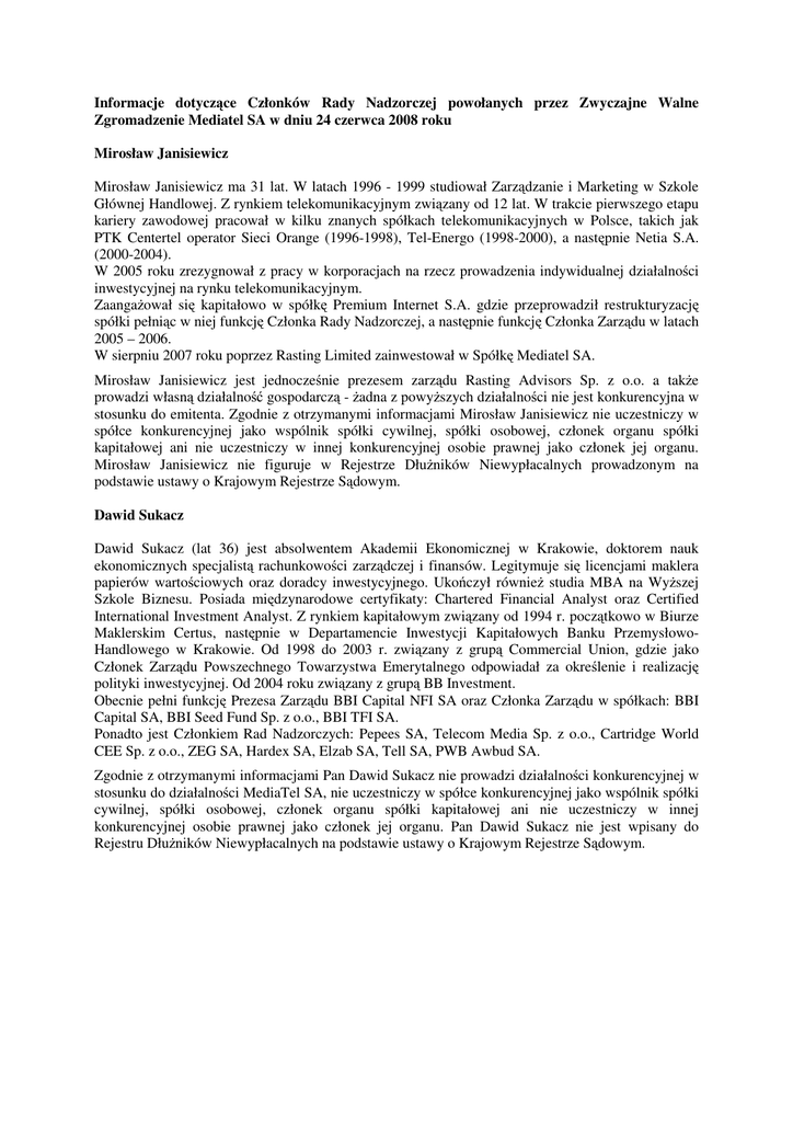 Informacje dotyczące Członków Rady Nadzorczej powołanych przez Zwyczajne Walne Zgromadzenie Mediatel SA w dniu 24 czerwca 2008 roku Mirosław Janisiewicz Mirosław Janisiewicz ma 31 lat. W latach 1996 - 1999 studiował Zarządzanie i Marketing w Szkole Głównej Handlowej. Z rynkiem telekomunikacyjnym związany od 12 lat. W trakcie pierwszego etapu kariery zawodowej pracował w kilku znanych spółkach telekomunikacyjnych w Polsce, takich jak PTK Centertel operator Sieci Orange (1996-1998), Tel-Energo (1998-2000), a następnie Netia S.A. (2000-2004). W 2005 roku zrezygnował z pracy w korporacjach na rzecz prowadzenia indywidualnej działalności inwestycyjnej na rynku telekomunikacyjnym. Zaangażował się kapitałowo w spółkę Premium Internet S.A. gdzie przeprowadził restrukturyzację spółki pełniąc w niej funkcję Członka Rady Nadzorczej, a następnie funkcję Członka Zarządu w latach 2005 – 2006. W sierpniu 2007 roku poprzez Rasting Limited zainwestował w Spółkę Mediatel SA. Mirosław Janisiewicz jest jednocześnie prezesem zarządu Rasting Advisors Sp. z o.o. a także prowadzi własną działalność gospodarczą - żadna z powyższych działalności nie jest konkurencyjna w stosunku do emitenta. Zgodnie z otrzymanymi informacjami Mirosław Janisiewicz nie uczestniczy w spółce konkurencyjnej jako wspólnik spółki cywilnej, spółki osobowej, członek organu spółki kapitałowej ani nie uczestniczy w innej konkurencyjnej osobie prawnej jako członek jej organu. Mirosław Janisiewicz nie figuruje w Rejestrze Dłużników Niewypłacalnych prowadzonym na podstawie ustawy o Krajowym Rejestrze Sądowym. Dawid Sukacz Dawid Sukacz (lat 36) jest absolwentem Akademii Ekonomicznej w Krakowie, doktorem nauk ekonomicznych specjalistą rachunkowości zarządczej i finansów. Legitymuje się licencjami maklera papierów wartościowych oraz doradcy inwestycyjnego. Ukończył również studia MBA na Wyższej Szkole Biznesu. Posiada międzynarodowe certyfikaty: Chartered Financial Analyst oraz Certified International Investment Analyst. Z rynkiem kapitałowym związany od 1994 r. początkowo w Biurze Maklerskim Certus, następnie w Departamencie Inwestycji Kapitałowych Banku PrzemysłowoHandlowego w Krakowie. Od 1998 do 2003 r. związany z grupą Commercial Union, gdzie jako Członek Zarządu Powszechnego Towarzystwa Emerytalnego odpowiadał za określenie i realizację polityki inwestycyjnej. Od 2004 roku związany z grupą BB Investment. Obecnie pełni funkcję Prezesa Zarządu BBI Capital NFI SA oraz Członka Zarządu w spółkach: BBI Capital SA, BBI Seed Fund Sp. z o.o., BBI TFI SA. Ponadto jest Członkiem Rad Nadzorczych: Pepees SA, Telecom Media Sp. z o.o., Cartridge World CEE Sp. z o.o., ZEG SA, Hardex SA, Elzab SA, Tell SA, PWB Awbud SA. Zgodnie z otrzymanymi informacjami Pan Dawid Sukacz nie prowadzi działalności konkurencyjnej w stosunku do działalności MediaTel SA, nie uczestniczy w spółce konkurencyjnej jako wspólnik spółki cywilnej, spółki osobowej, członek organu spółki kapitałowej ani nie uczestniczy w innej konkurencyjnej osobie prawnej jako członek jej organu. Pan Dawid Sukacz nie jest wpisany do Rejestru Dłużników Niewypłacalnych na podstawie ustawy o Krajowym Rejestrze Sądowym.