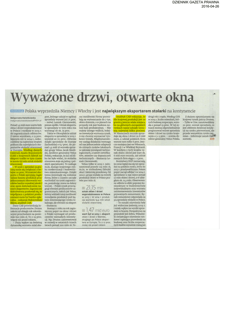 DZIENNIK GAZETA PRAWNA 2016-04-26 Wyważone drzwi, otwarte okna PRODUKCJA Polska wyprzedziła Niemcy i Włochy i jest największym eksporterem stolarki na kontynencie Małgorzata Kwiatkowska [email protected] Ponad 1,5 mld euro warte były okna i drzwi wyprodukowane w Polsce i wysłane w 2015 r. do zagranicznych odbiorców. Z takim wynikiem, o 13 proc. lepszym niż w 2014 r., wsko czyliśmy na najwyższy stopień podium dla największych eks porterów stolarki otworowej w Europie. Według danych Centrum Analiz Branżowych (CAB) z krajowych fabryk na eksport trafiło w tym czasie w sumie 8,8 mln sztuk stolarki otworowej. - W 2016 r. sprzedaż za gra nicę może się zwiększyć o ko lejne 10 proc. Wzrostowi eks portu z Polski sprzyjają ciągle niższe koszty produkgi przy jednoczesnym oferowaniu wy robów bardzo wysokiej jakości oraz spore doświadczenie na szych eksporterów. Zagraniczni dystrybutorzy przekonali się, że współpraca z polskimi produ centami może być bardzo opła calna - wskazuje Maksymilian Miros, analityk CAB. Dane CAB potwierdzają in formacje producentów. Drutex zakończył ubiegły rok rekordo wymi przychodami na pozio mie 620 mln zŁ To o 19 proc. więcej niż przed rokiem. - Duży wpływ na świetną dynamikę wzrostu miał eks port, którego udział w ogólnej sprzedaży wynosi już 71 proc. - mówi Leszek Gierszewski, prezes spółki Udział eksportu w sprzedaży w tym roku ma wzrosnąć do ok. 75 proc. Także w Oknoplaście udział eksportu wsprzedaży w 2015 r. wyniósł aż 70 proc. Głównie dzięki sprzedaży do Europy Zachodniej o 6,7 proc. do po nad 1,5 mld zł wzrosła sprze daż grupy Velux. Jacek Siwiń ski, dyrektor generalny Velux Polska, wskazuje, że już od kil ku lat było widać, że stolarka otworowa staje się jedną z pol skich specjalności To zasługa min. dużego krajowego ryn ku modernizacji i budownic twa mieszkaniowego. Dzięki temu rozwinęły się rodzime firmy, które z czasem zaczęły wychodzić na rynki zagranicz ne, poszukując szans na dalszy wzrost - Polski rynek przycią gnął również producentów za granicznych, takich jak Velux, którzy widzielitutaj możliwość rozwijania produkgi pod ką tem interesującego rynku lo kalnego, ale również na eksport -tłumaczy. Rosnący z roku na rok zagra niczny popyt na okna i drzwi z Polski wymagał od produ centów niemałych inwesty cji Np. Drutex zainwestował w rozwój w ostatnich trzech latach ponad 220 mln zł. Te raz możliwości firmy pozwa lają na wytwarzanie do 7 tys. okien dziennie,a wplanach na przyszły rok jest budowa no wej hali produkcyjnej. - Nie mamy innego wyjścia, kolej ne inwestycje wymusza rynek. A my chcemy wyznaczać ryn kowe trendy. Międzynarodo wy zasięg działania wymaga od nas jednocześnie adaptacji do różnych rynków lokalnych w zakresie rozwiązań techno logicznych, a nawet certyfika tów, atestów czy dopuszczeń technicznych - tłumaczy Le szek Gierszewski Velux tylko w 2015 r. zain westował prawie 125 mln zł, m.in. w rozbudowę fabryki okuć ilakiernię proszkową. Od 2012 r. grupa wydała na rozwój produkcji okien w Polsce pra wie 500 mln zł. iii 21,15 mln sztuk okien i drzwi wyprodukowano w Polsce w 2015 r. W 2014 r. produk cja wyniosła 19,9 mln sztuk stolarki otworowej il 1,47 mld euro wart był w 2015 r. eksport okien i drzwi z Niemiec, drugiego po Polsce ekspor tera w Europie. To o 17 proc. mniej niż przed rokiem Analityk CAB wskazuje, że drugi rok z rzędu. Według GUS Z dużym optymizmem na dla krajowej produkcji jest za w 2015 r. liczba mieszkań, któ krajowy rynek patrzy Drutex. granicą jeszcze wiele miejsca, rych budowę rozpoczęto, wzro - Tylko w I kw. zanotowaliśmy bo na głównych europejskich sła o ponad 13 proc. W tej sy 22-proc. wzrost sprzedaży, co rynkach nasze udziały wyno tuacji można odpowiedzialnie jest efektem świetnej kondyszą najwyżej kilka procent. prognozować wzrost sprzedaży q'i na rynku pierwotnym, ale W Niemczech rocznie sprze okien i drzwi na rynku krajo przede wszystkim rynku wy: daje się okna i drzwi za 8 mld wym o 3-5 proc. - ocenia dy mian - informuje Leszek Cief^ euro, a udział polskich firm rektor generalny Velux Polska. szewski wynosi tam tylko 6 proc. Jesz cze mniejszy jest we Włoszech, Francji i w Wielkiej Brytanii W każdym z tych krajów ry nek okien i drzwi jest wart ok. 6 mld euro rocznie, zaś udział naszych firm sięga 1-2 proc. Rozmówcy DGP zaznaczają, że coraz lepiejma się też sprze daż na polskim rynku, który do 2013 r. przeżywał kryzys.Potem popyt zaczął odbijać i w 2014 r. sprzedano u nas nieco ponad 12 mln okien i drzwi a wubie głym ok 12,3 mln.Obserwowa ne odbicie to efekt poprawy ko niunktury w budownictwie indywidualnym oraz wzrostu zainteresowania inwestorów prywatnych remontami Ry nek remontowy odpowiada za 3/4 sprzedaży stolarki w Polsce. - Te oznaki ożywienia były już widoczne jesienią 2014 r. i miały wpływ na wynikisprze daży w branży. Perspektywa na przyszłość jest dobra. Wskaźni ki zwiastujące ożywienie ryn kowe i opisujące pozwolenia na budowę oraz liczba rozpoczę tych budów wyraźnie rosną już