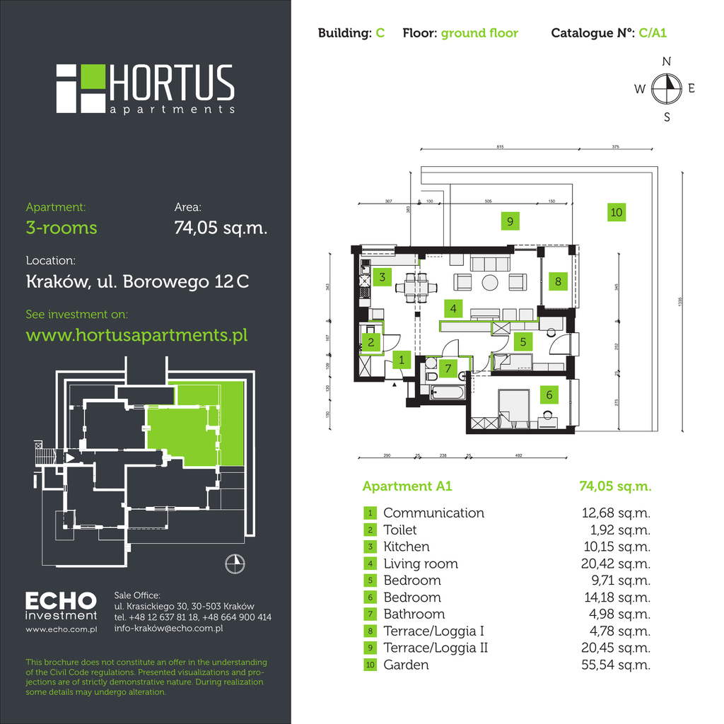 Building: C Apartment: Floor: ground floor Catalogue N°: C/A1 Area: 3-rooms 10 9 74,05 sq.m. Location: 3 Kraków, ul. Borowego 12 C 8 4 See investment on: www.hortusapartments.pl 5 2 1 7 6 Apartment A1 1 2 3 4 5 Sale Office: ul. Krasickiego 30, 30-503 Kraków tel. +48 12 637 81 18, +48 664 900 414 info-krakó[email protected] 6 7 8 9 This brochure does not constitute an offer in the understanding of the Civil Code regulations. Presented visualizations and projections are of strictly demonstrative nature. During realization some details may undergo alteration. 10 Communication Toilet Kitchen Living room Bedroom Bedroom Bathroom Terrace/Loggia I Terrace/Loggia II Garden 74,05 sq.m. 12,68 sq.m. 1,92 sq.m. 10,15 sq.m. 20,42 sq.m. 9,71 sq.m. 14,18 sq.m. 4,98 sq.m. 4,78 sq.m. 20,45 sq.m. 55,54 sq.m.