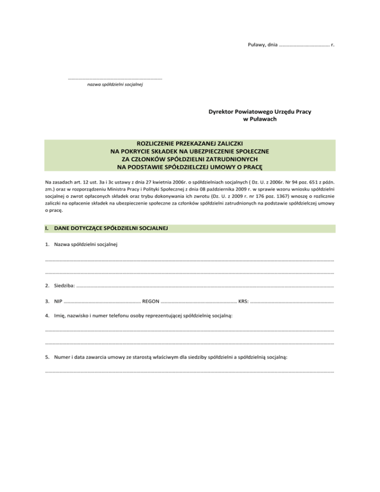 Puławy, dnia ………………….…..……………. r. …………………………………………………….………………. nazwa spółdzielni socjalnej Dyrektor Powiatowego Urzędu Pracy w Puławach ROZLICZENIE PRZEKAZANEJ ZALICZKI NA POKRYCIE SKŁADEK NA UBEZPIECZENIE SPOŁECZNE ZA CZŁONKÓW SPÓŁDZIELNI ZATRUDNIONYCH NA PODSTAWIE SPÓŁDZIELCZEJ UMOWY O PRACĘ Na zasadach art. 12 ust. 3a i 3c ustawy z dnia 27 kwietnia 2006r. o spółdzielniach socjalnych ( Dz. U. z 2006r. Nr 94 poz. 651 z późn. zm.) oraz w rozporządzeniu Ministra Pracy i Polityki Społecznej z dnia 08 października 2009 r. w sprawie wzoru wniosku spółdzielni socjalnej o zwrot opłaconych składek oraz trybu dokonywania ich zwrotu (Dz. U. z 2009 r. nr 176 poz. 1367) wnoszę o rozlicznie zaliczki na opłacenie składek na ubezpieczenie społeczne za członków spółdzielni zatrudnionych na podstawie spółdzielczej umowy o pracę. I. DANE DOTYCZĄCE SPÓŁDZIELNI SOCJALNEJ 1. Nazwa spółdzielni socjalnej ………………………………………………………………………………………………………………………………………………………………………………………………………………………… ………………………………………………………………………………………………………………………………………………………………………………………………………………………… 2. Siedziba: ………………………………………..…………………….………………………………………………………………………………………………………………………………… 3. NIP ……………………………..………….….……….... REGON ……………………….……….……………………… KRS: …………………………………………………………….. 4. Imię, nazwisko i numer telefonu osoby reprezentującej spółdzielnię socjalną: ………………………………………………………………………………………………………………………………………………………………………………………………………………………… ………………………………………………………………………………………………………………………………………………………………………………………………………………………… 5. Numer i data zawarcia umowy ze starostą właściwym dla siedziby spółdzielni a spółdzielnią socjalną: ………………………………………………………………………………………………………………………………………………………………………………………………………………………… II. DANE NIEZBĘDNE DO ROZLICZENIA ZALICZKI L p. Nazwisko i imię osoby, której dotyczy rozliczenie PESEL Okres, na który został zawarty stosunek pracy między spółdzielnią socjalną a jej członkiem Przynależność osoby przed przystąpienie m do spółdzielni socjalnej* (wpisać A, B lub C) Okres opłacenia składek (od dnia do dnia) Podstawa wymiaru składek w zł i gr Kwota opłaconych składek w zł emerytalne rentowe chorobowe wypadkowe Kwota Kwota RÓŻNICA składek składek między opłaconych wypłaconych zaliczką a w zł zaliczkowo faktycznie w zł poniesionym kosztem 1. 2. 3. 4. 5. RAZEM: * przynależność osoby przed przystąpieniem do spółdzielni socjalnej (wybrać właściwy): A- osoby bezrobotne w rozumieniu art. 2 ust 1 pkt 2 ustawy z dnia 20 kwietnia 2004 o promocji zatrudnienia i instytucjach rynku pracy (Dz. U. z 2015 r. poz.149 ze zm.) B - osoby, o których mowa w art. 1 ust. 2 pkt 1-4, 6,7 ustawy z dnia 13 czerwca 2003r. o zatrudnieniu socjalnym (Dz. U. z 2011r. Nr 43 poz. 225 ze zm.) C - osoby niepełnosprawne w rozumieniu ustawy z dnia 27 sierpnia 1997 r. o rehabilitacji zawodowej i społecznej oraz zatrudnianiu osób niepełnosprawnych (Dz. U. z 2011 r. nr 127, poz. 721 ze zm.). III. ROZLICZENIE 1. Łączna kwota zaliczki w wysokości: …………………………………………………………...….. zł. (słownie: …………….…………………………..………………………………………………………………………………………………………………………………………………… .…………………………..…………………………………………………………………………………………………………………….………………………………...............…………zł) została przekazana na rachunek bankowy spółdzielni socjalnej w wysokości: .……………………….………….….…………….. zł (słownie: …………….…………………………..………………………………………………………………………………………………………………………………………………… .…………………………..…………………………………………………………………………………………………………………….………………………………...............………zł). 2. RÓŻNICA pomiędzy wypłaconą zaliczką za miesiąc …………………….…….................................. a faktycznie poniesionym kosztem na pokrycie składek w wysokości …………………………………………..………. zł. (słownie: …………….…………………………..………………………………………………………………………………………………………………………………………………… .…………………………..…………………………………………………………………………………………………………………….……………