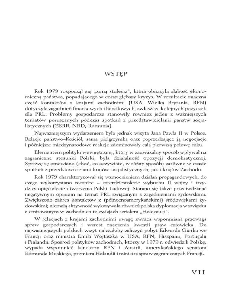 WSTĘP Rok 1979 rozpoczął się „zimą stulecia”, która obnażyła słabość ekonomiczną państwa, popadającego w coraz głębszy kryzys. W rezultacie znaczna część kontaktów z krajami zachodnimi (USA, Wielka Brytania, RFN) dotyczyła zagadnień finansowych i handlowych, zwłaszcza kolejnych pożyczek dla PRL. Problemy gospodarcze stanowiły również jeden z ważniejszych tematów poruszanych podczas spotkań z przedstawicielami państw socjalistycznych (ZSRR, NRD, Rumunia). Najważniejszym wydarzeniem była jednak wizyta Jana Pawła II w Polsce. Relacje państwo–Kościół, sama pielgrzymka oraz poprzedzające ją negocjacje i późniejsze międzynarodowe reakcje zdominowały całą pierwszą połowę roku. Elementem polityki wewnętrznej, który w zauważalny sposób wpływał na zagraniczne stosunki Polski, była działalność opozycji demokratycznej. Sprawę tę omawiano (choć, co oczywiste, w różny sposób) zarówno w czasie spotkań z przedstawicielami krajów socjalistycznych, jak i krajów Zachodu. Rok 1979 charakteryzował się wzmocnieniem działań propagandowych, do czego wykorzystano rocznice – czterdziestolecie wybuchu II wojny i trzydziestopięciolecie utworzenia Polski Ludowej. Starano się także przeciwdziałać negatywnym opiniom na temat PRL związanym z zagadnieniami żydowskimi. Zwiększono zakres kontaktów z (północnoamerykańskimi) środowiskami żydowskimi; niemałą aktywność wykazywała również polska dyplomacja w związku z emitowanym w zachodnich telewizjach serialem „Holocaust”. W relacjach z krajami zachodnimi uwagę zwraca wspomniana przewaga spraw gospodarczych i wzrost znaczenia kwestii praw człowieka. Do najważniejszych polskich wizyt należałoby zaliczyć pobyt Edwarda Gierka we Francji oraz ministra Emila Wojtaszka w USA, RFN, Hiszpanii, Portugalii i Finlandii. Spośród polityków zachodnich, którzy w 1979 r. odwiedzili Polskę, wypada wspomnieć kanclerzy RFN i Austrii, amerykańskiego senatora Edmunda Muskiego, premiera Holandii i ministra spraw zagranicznych Francji. VII WSTĘP Kontakty z krajami socjalistycznymi nie odbiegały od przyjętej rutyny, zarówno pod względem wspólnych wystąpień na forach międzynarodowych (głównie kwestie rozbrojeniowe, sytuacja na Bliskim Wschodzie, polityka ChRL), jak i w stosunkach bilateralnych. Odbyły się spotkania Komitetu Ministrów Spraw Zagranicznych UW oraz DKP UW, a także narady sekretarzy ds. ideologicznych i zagranicznych KC poszczególnych partii. Na uwagę zasługuje coraz wyraźniejsze dystansowanie się Rumunii od wspólnej linii KS. Do ważniejszych wizyt należałoby zaliczyć wizyty I sekretarza KC PZPR w ZSRR, Bułgarii i NRD oraz podróże ministra Wojtaszka do Jugosławii i ministra spraw zagranicznych Rumunii do Polski. Działania polskiej dyplomacji wobec tzw. Trzeciego Świata były w znacznym stopniu uwarunkowane wydarzeniami poprzedniego roku: rewolucją w Iranie oraz obaleniem kambodżańskiej dyktatury Pol Pota (i spowodowaną nim eskalacją konfliktu SRW–ChRL). W polityce wobec Bliskiego Wschodu warto odnotować krytyczne stanowisko PRL wobec układu izraelsko-egipskiego. Wyraźnym akcentem kończącym rok była interwencja ZSRR w Afganistanie. STRUKTURA MSZ; ZMIANY W STOSUNKACH BILATERALNYCH W 1979 r. urząd ministra spraw zagranicznych w dalszym ciągu sprawował Emil Wojtaszek, powołany na to stanowisko w grudniu 1976 r. Pracami resortu kierowało także czterech wiceministrów: Józef Czyrek, Marian Dmochowski, Marian Dobrosielski oraz Eugeniusz Kułaga, funkcję dyrektora generalnego pełnił Karol Nowakowski. W roku 1979 struktura MSZ nie zmieniła się, działał utworzony w 1973 r. Departament ds. Stosunków z ZSRR oraz pozostałe pięć departamentów terytorialnych: Departament I (relacje z europejskimi krajami socjalistycznymi), Departament II (Azja, Australia i Oceania), Departament III (Ameryka Północna i Południowa), Departament IV (Europa Zachodnia) oraz Departament V (Afryka i Bliski Wschód). W skład centrali wchodziły także departamenty oraz biura programowe i pomocnicze: Departament Studiów i Programowania, Departament Międzynarodowych Organizacji, Centrum Informacji, Departament Konsularny, VIII WSTĘP Departament Prawno-Traktatowy, Departament Prasy, Współpracy Kulturalnej i Naukowej, Departament Kadr i Szkolenia, Departament Administracji, Finansów i Inwestycji, Protokół Dyplomatyczny, Departament Łączności, Archiwum, Biuro Tłumaczy, Biuro Wojskowe, Biuro ds. Socjalnych oraz Gabinet Ministra. Istotną funkcję pełniło Kolegium MSZ, w skład którego wchodzili członkowie ścisłego kierownictwa resortu. W czasie regularnych posiedzeń Kolegium omawiano najistotniejsze sprawy dotyczące polskiej polityki zagranicznej. Strukturę MSZ w 1979 r. przedstawia aneks nr II. W 1979 r. PRL nawiązała stosunki dyplomatyczne z Czadem, Seszelami, Mauritiusem, Republiką Gwinei Równikowej oraz tzw. stosunki oficjalne z San Marino1. PODSTAWA ŹRÓDŁOWA I KRYTERIA WYBORU Na potrzeby tomu przeprowadzono kwerendę w Archiwum Akt Nowych oraz w Archiwum Ministerstwa Spraw Zagranicznych. Dodatkowo Przemysław Gasztold-Seń przeprowadził uzupełniającą kwerendę w zasobach IPN, dzięki czemu tom został wzbogacony o kilka dokumentów przechowywanych w archiwum Instytutu. Podstawą tomu są szyfrogramy przechowywane w AMSZ w Zespole Depesz. Przy ówczesnych możliwościach komunikacyjnych szyfrogramy były najskuteczniejszą metodą porozumiewania się, w związku z czym stanowią nieocenione źródło ukazujące politykę zagraniczną „w akcji”. Szyfrogramy pozwalają odtworzyć nie tylko wymianę informacji pomiędzy centralą a ambasadami, lecz także korespondencję konsulatów i przedstawicielstw przy organizacjach międzynarodowych. Ciekawym elementem Zespołu Depesz są szyfrogramy okólne (okólniki), adresowane do wszystkich bądź – w zależności od poruszanej tematyki – do części placówek dypl
