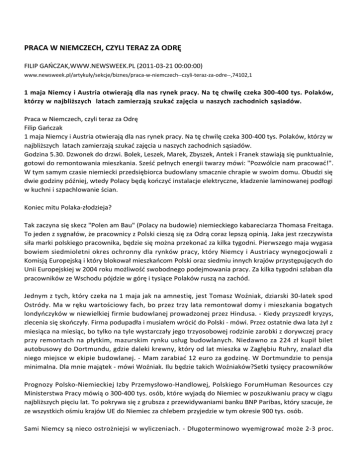 PRACA W NIEMCZECH, CZYLI TERAZ ZA ODRĘ FILIP GAŃCZAK,WWW.NEWSWEEK.PL (2011-03-21 00:00:00) www.newsweek.pl/artykuly/sekcje/biznes/praca-w-niemczech--czyli-teraz-za-odre--,74102,1 1 maja Niemcy i Austria otwierają dla nas rynek pracy. Na tę chwilę czeka 300-400 tys. Polaków, którzy w najbliższych latach zamierzają szukać zajęcia u naszych zachodnich sąsiadów. Praca w Niemczech, czyli teraz za Odrę Filip Gańczak 1 maja Niemcy i Austria otwierają dla nas rynek pracy. Na tę chwilę czeka 300-400 tys. Polaków, którzy w najbliższych latach zamierzają szukać zajęcia u naszych zachodnich sąsiadów. Godzina 5.30. Dzwonek do drzwi. Bolek, Leszek, Marek, Zbyszek, Antek i Franek stawiają się punktualnie, gotowi do remontowania mieszkania. Sześć pełnych energii twarzy mówi: "Pozwólcie nam pracować!". W tym samym czasie niemiecki przedsiębiorca budowlany smacznie chrapie w swoim domu. Obudzi się dwie godziny później, wtedy Polacy będą kończyć instalacje elektryczne, kładzenie laminowanej podłogi w kuchni i szpachlowanie ścian. Koniec mitu Polaka-złodzieja? Tak zaczyna się skecz "Polen am Bau" (Polacy na budowie) niemieckiego kabareciarza Thomasa Freitaga. To jeden z sygnałów, że pracownicy z Polski cieszą się za Odrą coraz lepszą opinią. Jaka jest rzeczywista siła marki polskiego pracownika, będzie się można przekonać za kilka tygodni. Pierwszego maja wygasa bowiem siedmioletni okres ochronny dla rynków pracy, który Niemcy i Austriacy wynegocjowali z Komisją Europejską i który blokował mieszkańcom Polski oraz siedmiu innych krajów przystępujących do Unii Europejskiej w 2004 roku możliwość swobodnego podejmowania pracy. Za kilka tygodni szlaban dla pracowników ze Wschodu pójdzie w górę i tysiące Polaków ruszą na zachód. Jednym z tych, który czeka na 1 maja jak na amnestię, jest Tomasz Woźniak, dziarski 30-latek spod Ostródy. Ma w ręku wartościowy fach, bo przez trzy lata remontował domy i mieszkania bogatych londyńczyków w niewielkiej firmie budowlanej prowadzonej przez Hindusa. - Kiedy przyszedł kryzys, zlecenia się skończyły. Firma podupadła i musiałem wrócić do Polski - mówi. Przez ostatnie dwa lata żył z miesiąca na miesiąc, bo tylko na tyle wystarczały jego trzyosobowej rodzinie zarobki z dorywczej pracy przy remontach na płytkim, mazurskim rynku usług budowlanych. Niedawno za 224 zł kupił bilet autobusowy do Dortmundu, gdzie daleki krewny, który od lat mieszka w Zagłębiu Ruhry, znalazł dla niego miejsce w ekipie budowlanej. - Mam zarabiać 12 euro za godzinę. W Dortmundzie to pensja minimalna. Dla mnie majątek - mówi Woźniak. Ilu będzie takich Woźniaków?Setki tysięcy pracowników Prognozy Polsko-Niemieckiej Izby Przemysłowo-Handlowej, Polskiego ForumHuman Resources czy Ministerstwa Pracy mówią o 300-400 tys. osób, które wyjadą do Niemiec w poszukiwaniu pracy w ciągu najbliższych pięciu lat. To pokrywa się z grubsza z przewidywaniami banku BNP Paribas, który szacuje, że ze wszystkich ośmiu krajów UE do Niemiec za chlebem przyjedzie w tym okresie 900 tys. osób. Sami Niemcy są nieco ostrożniejsi w wyliczeniach. - Długoterminowo wyemigrować może 2-3 proc. ludności nowych krajów członkowskich. Krótkoterminowo napływ ludności z Polski wyniesie około 85 tysięcy osób rocznie - tłumaczy "Newsweekowi" Holger Schäfer z Instytutu Gospodarki Niemieckiej w Kolonii. - Do tego trzeba doliczyć 200 tysięcy Polaków, którzy pracują w Niemczech na czarno i po 1 maja skorzystają z możliwości zalegalizowania swojej pracy - dodaje Artur Ragan, specjalista z agencji doradztwa personalnego Work Express, która rekrutuje Polaków do pracy w NiemczechSetki tysięcy pracowników 1 maja Niemcy i Austria otwierają dla nas rynek pracy. Na tę chwilę czeka 300-400 tys. Polaków, którzy w najbliższych latach zamierzają szukać zajęcia u naszych zachodnich sąsiadów. Szok na Wyspach Nie można oczywiście wykluczać, że prognozy już po paru tygodniach wezmą w łeb. Tak jak latem 2004 roku, kiedy dla obywateli nowych krajów Unii otworzyły się rynki brytyjski i irlandzki. Z Polski zamiast spodziewanych 60 tysięcy Wyspy najechało ponad milion poszukiwaczy pracy, którzy znaleźli zatrudnienie jako pracownicy budowlani, pomoce domowe, opiekunowie starszych osób czy kelnerzy. Ilu Polaków wyjdzie za Odrę, nie wiadomo, ale wiadomo, że w Niemczech brakuje rąk do pracy. Pracodawcy zgłaszają ponad pół miliona wakatów (w Austrii 50 tys.), a najpilniej poszukiwane specjalności to przedstawiciele handlowi, lekarze i pielęgniarki, informatycy i inżynierowie. Powód tego deficytu siły roboczej - obok nadspodziewanie dobrej pokryzysowej koniunktury - jest zaskakujący. W ostatnich pięciu latach w poszukiwaniu lepiej płatnej pracy co roku kilkadziesiąt tysięcy Niemców wyjeżdżało z kraju do Szwajcarii, Wielkiej Brytanii czy Stanów Zjednoczonych. Głównie byli to cenni specjaliści - lekarze, inżynierowie czy menedżerowie. Wykształceni wolą Polskę Jednak nadzieje, że zastąpią ich wysoko wykwalifikowani pracownicy ze Wschodu, wydają się przesadne. W związku z niedoborem specjalistów - brakuje m.in. prawie 30 tys. informatyków - Niemcy już w listopadzie 2007 roku otworzyły swój rynek pracy dla inżynierów z nowych krajów UE. Ale większego zainteresowania ofertą niemieckich pracodawców nie było. Z sondy przeprowadzonej przez firmę doradztwa personalnego Bank Danych o Inżynierach wynika, że Niemcy są na szarym końcu europejskiej listy krajów, w których pracę rozważałby polski inżynier. Ze względów językowych i z racji wyższych stawek bezapelacyjnie wygrywa Wielka Brytania. Z tych samych powodów większego zainteresowania nie budzą też niemieckie oferty pracy dla lekarzy. W branżowych czasopismach można przebierać w ogłoszeniach, ale korzysta z nich niewielu. - Po co miałabym uczyć się przez rok niemieckiego, jecha