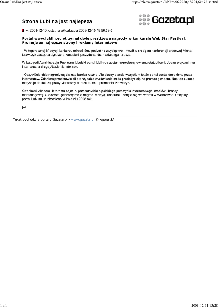 Strona Lublina jest najlepsza 1z1 http://miasta.gazeta.pl/lublin/2029020,48724,6049210.html Strona Lublina jest najlepsza jwr 2008-12-10, ostatnia aktualizacja 2008-12-10 18:56:59.0 Portal www.lublin.eu otrzymał dwie prestiŜowe nagrody w konkursie Web Star Festival. Promuje on najlepsze strony i reklamy internetowe - W tegorocznej IV edycji konkursu odnieśliśmy podwójne zwycięstwo - mówił w środę na konferencji prasowej Michał Krawczyk zastępca dyrektora kancelarii prezydenta ds. marketingu ratusza. W kategorii Administracja Publiczna lubelski portal lublin.eu został nagrodzony dwiema statuetkami. Jedną przyznali mu internauci, a drugą Akademia Internetu. - Oczywiście obie nagrody są dla nas bardzo waŜne. Ale cieszy przede wszystkim to, Ŝe portal został doceniony przez internautów. Zdaniem przedstawicieli branŜy takie wyróŜnienie moŜe przełoŜyć się na promocję miasta. Nas ten sukces motywuje do dalszej pracy. Jesteśmy bardzo dumni - promieniał Krawczyk. Członkami Akademii Internetu są m.in. przedstawiciele polskiego przemysłu internetowego, mediów i branŜy marketingowej. Uroczysta gala wręczania nagród IV edycji konkursu, odbyła się we wtorek w Warszawie. Oficjalny portal Lublina uruchomiono w kwietniu 2008 roku. jwr Tekst pochodzi z portalu Gazeta.pl - www.gazeta.pl © Agora SA 2008-12-11 13:28