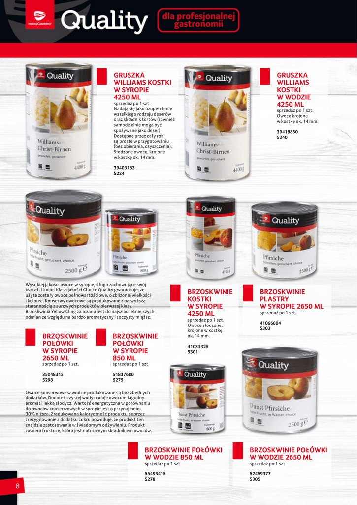 GRUSZKA WILLIAMS KOSTKI GRUSZKA WILLIAMS W SYROPIE 4250 ML KOSTKI W WODZIE 4250 ML sprzedaż po 1 szt. Nadają się jako uzupełnienie wszelkiego rodzaju deserów oraz składnik tortów (również samodzielnie mogą być spożywane jako deser). Dostępne przez cały rok, są proste w przygotowaniu (bez obierania, czyszczenia). Słodzone owoce, krojone w kostkę ok. 14 mm. sprzedaż po 1 szt. Owoce krojone w kostkę ok. 14 mm. 39418850 5240 39403183 5224 Wysokiej jakości owoce w syropie, długo zachowujące swój kształt i kolor. Klasa jakości Choice Quality gwarantuje, że użyte zostały owoce pełnowartościowe, o zbliżonej wielkości i kolorze. Konserwy owocowe są produkowane z najwyższą starannością z surowych produktów pierwszej klasy. Brzoskwinia Yellow Cling zaliczana jest do najszlachetniejszych odmian ze względu na bardzo aromatyczny i soczysty miąższ. BRZOSKWINIE BRZOSKWINIE KOSTKI PLASTRY BRZOSKWINIE BRZOSKWINIE POŁÓWKI POŁÓWKI W SYROPIE 2650 ML W SYROPIE 850 ML 35048313 5298 51837680 5275 sprzedaż po 1 szt. W SYROPIE 4250 ML sprzedaż po 1 szt. Owoce słodzone, krojone w kostkę ok. 14 mm. W SYROPIE 2650 ML sprzedaż po 1 szt. 41066804 5303 41033325 5301 sprzedaż po 1 szt. Owoce konserwowe w wodzie produkowane są bez zbędnych dodatków. Dodatek czystej wody nadaje owocom łagodny aromat i lekką słodycz. Wartość energetyczna w porównaniu do owoców konserwowych w syropie jest o przynajmniej 30% niższa. Zredukowana kaloryczność produktu poprzez zrezygnowanie z dodatku cukru powoduje, że produkt ten znajdzie zastosowanie w świadomym odżywianiu. Produkt zawiera fruktozę, która jest naturalnym składnikiem owoców. POŁÓWKI BRZOSKWINIE POŁÓWKI WBRZOSKWINIE WODZIE 850 ML W WODZIE 2650 ML 8 sprzedaż po 1 szt. sprzedaż po 1 szt. 55493415 5278 52459377 5305