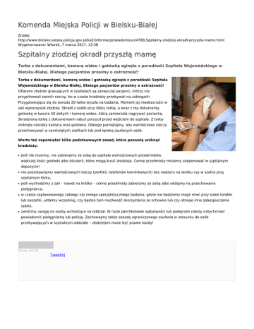 Komenda Miejska Policji w Bielsku-Białej Źródło: http://www.bielsko.slaska.policja.gov.pl/ka2/informacje/wiadomosci/4768,Szpitalny-zlodziej-okradl-przyszla-mame.html Wygenerowano: Wtorek, 7 marca 2017, 13:38 Szpitalny złodziej okradł przyszłą mamę Torba z dokumentami, kamerą wideo i gotówką zginęła z porodówki Szpitala Wojewódzkiego w Bielsku-Białej. Dlatego pacjentów prosimy o ostrożność! Torba z dokumentami, kamerą wideo i gotówką zginęła z porodówki Szpitala Wojewódzkiego w Bielsku-Białej. Dlatego pacjentów prosimy o ostrożność! Ofiarami złodziei grasujących w szpitalach są zazwyczaj pacjenci, którzy nie przypilnowali swoich rzeczy, bo w czasie kradzieży przebywali na zabiegach. Przygotowująca się do porodu 20-latka wyszła na badania. Moment jej nieobecności w sali wykorzystał złodziej. Skradł z szafki przy łóżku torbę, a wraz z nią dokumenty, gotówkę w kwocie 50 złotych i kamerę wideo, którą zamierzała nagrywać pociechę. Skradzioną torbę z dokumentami rabuś porzucił przed wejściem do szpitala. Z torby zniknęła niestety kamera oraz gotówka. Dlatego pamiętajmy, aby wartościowe rzeczy przechowywać w zamkniętych szafkach lub pod opieką zaufanych osób. Warto też zapamiętać kilka podstawowych zasad, które pozwolą uniknąć kradzieży: ● jeśli nie musimy, nie zabierajmy ze sobą do szpitala wartościowych przedmiotów, większej ilości gotówki albo biżuterii, które mogą kusić złodzieja. Cenne przedmioty możemy zdeponować w szpitalnym depozycie! ● nie pozostawiajmy wartościowych rzeczy (portfeli, telefonów komórkowych) bez nadzoru na stoliku czy w szafce przy szpitalnym łóżku, ● jeśli wychodzimy z sali – nawet na krótko – cenne przedmioty zabierzmy ze sobą albo oddajmy na przechowanie pielęgniarce, ● w czasie zaplanowanego zabiegu lub innego specjalistycznego badania, gdzie nie będziemy mogli mieć przy sobie torebki lub saszetki, ustalmy wcześniej, czy będzie tam możliwość skorzystania ze schowka lub czy istnieje inne zabezpieczenie szatni, ● zwróćmy uwagę na osoby wchodzące na oddział. W razie jakichkolwiek wątpliwości lub podejrzeń należy natychmiast powiadomić pielęgniarkę lub policję. Zachowajmy także zasadę ograniczonego zaufania w stosunku do osób przebywających w szpitalnym oddziale – złodziejem może być prawie każdy! Ocena: 0/5 (0) Tweetnij