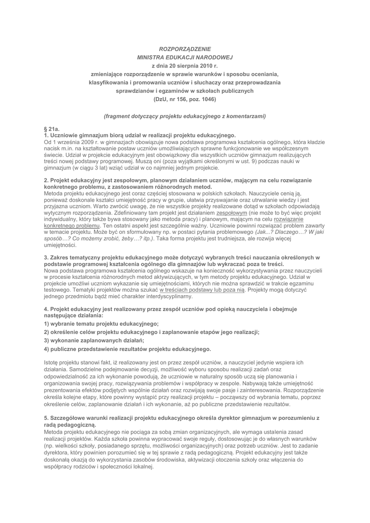 ROZPORZĄDZENIE MINISTRA EDUKACJI NARODOWEJ z dnia 20 sierpnia 2010 r. zmieniające rozporządzenie w sprawie warunków i sposobu oceniania, klasyfikowania i promowania uczniów i słuchaczy oraz przeprowadzania sprawdzianów i egzaminów w szkołach publicznych (DzU, nr 156, poz. 1046) (fragment dotyczący projektu edukacyjnego z komentarzami) § 21a. 1. Uczniowie gimnazjum biorą udział w realizacji projektu edukacyjnego. Od 1 września 2009 r. w gimnazjach obowiązuje nowa podstawa programowa kształcenia ogólnego, która kładzie nacisk m.in. na kształtowanie postaw uczniów umożliwiających sprawne funkcjonowanie we współczesnym świecie. Udział w projekcie edukacyjnym jest obowiązkowy dla wszystkich uczniów gimnazjum realizujących treści nowej podstawy programowej. Muszą oni (poza wyjątkami określonymi w ust. 9) podczas nauki w gimnazjum (w ciągu 3 lat) wziąć udział w co najmniej jednym projekcie. 2. Projekt edukacyjny jest zespołowym, planowym działaniem uczniów, mającym na celu rozwiązanie konkretnego problemu, z zastosowaniem różnorodnych metod. Metoda projektu edukacyjnego jest coraz częściej stosowana w polskich szkołach. Nauczyciele cenią ją, ponieważ doskonale kształci umiejętność pracy w grupie, ułatwia przyswajanie oraz utrwalanie wiedzy i jest przyjazna uczniom. Warto zwrócić uwagę, że nie wszystkie projekty realizowane dotąd w szkołach odpowiadają wytycznym rozporządzenia. Zdefiniowany tam projekt jest działaniem zespołowym (nie może to być więc projekt indywidualny, który także bywa stosowany jako metoda pracy) i planowym, mającym na celu rozwiązanie konkretnego problemu. Ten ostatni aspekt jest szczególnie ważny. Uczniowie powinni rozwiązać problem zawarty w temacie projektu. Może być on sformułowany np. w postaci pytania problemowego (Jak...? Dlaczego…? W jaki sposób…? Co możemy zrobić, żeby…? itp.). Taka forma projektu jest trudniejsza, ale rozwija więcej umiejętności. 3. Zakres tematyczny projektu edukacyjnego może dotyczyć wybranych treści nauczania określonych w podstawie programowej kształcenia ogólnego dla gimnazjów lub wykraczać poza te treści. Nowa podstawa programowa kształcenia ogólnego wskazuje na konieczność wykorzystywania przez nauczycieli w procesie kształcenia różnorodnych metod aktywizujących, w tym metody projektu edukacyjnego. Udział w projekcie umożliwi uczniom wykazanie się umiejętnościami, których nie można sprawdzić w trakcie egzaminu testowego. Tematyki projektów można szukać w treściach podstawy lub poza nią. Projekty mogą dotyczyć jednego przedmiotu bądź mieć charakter interdyscyplinarny. 4. Projekt edukacyjny jest realizowany przez zespół uczniów pod opieką nauczyciela i obejmuje następujące działania: 1) wybranie tematu projektu edukacyjnego; 2) określenie celów projektu edukacyjnego i zaplanowanie etapów jego realizacji; 3) wykonanie zaplanowanych działań; 4) publiczne przedstawienie rezultatów projektu edukacyjnego. Istotę projektu stanowi fakt, iż realizowany jest on przez zespół uczniów, a nauczyciel jedynie wspiera ich działania. Samodzielne podejmowanie decyzji, możliwość wyboru sposobu realizacji zadań oraz odpowiedzialność za ich wykonanie powodują, że uczniowie w naturalny sposób uczą się planowania i organizowania swojej pracy, rozwiązywania problemów i współpracy w zespole. Nabywają także umiejętność prezentowania efektów podjętych wspólnie działań oraz rozwijają swoje pasje i zainteresowania. Rozporządzenie określa kolejne etapy, które powinny wystąpić przy realizacji projektu – począwszy od wybrania tematu, poprzez określenie celów, zaplanowanie działań i ich wykonanie, aż po publiczne przedstawienie rezultatów. 5. Szczegółowe warunki realizacji projektu edukacyjnego określa dyrektor gimnazjum w porozumieniu z radą pedagogiczną. Metoda projektu edukacyjnego nie pociąga za sobą zmian organizacyjnych, ale wymaga ustalenia zasad realizacji projektów. Każda szkoła powinna wypracować swoje reguły, dostosowując je do własnych warunków (np. wielkości szkoły, posiadanego sprzętu, możliwości organizacyjnych) oraz potrzeb uczniów. Jest to zadanie dyrektora, który powinien porozumieć się w tej sprawie z radą pedagogiczną. Projekt edukacyjny jest także doskonałą okazją do wykorzystania zasobów środowiska, aktywizacji otoczenia szkoły oraz włączenia do współpracy rodziców i społeczności lokalnej. 6. Kryteria oceniania zachowania ucznia gimnazjum zawarte w ocenianiu wewnątrzszkolnym uwzględniają udział ucznia w realizacji projektu edukacyjnego. Ponieważ celem wprowadzenia obowiązku realizacji zespołowego projektu edukacyjnego przez uczniów gimnazjum jest kształtowanie odpowiednich postaw i umiejętności uczniów, proponuje się, aby udział ucznia w realizacji projektu edukacyjnego był brany pod uwagę przy ustalaniu oceny zachowania ucznia. Szkoły są zatem zobligowane do uwzględnienia udziału ucznia w realizacji projektu edukacyjnego w kryteriach oceniania zachowania, zawartych w wewnątrzszkolnym systemie oceniania. Szkoły powinny dostosować swoje statuty w tym zakresie do 30 listopada 2010 r. 7. Wychowawca klasy na początku roku szkolnego, w którym uczniowie będą realizować projekt edukacyjny, informuje uczniów i ich rodziców (prawnych opiekunów) o warunkach realizacji projektu edukacyjnego. Zapoznanie uczniów i rodziców z warunkami realizacji projektu to zadanie wychowawcy, z którego powinien się wywiązać na początku roku szkolnego. 8. Informacje o udziale ucznia w realizacji projektu edukacyjnego oraz temat projektu edukacyjnego wpisuje się na świadectwie ukończenia gimnazjum. Bez względu na to, w której klasie uczeń zrealizuje projekt edukacyjny, informacja o tym udziale oraz temat projektu będą wpisane na świadectwie ukończenia gimnazjum. 9. W szczególnie uzasadnionych przypadkach, uniemo