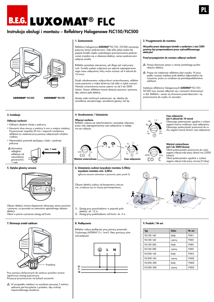 PL B.E.G. LUXOMAT ® FLC Instrukcja obsługi i montażu – Reflektory Halogenowe FLC150/FLC500 1. Zastosowanie 2. Przygotowanie do montażu Reflektory halogenowe LUXOMAT FLC150 i FLC500 zawierają pasywny sensor podczerwieni. Gdy tylko jakaś osoba lub pojazd (źródło ciepła wydzielające promieniowanie podczerwone) znajdzie się w obszarze detekcji, sensor podczerwieni załącza światło. ® Wszystkie prace obejmujące kontakt z zasilaniem z sieci 230V powinny być przeprowadzone przez wykwalifikowanego elektryka! Przed przystąpieniem do montażu odłączyć zasilanie! roszę skierować sensor w stronę centralnego punktu P obszaru detekcji. Reflektor pozostaje zaświecony, jak długo jest wykrywany ruch. Światło zostaje wyłączone po upływie zaprogramowanego czasu załączenia, który może wynosić od 4 sekund do 10 minut. Dzięki wbudowanemu wyłącznikowi zmierzchowemu, reflektor może pracować w trybie dzień-noc lub tylko w trybie nocnym. Wartość zmierzchową można ustawić na od 2 do 2000 luksów. Sensor reflektora można obracać poziomo i pionowo, aby ustawić pole detekcji. LUXOMAT ® FLC500 LUXOMAT ® FLC150 Istnieje wiele możliwych zastosowań, np. idealne do oświetlenia zewnętrznego, oświetlenia garaży, hal itp. Instalacja reflektorów halogenowych LUXOMAT® FLC150 i FLC500 musi zawsze odbywać się z sensorem skierowanym w dół. Reflektor i sensor są chronione przed deszczem i są przeznaczone do użytku na zewnątrz. 5 Uruchomienie / Ustawienia 4. 3. Instalacja Odłączyć zasilanie! • Odkręcić obydwa wkręty z pokrywy. • Nawiercić dwa otwory o średnicy 6 mm w miejscu instalacji. Przymocować rozpórkę 50 mm i wspornik montażowy reflektora (w zestawie) przy pomocy załączonych wkrętów i kołków. Włączyć zasilanie Reflektor włącza się natychmiastowo i pozostaje włączony przez cały zaprogramowany czas załączenia; a następnie się wyłącza. 50 1.2 6 20 10 min 4 sec • Wprowadzić przewód zasilający z boku i zamknąć pokrywę. inimalna M odległość reflektora od naświetlanej powierzchni: 1 metr roszę nie instalować reflektora zbyt wysoko. W przyP padku wyższej instalacji pole detekcji odpowiednio się rozszerza; przez co zwiększa się prawdopodobieństwo zakłóceń. 50 1.2 6 20 min. 1 metr 2000 2 Lux 4 sec Wartość zmierzchowa 8 75. Optyka głowicy sensora 10 min 2000 2 Lux Czas załączenia Czas załączenia (od 4 sekund do 10 minut) Obracając potencjometr zgodnie z ruchem zegara można zwiększyć czas załączenia. Obracając potencjometr przeciwnie do ruchu zegara można skrócić czas załączenia. Wartość zmierzchowa (od 2 do 2000 luksów) Obrót potencjometru przeciwnie do ruchu zegara włącza tryb pracy dzień/noc (2000 luksów). Obrót potencjometru zgodnie z ruchem zegara włącza tryb pracy nocnej (2 luksy). 6. Ustawianie czułości (wysokość montażu 2,50m); wysokość montażu min. 2,00 m (głowica sensora ustawiana w poziomie, patrz punkt 5) 2.50 m 2.50 m Obszar detekcji zależy od temperatury otoczenia: zwiększa się im niższa jest temperatura. 8. Podłączenie L Przy pomocy dołączonych do zestawu przesłon można ograniczyć zasięg poprzeczny. Proszę je przymocować na bokach soczewki. przypadku instalacji na wysokości powyżej 3 metrów, W zalecane jest korzystanie z przesłon, aby uniknąć nieprawidłowego działania. L N 4m m 10 m / Nr art. 9. Produkt 11 Reflektor należy podłączać przy pomocy przewodu 3-żyłowego (H05RN-F 3 x 1mm²). Patrz poniższy schemat połączeń. Przesłony 10 m 200° 12 7.9Eliminacja źródeł zakłóceń 12 m 1) Zasięg przy przechodzeniu w poprzek pola detekcji: ok. 12 m 2) Zasięg przy podchodzeniu od frontu: ok. 4 m 4m 140° Obszar detekcji można dopasować obracając sensor poziomo i pionowo, co pozwala na ustawienie optymalnego obszaru detekcji. Obrót w pionie wyznacza zasięg od frontu. N Typ Kolor Nr art. FLC150-140 biały 91811 FLC150-140 czarny 91831 FLC150-200 biały 91801 FLC150-200 czarny 91821 FLC500-140 biały 91812 FLC500-140 czarny 91832 FLC500-200 biały 91802 FLC500-200 czarny 91822 13 10. Specyfikacja techniczna 13. Montaż lub wymiana żarówki halogenowej 12. Akcesoria instalacyjne Zasilanie: 230 V~ ±10 % Moc: 150/140-200 maks. 150 W 500/140-200 maks. 500 W Zasięg: ok. 12 m (wysokość 2,50m /18°C) Kąt detekcji: 140° / 200° Czas załączenia: ok. 4 s. - 10 min. Wartość zmierzchowa: ok. 2 - 2000Lux Stopień ochrony/klasa: IP44 / I / Obudowa: odlew aluminium Temperatura otoczenia: -25°C do +50°C Wymiary: FLC150 145 x 124 x 195 mm FLC500 160 x 184 x 242 mm UWAGA: Instalacja musi być wykonywana przez fachowca! Zgodność elektromagnetyczna Nie można wykluczyć przypadków niepożądanego załączenia w przypadku umieszczenia reflektora w obszarze oddziaływania silnych nadajników fal radiowych (np. krótkofalówki, CB radia, telefony komórkowe itp.). Jednakże te zjawiska nie powodują żadnych uszkodzeń technologii sensora. Ponadto, sensor wyłącza reflektor, gdy tylko zniknie źródło zakłóceń HF. Przed wymianą żarówki halogenowej zawsze należy sprawdzić, czy zasilanie jest odłączone. Uwaga: Reflektor może osiągać bardzo wysokie temperatury! • Proszę zaczekać, aż lampa i obudowa przestygnie. •Wykręcić śruby z obudowy reflektora i otworzyć obudowę. •Mocno uchwycić wymienianą żarówkę halogenową i wyjąć ją z oprawki. •Proszę nie dotykać nowych żarówek gołymi rękami. • Włożyć żarówkę halogenową do oprawki. •Zamknąć obudowę, zwracając uwagę na prawidłowe położenie pierścienia uszczelniającego. • Zablokować obudowę przy pomocy wkrętów mocujących. . 11. Wymiary (mm) Puszka rozgałęźna 105 Lampa halogenowa 500 W/150 W 118 124 Wspornik 77 Czujnik PIR 14. Rozwiązywanie problemów 145 LUXOMAT ® FLC-150 130 Możliwy problem Rozwiązanie - Żarówka halogenowa jest wadliwa. - Brak zasilania sieciowego. -Wartość zmierzchowa progu załączenia jest niepr