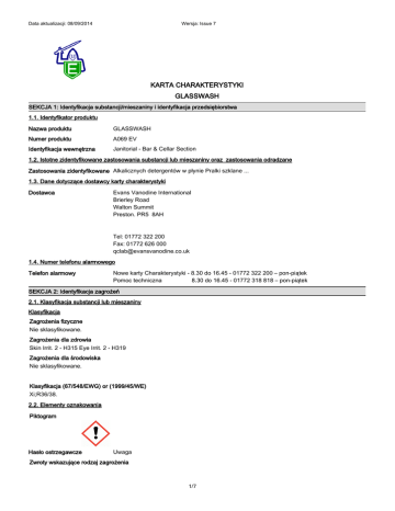 Data aktualizacji: 08/09/2014 Wersja: Issue 7 KARTA CHARAKTERYSTYKI GLASSWASH SEKCJA 1: Identyfikacja substancji/mieszaniny i identyfikacja przedsiębiorstwa 1.1. Identyfikator produktu Nazwa produktu GLASSWASH Numer produktu A069 EV Identyfikacja wewnętrzna Janitorial - Bar & Cellar Section 1.2. Istotne zidentyfikowane zastosowania substancji lub mieszaniny oraz zastosowania odradzane Zastosowania zidentyfikowane Alkalicznych detergentów w płynie Pralki szklane ... 1.3. Dane dotyczące dostawcy karty charakterystyki Dostawca Evans Vanodine International Brierley Road Walton Summit Preston. PR5 8AH Tel: 01772 322 200 Fax: 01772 626 000 [email protected] 1.4. Numer telefonu alarmowego Telefon alarmowy Nowe karty Charakterystyki - 8.30 do 16.45 - 01772 322 200 – pon-piątek Pomoc techniczna 8.30 do 16.45 - 01772 318 818 – pon-piątek SEKCJA 2: Identyfikacja zagrożeń 2.1. Klasyfikacja substancji lub mieszaniny Klasyfikacja Zagrożenia fizyczne Nie sklasyfikowane. Zagrożenia dla zdrowia Skin Irrit. 2 - H315 Eye Irrit. 2 - H319 Zagrożenia dla środowiska Nie sklasyfikowane. Klasyfikacja (67/548/EWG) or (1999/45/WE) Xi;R36/38. 2.2. Elementy oznakowania Piktogram Hasło ostrzegawcze Uwaga Zwroty wskazujące rodzaj zagrożenia 1/7 Data aktualizacji: 08/09/2014 Wersja: Issue 7 GLASSWASH H315 Działa drażniąco na skórę. H319 Działa drażniąco na oczy. Zwroty wskazujące środki ostrożności P280 Stosować rękawice ochronne/odzież ochronną/ochronę oczu/ochronę twarzy. P302+P352 W PRZYPADKU KONTAKTU ZE SKÓRĄ: Umyć dużą ilością wody. P305+P351+P338 W PRZYPADKU DOSTANIA SIĘ DO OCZU: Ostrożnie płukać wodą przez kilka minut. Wyjąć soczewki kontaktowe, jeżeli są i można je łatwo usunąć. Nadal płukać. P332+P313 W przypadku wystąpienia podrażnienia skóry: Zasięgnąć porady/zgłosić się pod opiekę lekarza. P337+P313 Wyjąć soczewki kontaktowe, jeżeli są i można je łatwo usunąć. Nadal płukać. P102 Chronić przed dziećmi. P301 W PRZYPADKU POŁKNIĘCIA: P313 Zasięgnąć porady/zgłosić się pod opiekę lekarza. P501 Zawartość/pojemnik usuwać zgodnie z lokalnymi przepisami. Zawiera WODOROTLENEK SODU 2.3. Inne zagrożenia Produkt nie zawiera żadnych substancji sklasyfikowanych jako PBT lub vPvB. SEKCJA 3: Skład/informacja o składnikach 3.2. Mieszaniny 1-3% WODOROTLENEK SODU Numer CAS: 1310-73-2 Numer WE: 215-185-5 Numer rejestracji REACH: 01-2119457892-27-xxxx Klasyfikacja Klasyfikacja (67/548/EWG) or (1999/45/WE) Met. Corr. 1 - H290 C;R35 Skin Corr. 1A - H314 Pełny tekst zwrotów wskazujących rodzaj zagrożenia (zwrotów R) i określeń zagrożeń jest przedstawiony w sekcji 16. SEKCJA 4: Środki pierwszej pomocy 4.1. Opis środków pierwszej pomocy Wdychanie Mało prawdopodobna droga narażenia, gdyż produkt nie zawiera substancji lotnych. Jeśli wchłonięto rozpyloną ciecz/mgły, należy wykonać następujące czynności. Przenieść poszkodowanego na świeże powietrze i zapewnić ciepło i odpoczynek w pozycji umożliwiającej oddychanie. Połknięcie Nie wywoływać wymiotów. Podać duże ilości wody do picia. Zasięgnąć pomocy medycznej. Kontakt ze skórą Umyć dużą ilością wody. Get medical attention if irritation persists after washing. Kontakt z oczami Usunąć szkła kontaktowe i otworzyć szeroko powieki. Kontynuować płukanie przez co najmniej 15 minut. Zasięgnąć porady medycznej jeśli dyskomfort się utrzymuje. 4.2. Najważniejsze ostre i opóźnione objawy oraz skutki narażenia Informacje ogólne Nasilenie opisanych objawów będzie różnić się w zależności od stężenia i czasu narażenia. Wdychanie Podrażnienie nosa, gardła i dróg oddechowych. Połknięcie Może wywoływać złe samopoczucie w przypadku spożycia. Kontakt ze skórą 2/7 Data aktualizacji: 08/09/2014 Kontakt ze skórą Wersja: Issue 7 GLASSWASH Podrażnienie skóry. Wydłużony kontakt ze skórą może powodować zaczerwienienie i podrażnienie. Kontakt z oczami Może powodować tymczasowe podrażnienie oczu. Długotrwały kontakt może powodować zaczerwienienie i/lub łzawienie. 4.3. Wskazania dotyczące wszelkiej natychmiastowej pomocy lekarskiej i szczególnego postępowania z poszkodowanym Wskazówki dla lekarza Leczyć objawowo. SEKCJA 5: Postępowanie w przypadku pożaru 5.1. Środki gaśnicze Odpowiednie środki gaśnicze Produkt nie jest łatwopalny. Używać środków gaśniczych odpowiednich dla palących się materiałów w najbliższym otoczeniu. 5.2. Szczególne zagrożenia związane z substancją lub mieszaniną Szczególne zagrożenia Produkty rozkładu termicznego lub spalania mogą zawierać następujące substancje: Drażniące gazy lub pary. 5.3. Informacje dla straży pożarnej Specjalny sprzęt ochronny dla strażaków Nosić aparat oddechowy z niezależnym dopływem powietrza i odpowiednie ubranie ochronne. SEKCJA 6: Postępowanie w przypadku niezamierzonego uwolnienia do środowiska 6.1. Indywidualne środki ostrożności, wyposażenie ochronne i procedury w sytuacjach awaryjnych Osobiste środki ostrożności Unikać zanieczyszczenia skóry i oczu. 6.2. Środki ostrożności w zakresie ochrony środowiska Środki ostrożności w zakresie ochrony środowiska Wycieki i niekontrolowane zrzuty do cieków wodnych muszą być niezwłocznie zgłaszane organom ochrony środowiska lub innym odpowiednim organom. 6.3. Metody i materiały zapobiegające rozprzestrzenianiu się skażenia i służące do usuwania skażenia Metody usuwania skażenia Małe ilości: Duże ilości: Wyciek spłukać dużą ilością wody. Zaabsorbować wyciek piaskiem, ziemią lub innym niepalnym materiałem. Zebrać i umieścić w odpowiednich pojemnikach na odpady i szczelnie zamknąć. 6.4. Odniesienia do innych sekcji Odniesienia do innych sekcji Informacje dotyczące odpowiedniego sprzętu ochrony osobistej, patrz sekcja 8. SEKCJA 7: Postępowanie z substancjami i mieszaninami oraz ich magazynowanie Środki ostrożności dotyczące bezpie