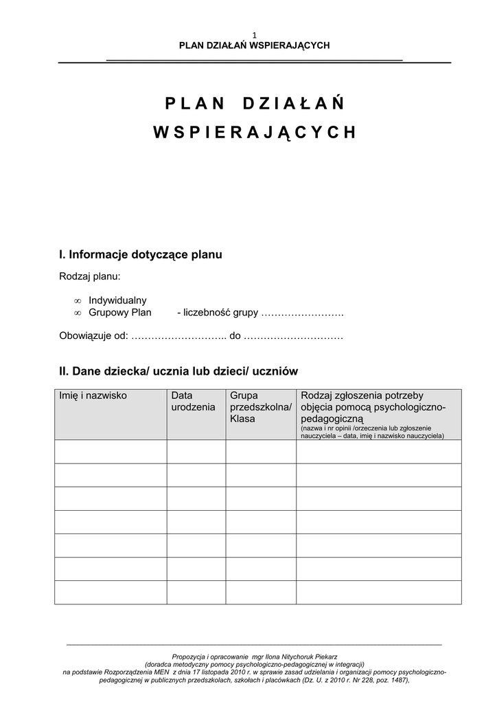 1 PLAN DZIAŁAŃ WSPIERAJĄCYCH __________________________________________________________ PLAN DZIAŁAŃ WSPIERAJĄCYCH I. Informacje dotyczące planu Rodzaj planu: • Indywidualny • Grupowy Plan - liczebność grupy ……………………. Obowiązuje od: ……………………….. do ………………………… II. Dane dziecka/ ucznia lub dzieci/ uczniów Imię i nazwisko Data urodzenia Grupa Rodzaj zgłoszenia potrzeby przedszkolna/ objęcia pomocą psychologicznoKlasa pedagogiczną (nazwa i nr opinii /orzeczenia lub zgłoszenie nauczyciela – data, imię i nazwisko nauczyciela) _____________________________________________________________________________________________________ Propozycja i opracowanie mgr Ilona Nitychoruk Piekarz (doradca metodyczny pomocy psychologiczno-pedagogicznej w integracji) na podstawie Rozporządzenia MEN z dnia 17 listopada 2010 r. w sprawie zasad udzielania i organizacji pomocy psychologicznopedagogicznej w publicznych przedszkolach, szkołach i placówkach (Dz. U. z 2010 r. Nr 228, poz. 1487), 2 PLAN DZIAŁAŃ WSPIERAJĄCYCH __________________________________________________________ …………………… (data) III. Informacje dotyczące spotkania Zespołu nauczycieli i specjalistów Data spotkania: …………………………. Cel spotkania: • Stworzenie Planu Działań Wspierających • Analiza Planu Działań Wspierających • Analiza celów • Inny cel spotkania: …………………………………………………………………………………………………………………………………………………… ……………………………………………………………………………………………………………………………………….………… IV. Skład zespołu nauczycieli i specjalistów Imię i nazwisko Funkcja pełniona w przedszkolu / szkole Podpis nauczyciela 1. 2. 3. 4. 5. _____________________________________________________________________________________________________ Propozycja i opracowanie mgr Ilona Nitychoruk Piekarz (doradca metodyczny pomocy psychologiczno-pedagogicznej w integracji) na podstawie Rozporządzenia MEN z dnia 17 listopada 2010 r. w sprawie zasad udzielania i organizacji pomocy psychologicznopedagogicznej w publicznych przedszkolach, szkołach i placówkach (Dz. U. z 2010 r. Nr 228, poz. 1487), 3 PLAN DZIAŁAŃ WSPIERAJĄCYCH __________________________________________________________ ……………………… (data) V. Cele ogólne (do osiągnięcia w zakresie, w którym wymagana jest pomoc psychologiczno-pedagogiczna) ………………………………………………………………………………………………….. ………………………………………………………………………………………………….. ……………………………..…………………………………………………………………… ……………………………..…………………………………………………………………… ………………………………………………………………………………………………….. VI. Forma pomocy psychologiczno-pedagogicznej (zatwierdzona przez Dyrektora Przedszkole / Szkoły) Forma pomocy psychologicznopedagogicznej Osoba prowadząca Wymiar godzin, czas realizacji Podpis nauczyciela 1. 2. 3. 4. 5. 6. 7. VII. Metody pracy: • • • • • ……………………………………………………………………………………………… ……………………………………………………….…………………………………….. ……………………………………………………….…………………………………….. ……………………………………………………….…………………………………….. ……………………………………………………….…………………………………….. _____________________________________________________________________________________________________ Propozycja i opracowanie mgr Ilona Nitychoruk Piekarz (doradca metodyczny pomocy psychologiczno-pedagogicznej w integracji) na podstawie Rozporządzenia MEN z dnia 17 listopada 2010 r. w sprawie zasad udzielania i organizacji pomocy psychologicznopedagogicznej w publicznych przedszkolach, szkołach i placówkach (Dz. U. z 2010 r. Nr 228, poz. 1487), 4 PLAN DZIAŁAŃ WSPIERAJĄCYCH __________________________________________________________ ……………………… (data) VIII. Zakres dostosowania wymagań edukacyjnych (- w przedszkolu we wszystkich obszarach działalności edukacyjnej; - w szkole na wszystkich przedmiotach nauczania) ……………………………………………………….…………………………………………….. …………….……………………………………………………………………………………….. ……………………………………………………………………………………………………… ……………………………………………………………………………………………………… ……………………………………………………………………………………………………… ……………………………………………………………………………………………………… ……………………………………………………….…………………………………………….. …………….……………………………………………………………………………………….. ……………………………………………………………………………………………………… ……………………………………………………………………………………………………… ………………………………………………………………………