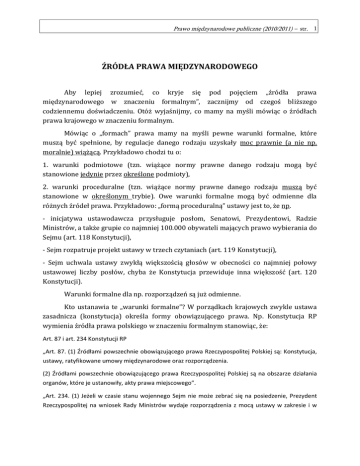 Prawo międzynarodowe publiczne (2010/2011) – str. 1 ŹRÓDŁA PRAWA MIĘDZYNARODOWEGO Aby lepiej zrozumieć, co kryje się pod pojęciem „źródła prawa międzynarodowego w znaczeniu formalnym”, zacznijmy od czegoś bliższego codziennemu doświadczeniu. Otóż wyjaśnijmy, co mamy na myśli mówiąc o źródłach prawa krajowego w znaczeniu formalnym. Mówiąc o „formach” prawa mamy na myśli pewne warunki formalne, które muszą być spełnione, by regulacje danego rodzaju uzyskały moc prawnie (a nie np. moralnie) wiążącą. Przykładowo chodzi tu o: 1. warunki podmiotowe (tzn. wiążące normy prawne danego rodzaju mogą być stanowione jedynie przez określone podmioty), 2. warunki proceduralne (tzn. wiążące normy prawne danego rodzaju muszą być stanowione w określonym trybie). Owe warunki formalne mogą być odmienne dla różnych źródeł prawa. Przykładowo: „formą proceduralną” ustawy jest to, że np. ‐ inicjatywa ustawodawcza przysługuje posłom, Senatowi, Prezydentowi, Radzie Ministrów, a także grupie co najmniej 100.000 obywateli mających prawo wybierania do Sejmu (art. 118 Konstytucji), ‐ Sejm rozpatruje projekt ustawy w trzech czytaniach (art. 119 Konstytucji), ‐ Sejm uchwala ustawy zwykłą większością głosów w obecności co najmniej połowy ustawowej liczby posłów, chyba że Konstytucja przewiduje inna większość (art. 120 Konstytucji). Warunki formalne dla np. rozporządzeń są już odmienne. Kto ustanawia te „warunki formalne”? W porządkach krajowych zwykle ustawa zasadnicza (konstytucja) określa formy obowiązującego prawa. Np. Konstytucja RP wymienia źródła prawa polskiego w znaczeniu formalnym stanowiąc, że: Art. 87 i art. 234 Konstytucji RP „Art. 87. (1) Źródłami powszechnie obowiązującego prawa Rzeczypospolitej Polskiej są: Konstytucja, ustawy, ratyfikowane umowy międzynarodowe oraz rozporządzenia. (2) Źródłami powszechnie obowiązującego prawa Rzeczypospolitej Polskiej są na obszarze działania organów, które je ustanowiły, akty prawa miejscowego”. „Art. 234. (1) Jeżeli w czasie stanu wojennego Sejm nie może zebrać się na posiedzenie, Prezydent Rzeczypospolitej na wniosek Rady Ministrów wydaje rozporządzenia z mocą ustawy w zakresie i w Prawo międzynarodowe publiczne (2010/2011) – str. 2 granicach określonych w art. 228 ust. 3‐5 [Konstytucji]. Rozporządzenia te podlegają zatwierdzeniu przez Sejm na najbliższym posiedzeniu”. *** Odpowiednika konstytucji krajowych na próżno jednak szukać w prawie międzynarodowym. Prawo międzynarodowe nie ma konstytucji rozumianej jako akt regulujący podstawy ustrojowe społeczności międzynarodowej (i wskazujący np. źródła prawa międzynarodowego). Tradycyjnie przyjmuje się jednak, że niepełny katalog źródeł formalnych prawa międzynarodowego wymieniony jest w art. 38 Statutu MTS. Z przepisu tego wynika, że źródłami prawa międzynarodowego w znaczeniu formalnym są: a) konwencje międzynarodowe (UWAGA: „konwencja”, „umowa” „traktat”, „pakt”, „porozumienie” etc. – to synonimy!), b) zwyczaj międzynarodowy, c) zasady ogólne prawa, uznane przez narody cywilizowane. Za źródła prawa międzynarodowego uznaje się również – obok wymienionych w art. 38 Statutu: d) akty jednostronne państw, e) wiążące uchwały organizacji międzynarodowych. Powyższe wyliczenie jest absolutnie kluczowe dla zrozumienia, w jaki sposób prawo międzynarodowe reguluje stosunki w ramach społeczności międzynarodowej. Dlaczego? Otóż (w pewnym uproszczeniu) prawo międzynarodowe składa się jedynie z takich norm, które „mają formę”: konwencji, zwyczaju, ogólnej zasady prawa, wiążącej uchwały organizacji międzynarodowej lub wynikają z aktów jednostronnych. Kończąc ten fragment rozważań dodać trzeba, że system prawa międzynarodowego nie jest systemem precedensowym w tym znaczeniu, co common law. Przypomnijmy w tym miejscu, że sędzia common law (np. sędzia angielski) skonfrontowany z określonym nowym problemem prawnym, sam ustala regułę rozstrzygnięcia danego przypadku w ten, czy inny sposób, tj. np. na korzyść powoda lub Prawo międzynarodowe publiczne (2010/2011) – str. 3 na korzyść pozwanego. Raz sformułowana reguła, musi być, co do zasady, aplikowana jako precedens w innych, podobnych sprawach. Wyroki sądów międzynarodowych nie mają charakteru precedensowego, tzn., że wiążą tylko strony sporu w danej sprawie. Nie ma zatem formalnych przeszkód, by sąd międzynarodowy rozstrzygnął dwie identyczne sprawy w zupełnie różny sposób. Innymi słowy: wyroki sądów międzynarodowych nie są źródłami prawa międzynarodowego. ZWYCZAJ MIĘDZYNARODOWY Zwyczaj międzynarodowy jest prawem niepisanym. Oznacza to, że nie ma np. żadnego oficjalnego publikatora norm zwyczajowych, który można by porównać do „Dziennika Ustaw”, czy „Monitora Polskiego”. W związku z tym, aby stwierdzić, że konkretna norma międzynarodowego prawa zwyczajowego obowiązuje, należy udowodnić, że: 1. istnieje powszechna praktyka państw lub rządowych organizacji międzynarodowych w danej kwestii (usus), oraz 2. tej praktyce towarzyszy przeświadczenie, że postępowanie w określony sposób jest prawnie (nie zaś np. moralnie, czy politycznie) wymagalne (opinio iuris). Oba elementy konstytuujące zwyczaj (tj. praktyka i opinio iuris) zostaną poniżej omówione. PRAKTYKA (USUS) Praktyka tworząca zwyczaj zostaje zwykle zainicjowana w związku z istnieniem żywotnej potrzeby po stronie społeczności międzynarodowej lub grupy zainteresowanych państw. Widać to na następującym przykładzie: Konieczność ekonomiczna i polityczna na przykładzie normy zwyczajowej dotyczącej szelfu kontynentalnego Już od końca wieków średnich na gruncie prawa międzynarodowego przyjmowano, że część morza bezpośrednio przylegająca do lądu stanowi integralny element terytorium pańs