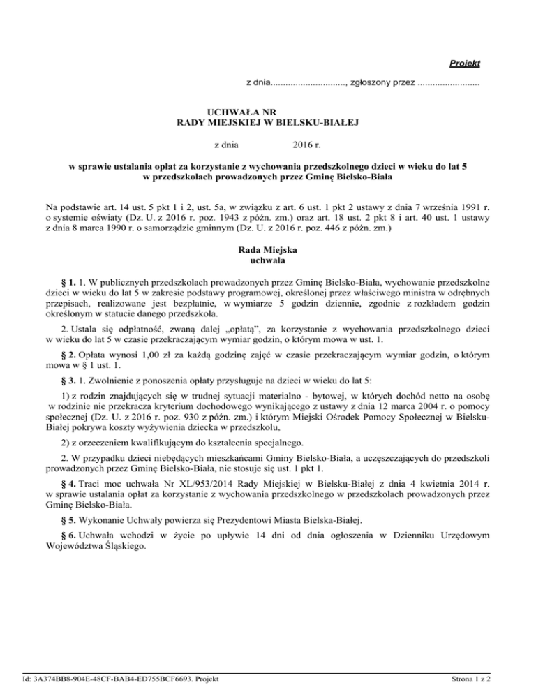 Projekt z dnia.............................., zgłoszony przez ......................... UCHWAŁA NR RADY MIEJSKIEJ W BIELSKU-BIAŁEJ z dnia 2016 r. w sprawie ustalania opłat za korzystanie z wychowania przedszkolnego dzieci w wieku do lat 5 w przedszkolach prowadzonych przez Gminę Bielsko-Biała Na podstawie art. 14 ust. 5 pkt 1 i 2, ust. 5a, w związku z art. 6 ust. 1 pkt 2 ustawy z dnia 7 września 1991 r. o systemie oświaty (Dz. U. z 2016 r. poz. 1943 z późn. zm.) oraz art. 18 ust. 2 pkt 8 i art. 40 ust. 1 ustawy z dnia 8 marca 1990 r. o samorządzie gminnym (Dz. U. z 2016 r. poz. 446 z późn. zm.) Rada Miejska uchwala § 1. 1. W publicznych przedszkolach prowadzonych przez Gminę Bielsko-Biała, wychowanie przedszkolne dzieci w wieku do lat 5 w zakresie podstawy programowej, określonej przez właściwego ministra w odrębnych przepisach, realizowane jest bezpłatnie, w wymiarze 5 godzin dziennie, zgodnie z rozkładem godzin określonym w statucie danego przedszkola. 2. Ustala się odpłatność, zwaną dalej „opłatą”, za korzystanie z wychowania przedszkolnego dzieci w wieku do lat 5 w czasie przekraczającym wymiar godzin, o którym mowa w ust. 1. § 2. Opłata wynosi 1,00 zł za każdą godzinę zajęć w czasie przekraczającym wymiar godzin, o którym mowa w § 1 ust. 1. § 3. 1. Zwolnienie z ponoszenia opłaty przysługuje na dzieci w wieku do lat 5: 1) z rodzin znajdujących się w trudnej sytuacji materialno - bytowej, w których dochód netto na osobę w rodzinie nie przekracza kryterium dochodowego wynikającego z ustawy z dnia 12 marca 2004 r. o pomocy społecznej (Dz. U. z 2016 r. poz. 930 z późn. zm.) i którym Miejski Ośrodek Pomocy Społecznej w BielskuBiałej pokrywa koszty wyżywienia dziecka w przedszkolu, 2) z orzeczeniem kwalifikującym do kształcenia specjalnego. 2. W przypadku dzieci niebędących mieszkańcami Gminy Bielsko-Biała, a uczęszczających do przedszkoli prowadzonych przez Gminę Bielsko-Biała, nie stosuje się ust. 1 pkt 1. § 4. Traci moc uchwała Nr XL/953/2014 Rady Miejskiej w Bielsku-Białej z dnia 4 kwietnia 2014 r. w sprawie ustalania opłat za korzystanie z wychowania przedszkolnego w przedszkolach prowadzonych przez Gminę Bielsko-Biała. § 5. Wykonanie Uchwały powierza się Prezydentowi Miasta Bielska-Białej. § 6. Uchwała wchodzi w życie po upływie 14 dni od dnia ogłoszenia w Dzienniku Urzędowym Województwa Śląskiego. Id: 3A374BB8-904E-48CF-BAB4-ED755BCF6693. Projekt Strona 1 z 2 Uzasadnienie Zgodnie z ustawą z dnia 7 września 1991 r. o systemie oświaty (Dz. U. z 2016 r. poz. 1943 z późn. zm.) przedszkole publiczne zapewnia bezpłatne nauczanie, wychowanie i opiekę w czasie ustalonym przez organ prowadzący, nie krótszym niż 5 godzin dziennie. Dyrektor przedszkola w porozumieniu z organem prowadzącym ustala w statucie rozkład godzin przeznaczonych na realizację podstawy programowej. W bielskich przedszkolach podstawa programowa realizowana jest przez 5 godzin dziennie, w dwóch przedziałach czasowych przypadających na czas obecności wszystkich dzieci, tj. od 730 do 1230 lub od 800 do 1300. Opłata za przedszkola pobierana od rodziców jest opłatą za korzystanie z wychowania przedszkolnego poza czasem przeznaczonym na realizację podstawy programowej wychowania przedszkolnego. Opłatę ustala rada gminy (art. 14 ust. 5 pkt. 1 ustawy o systemie oświaty), a jej wysokość nie może być wyższa niż 1,00 zł za godzinę zajęć. Na mocy ustawy rada gminy posiada również kompetencje do określania warunków częściowego lub całkowitego zwolnienia z opłaty. Za sprawą uchwalonej 1 grudnia 2016 roku zmiany ustawy o dochodach jednostek samorządu terytorialnego oraz niektórych innych ustaw (Dz. U. z 2016 r. poz. 1985) dzieci 6-letnie w przedszkolach zostały objęte subwencją oświatową, a w konsekwencji zniesiono możliwość pobierania opłat za korzystanie przez nich z wychowania przedszkolnego. Po nowelizacji opłata ta dotyczyć będzie wyłącznie dzieci młodszych, tj. w wieku do lat 5. W celu dostosowania prawa miejscowego do nowelizacji prawa należy podjąć nową uchwałę w sprawie opłat za korzystanie z wychowania przedszkolnego dzieci w wieku do lat 5 w przedszkolach prowadzonych przez Gminę Bielsko-Biała, doprecyzowując w ten sposób grupę docelową, których będzie dotyczyć. Ponieważ ustawowo zniesiono możliwość pobierania opłat za korzystanie z wychowania przedszkolnego przez dzieci powyżej 5 lat proponuje się kasację 50% ulgi dla drugiego i kolejnych dzieci w rodzinie korzystających z wychowania przedszkolnego. Z uwagi na wspierającą funkcję państwa proponuje się utrzymanie zwolnienia z wnoszenia opłaty rodziców dzieci będących w bardzo trudnej sytuacji materialno-bytowej, którym MOPS pokrywa żywienie w przedszkolu, jak również dzieci niepełnosprawnych posiadających orzeczenie do kształcenia specjalnego, które podobnie jak 6- latki również objęte są subwencją oświatową. Id: 3A374BB8-904E-48CF-BAB4-ED755BCF6693. Projekt Strona 2 z 2