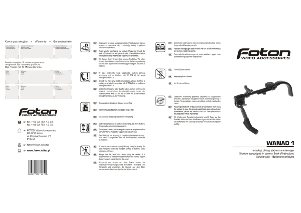 Karta gwarancyjna DATA SPRZEDAŻY PURCHASE DATE VERKAUFSDATUM Warranty PIECZĄTKA SPRZEDAWCY DEALERS STAMP VERKAUFERSTEMPEL Garantieschein PL Dziękujemy za zakup naszego produktu. Przed użyciem statywu prosimy o zapoznanie się z instrukcją obsługi i ogólnymi zasadami użytkowania. EN Thank you for purchasing our product. Please go through the book of instructions and general rules of exploitation before setting about using the shoulder support pad for camera. PODPIS SPRZEDAWCY DEALERS SIGNATURE VERKAUFERUNTERSCHRIFT DE Wir danken Ihnen für den Kauf unseres Produktes. Wir bitten, sich vor dem Gebrauch des Stativs mit der Bedienungsanleitung und mit den allgemeinen Benutzungsgrundregeln bekannt zu machen PL W razie problemów bądź wątpliwości służymy pomocą techniczną pod nr telefonu +48 62 764 46 64, email [email protected] Produkt objęty jest 12 miesięczną gwarancją. This product has 12 months guarantee. Das Produkt hat 12 Monate Garantie. DATA DATE DATUM DATA DATE DATUM PIECZĄTKA STAMP SIEGEL PODPIS SIGNATURE UNTERSCHRIFT PIECZĄTKA STAMP SIEGEL ! PODPIS SIGNATURE UNTERSCHRIFT DE MAX 2 kg tel. +48 62 764 46 64 fax +48 62 764 46 22 FOTON Video Accessories 62-800 Kalisz ul. Częstochowska 77 Poland [email protected] EN 60 -30 Sollten Sie Probleme oder Zweifel haben, stehen wir Ihnen mit unserer technischen Kundenbetreuung unter der Telefonnummer +48 62 764 46 64 oder der E-Mail-Adresse [email protected], zur Verfügung. PL Dopuszczalne obciążenie statywu wynosi 2 kg. EN Maximum support camera pad load is 2 kg (4.4 lb) DE Die zulässige Belastung des Stativs beträgt 2 kg. PL Statyw przeznaczony do użytkowania w temp. od -20°C do 40°C. W przypadku przemoczenia wysuszyć. EN The support camera pad is designed to work at temperature from -20°C to +40°C. In case the support gets wet, dry it up. DE Das Stativ ist zur Nutzung in Umgebungstemperaturen von 20°C bis 40°C vorgesehen. Falls das Stativ nass wird, sollten Sie es trocknen. PL W trakcie pracy zawsze używaj blokady zapięcia głowicy. Na czas transportu zaleca się wypięcie kamery ze statywu. Stosuj pokrowiec ochronny. www.foton.kalisz.pl 5 908275 639855 > Should you have any doubts or problems, please feel free to contact us at telephone number +48 62 764 46 64 or mail as on [email protected] EN Always use the head lock when using the device. It is recommended to unfasten the camera from the camera support during transport. Use protective slip-cover. DE Während der Arbeit mit dem Stativ immer die Kopfstückverriegelungssperre benutzen. Während des Transports wird empfohlen, die Kamera aus dem Stativ auszuspannen. Benutzen Sie bitte das Schutzfutteral. PL Ewentualne zabrudzenia czyścić miękką szmatką bez użycia żrących środków czyszczących. EN Possible dirtying ought to be cleaned with use of soft cloth without any corrosive cleaning agents. DE Eventuelle Verschmutzungen mit einem weichen Lappen ohne ätzende Reinigungsmittel wegwischen. PL Chronić przed dziećmi. EN Keep away from children. DE Vor Kindern schützen. PL Udzielamy 30-dniowej gwarancji satysfakcji na użytkowanie produktu. Jeśli statyw nie spełnia Twoich oczekiwań prosimy o kontakt. Twoja opinia o naszym produkcie jest dla nas bardzo cenna. EN You are granted with 30-day warranty of satisfaction from using the product. In case the camera support pad does not meet your expectations, please feel free to contact us. Your opinion about the products is of high importance. DE Wir erteilen eine Zufriedenheitsgarantie von 30 Tagen auf das Produkt. Sollte das Stativ Ihre Erwartungen nicht erfüllen, bitten wir um Kontakt. Ihre Meinung über unser Produkt ist für uns sehr wichtig. WANAD 1 Instrukcja obsługi statywu naramiennego Shoulder support pad for camera. Book of instructions Schulterstativ – Bedienungsanleitung PL A B 1/4" 3 2 EN Wprowadzenie Dziękujemy bardzo za zainteresowanie naszym produktem. Statyw WANAD 1 został zaprojektowany do pracy z kamerami Canon XL-1 i Canon XL-1S. Dzięki użyciu amortyzatora teleskopowego urządzenie idealnie stabilizuje kamerę w pozycji pionowej i poziomej oraz skutecznie eliminuje wszystkie niepożądane drgania. Używanie statywu minimalizuje zmęczenie ręki i kręgosłupa operatora, a zastosowane regulacje dopasują urządzenie do każdej sylwetki. Model wyposażony jest w automatycznie blokujące szybkozłącze pozwalające na błyskawiczne wypięcie kamery z gniazda i zainstalowanie urządzenia w statywie typu tripod (opcja dodatkowa dostępna w naszej ofercie - poz. kat. "ADAP" - rys. E). Statyw wykonano z estetycznych, najwyższej jakości tworzyw sztucznych oraz lekkich stopów aluminium. Całość zapewnia wysoką wytrzymałość, przy jednoczesnym zachowaniu minimalnej wagi. Oparcie pokryte jest gładkim materiałem gąbczastym, ułatwiającym przyczepność do ubrania osoby obsługującej. W komplecie znajduje się pokrowiec służący do przechowywania i transportu statywu. Montaż kamery (rys. A, B) W celu zainstalowania kamery należy: a. zwolnić blokadę (4), odciągnąć dźwignię (2), a następnie wypiąć płytkę (3), którą za pomocą śruby z gwintem 1/4" przykręcić do spodniej części kamery, b. wpiąć urządzenie do statywu powrotnie wsuwając do gniazda płytkę (3), która automatycznie dociskając zatrzask (1) zwolni dźwignię (2) w pozycję zamknięcia. W celu uniknięcia przypadkowego wypięcia kamery zablokować blokadę dźwigni (4). Regulacja naramiennika (rys. C, D) Konstrukcja statywu umożliwia swobodne wyprofilowanie oparcia naramiennika do kształtu barku operatora. W tym celu należy tymczasowo wypiąć kamerę i bez obaw (używając większej siły) dowolnie ugiąć naramiennik (9). Po wykonaniu tej czynności powtórnie wpiąć kamerę i jeżeli to konieczne poluzować pokrętło (8) ustalając odpowiednią odległość kamery od naramiennika (9). Regulacja podpory (rys. C) Podpora posiada kilka rozwiązań, które pozwolą wyregulować ją w 