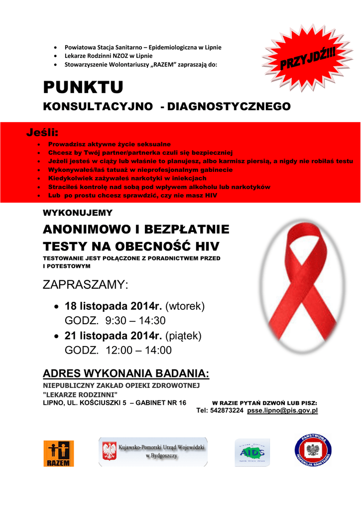 Powiatowa Stacja Sanitarno – Epidemiologiczna w Lipnie Lekarze Rodzinni NZOZ w Lipnie Stowarzyszenie Wolontariuszy „RAZEM” zapraszają do: PUNKTU KONSULTACYJNO - DIAGNOSTYCZNEGO Jeśli: Prowadzisz aktywne życie seksualne Chcesz by Twój partner/partnerka czuli się bezpieczniej Jeżeli jesteś w ciąży lub właśnie to planujesz, albo karmisz piersią, a nigdy nie robiłaś testu Wykonywałeś/łaś tatuaż w nieprofesjonalnym gabinecie Kiedykolwiek zażywałeś narkotyki w iniekcjach Straciłeś kontrolę nad sobą pod wpływem alkoholu lub narkotyków Lub po prostu chcesz sprawdzić, czy nie masz HIV Lub po prostu chcesz sprawdzić, czy nie masz HIV WYKONUJEMY ANONIMOWO I BEZPŁATNIE TESTY NA OBECNOŚĆ HIV TESTOWANIE JEST POŁĄCZONE Z PORADNICTWEM PRZED I POTESTOWYM ZAPRASZAMY: 18 listopada 2014r. (wtorek) GODZ. 9:30 – 14:30 21 listopada 2014r. (piątek) GODZ. 12:00 – 14:00 ADRES WYKONANIA BADANIA: NIEPUBLICZNY ZAKŁAD OPIEKI ZDROWOTNEJ "LEKARZE RODZINNI" LIPNO, UL. KOŚCIUSZKI 5 – GABINET NR 16 W RAZIE PYTAŃ DZWOŃ LUB PISZ: Tel: 542873224 [email protected]