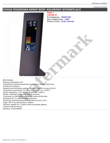 Informacje o produkcie Utworzono 07-03-2017 STACJA POGODOWA KEMOT BEZP. KOLOROWY WYSWIETLACZ Cena : 129,00 zł er m ar k Nr katalogowy : 00001593 Stan magazynowy : niski Średnia ocena : brak recenzji w at SPECYFIKACJA Kolorowy wyświetlacz LCD Temperatura zewnętrzna/wewnętrzna w formie cyfrowej i graficznej Animacja faz księżyca Radiowa synchronizackja budzika (mozliwość wyboru formatu12/24 h) Temperatura wewnętrzna: 0 C do + 50 C (+320 F do +1220 F) Sensor zewnętrzny: -20 C do +60 C (-40 F do +1400 F) Kanały: możliwość podłączenia max. 3 sensorów Transmisja: do 30M (98 ft.) w otwartym terenie RF434 MHz Rozdzielczość: 0.1 stopień C dla temperatury Tolerancja: tolerancja pomiaru temperatury wynosi 1,50 C. Zegar: DCF77 synchronizowany radiowo Zasilanie: adapter 6V i 3 baterie AAA do jednostki głównej 2 baterie AAA do sensora Wymiary: 172x51x48mm Wygenerowano w programie www.oscGold.com