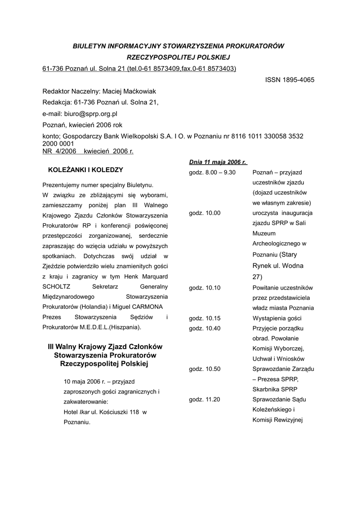 BIULETYN INFORMACYJNY STOWARZYSZENIA PROKURATORÓW RZECZYPOSPOLITEJ POLSKIEJ 61-736 Poznań ul. Solna 21 (tel.0-61 8573409,fax.0-61 8573403) ISSN 1895-4065 Redaktor Naczelny: Maciej Maćkowiak Redakcja: 61-736 Poznań ul. Solna 21, e-mail: [email protected] Poznań, kwiecień 2006 rok konto; Gospodarczy Bank Wielkopolski S.A. I O. w Poznaniu nr 8116 1011 330058 3532 2000 0001 NR 4/2006 kwiecień 2006 r. Dnia 11 maja 2006 r. KOLEŻANKI I KOLEDZY godz. 8.00 – 9.30 Poznań – przyjazd Prezentujemy numer specjalny Biuletynu. uczestników zjazdu W związku ze zbliżającymi się wyborami, (dojazd uczestników zamieszczamy we własnym zakresie) poniżej plan III Walnego Krajowego Zjazdu Członków Stowarzyszenia godz. 10.00 uroczysta inauguracja Prokuratorów RP i konferencji poświęconej zjazdu SPRP w Sali przestępczości Muzeum zorganizowanej, serdecznie zapraszając do wzięcia udziału w powyższych Archeologicznego w spotkaniach. Poznaniu (Stary Dotychczas swój udział w Zjeździe potwierdziło wielu znamienitych gości Rynek ul. Wodna z kraju i zagranicy w tym Henk Marquard 27) SCHOLTZ Sekretarz Międzynarodowego Generalny godz. 10.10 Stowarzyszenia przez przedstawiciela Prokuratorów (Holandia) i Miguel CARMONA Prezes Stowarzyszenia Sędziów Prokuratorów M.E.D.E.L.(Hiszpania). Powitanie uczestników władz miasta Poznania i godz. 10.15 Wystąpienia gości godz. 10.40 Przyjęcie porządku obrad. Powołanie III Walny Krajowy Zjazd Członków Stowarzyszenia Prokuratorów Rzeczypospolitej Polskiej Komisji Wyborczej, Uchwał i Wniosków godz. 10.50 Sprawozdanie Zarządu 10 maja 2006 r. – przyjazd – Prezesa SPRP, zaproszonych gości zagranicznych i Skarbnika SPRP zakwaterowanie: godz. 11.20 Sprawozdanie Sądu Hotel Ikar ul. Kościuszki 118 w Koleżeńskiego i Poznaniu. Komisji Rewizyjnej 2 godz. 11.25 Dyskusja nad godz. 15.05 Ukonstytuowanie sprawozdaniami. nowych władz Głosowanie nad Stowarzyszenia absolutorium dla godz. 15.30 Konferencja prasowa Zarządu. godz. 11.40 godz. 11.45 Uroczyste wręczenie nowych władz SPRP godz. 15.00 - 19.00 Czas wolny (dla gości dyplomów i przewidziane w tym certyfikatów. czasie zwiedzanie Rozpoczęcie miasta) procedury wyborczej – godz. 19.30 Uroczysta kolacja z zgłoszenie udziałem gości Kandydatów do władz; zagranicznych na Prezesa, Zarządu zaproszenie Głównego, Sądu władz miasta Koleżeńskiego, Poznania. Komisji Rewizyjnej godz. 11.50 Głosowanie Informacje dodatkowe godz. 12.00 Przerwa kawowa Obecność członków Stowarzyszenia godz. 12.15 Zmiany w statucie – obowiązkowa. SPRP organizacją Prosimy o posiadanie legitymacji SPRP. pożytku publicznego. godz. 12.20 Przedstawienie założeń nagrody Bene Meritus godz. 12.30 Dyskusja. Program działania SPRP na następną kadencję. Reforma Prokuratury. godz. 13.25 Wolne wnioski. godz. 13.30 Podjęcie uchwał zjazdowych godz. 13.50 Sprawozdanie Komisji Wyborczej ogłoszenie wyników wyborów godz. 14.00 Uroczysty obiad godz. 14.45 Wznowienie obrad. Expose nowego Prezesa. godz. 15.00 Zamknięcie obrad Program międzynarodowej konferencji poświęconej przestępczości zorganizowanej Dnia 12 maja 2006 r. Konferencja na temat: Świadek Koronny jako instrument zwalczania przestępczości zorganizowanej Hotel Ikar, ul. Kościuszki 118, Poznań godz. 7.30 - 9.00 Śniadanie godz. 9.00 -10.15 Rozpoczęcie konferencji powitanie prezentacja uczestników zaproszonych wprowadzenie w tematykę i gości, konferencji - prowadzący ppłk Krzysztof Parulski godz. 10.15 -10.45 Teoretyczne aspekty instytucji świadka koronnego 3 - prowadzący Janusz Kaczmarek – Prokurator godz. 10.00 -10.05 Rozpoczęcie drugiego dnia konferencji Krajowy godz. 10.45 -11.30 Świadek koronny w - prowadzący: ppłk Krzysztof Parulski godz. 10.05 -10.50 praktyce Obecny stan ochrony prokuratorów i innych prokuratorskiej funkcjonariuszy - prowadzący: przedstawiciel Biura Zwalczania Przestępczości Zorganizowanej Prokuratury – Krajowej Głównej Policji godz. 11.30 -11.45 Przerwa na kawę godz. 11.45 -12.30 Kierunki ustawy prowadzący: przedstawiciel godz. 10.50 -11. Bezpieczeństwo prokuratora - aspekty nowelizacji o Komendy prawne świadku - prowadzący: prokurator mjr Zbigniew Rzepa koronnym - prowadzący: Paweł Korbal – Prokurator godz. 11.30 -11.45 Przerwa na kawę Apelacyjny w Poznaniu godz. 11.45 -12.20 Bezpieczeństwo godz. 12.30 -13.30 Prezentacja świadka ew. prokuratora, aspekty instytucji praktyczne koronnego innych metod - prowadzący: prokurator ppłk Mikołaj Przybył godz. 12.20 -14.00 zwalczania Wymiana doświadczeń o bezpieczeństwie przestępczości zorganizowanej w prokuratora w krajach krajach – europejskich Europy zaproszeni goście zaproszeni goście godz. 13.30 -14.15 godz. 14.15 -14.30 - Dyskusja uczestników godz.14.00-14.45 Dyskusja nad konferencji. wprowadzeniem Podsumowanie systemu ochrony pierwszego prokuratora w Polsce dnia konferencji godz. 14.45 -15.00 Podsumowanie – ppłk Krzysztof Parulski dyskusji – wnioski de godz. 14.30 Konferencja prasowa lege ferenda godz. 15.00 -16.00 Obiad – ppłk Krzysztof Parulski godz. 16.00 -19.30 Zwiedzanie godz.15.00 Obiad i zakończenie Wielkopolski godz. 19. 30 konferencji Kolacja i spotkanie integracyjne Informacje dodatkowe: Konferencję organizują SPRP i Ministerstwo Sprawiedliwości Dnia 13 maja 2006 r. Uczestnictwo prokuratorów w konferencjach i Bezpieczeństwo prokuratora szkoleniach Hotel Ikar, ul. Kościuszki 118, Poznań Stowarzyszenie Rzeczypospolitej godz. 7.30 - 9.50 Śniadanie organizowanych przez Prokuratorów Polskiej, zgodnie z 4 ustaleniami z Prokuraturą Krajową traktowane Prosimy o przekazywanie wszelkich informacji, jest jako udział w zajęciach służbowych. które mają być zamieszczone w Biuletynie na wyżej podany adres e-mailowy. Koszty szkolenia, uczestników wyżywienia ponosi i pobytu Stowarzyszenie Nasze sprawy. Prokuratorów Rzeczypospolitej Polskiej wraz ze współfinansującymi instytucjami. W Interne