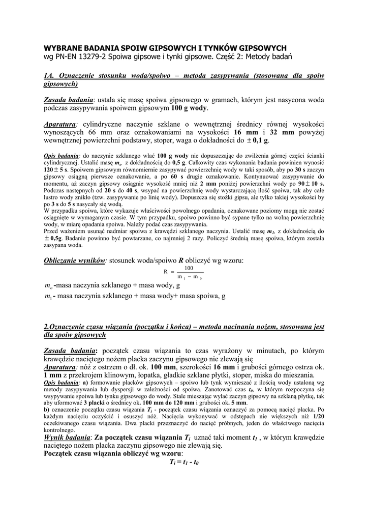 WYBRANE BADANIA SPOIW GIPSOWYCH I TYNKÓW GIPSOWYCH wg PN-EN 13279-2 Spoiwa gipsowe i tynki gipsowe. Część 2: Metody badań 1A. Oznaczenie stosunku woda/spoiwo – metoda zasypywania (stosowana dla spoiw gipsowych) Zasada badania: ustala się masę spoiwa gipsowego w gramach, którym jest nasycona woda podczas zasypywania spoiwem gipsowym 100 g wody. Aparatura: cylindryczne naczynie szklane o wewnętrznej średnicy równej wysokości wynoszących 66 mm oraz oznakowaniami na wysokości 16 mm i 32 mm powyŜej wewnętrznej powierzchni podstawy, stoper, waga o dokładności do ± 0,1 g. Opis badania: do naczynie szklanego wlać 100 g wody nie dopuszczając do zwilŜenia górnej części ścianki cylindrycznej. Ustalić masę mo z dokładnością do 0,5 g. Całkowity czas wykonania badania powinien wynosić 120 ± 5 s. Spoiwem gipsowym równomiernie zasypywać powierzchnię wody w taki sposób, aby po 30 s zaczyn gipsowy osiągną pierwsze oznakowanie, a po 60 s drugie oznakowanie. Kontynuować zasypywanie do momentu, aŜ zaczyn gipsowy osiągnie wysokość mniej niŜ 2 mm poniŜej powierzchni wody po 90 ± 10 s. Podczas następnych od 20 s do 40 s, wsypać na powierzchnię wody wystarczającą ilość spoiwa, tak aby całe lustro wody znikło (tzw. zasypywanie po linię wody). Dopuszcza się stoŜki gipsu, ale tylko takiej wysokości by po 3 s do 5 s nasycały się wodą. W przypadku spoiwa, które wykazuje właściwości powolnego opadania, oznakowane poziomy mogą nie zostać osiągnięte w wymaganym czasie. W tym przypadku, spoiwo powinno być sypane tylko na wolną powierzchnię wody, w miarę opadania spoiwa. NaleŜy podać czas zasypywania. Przed waŜeniem usunąć nadmiar spoiwa z krawędzi szklanego naczynia. Ustalić masę m1, z dokładnością do ± 0,5g. Badanie powinno być powtarzane, co najmniej 2 razy. Policzyć średnią masę spoiwa, którym została zasypana woda. Obliczanie wyników: stosunek woda/spoiwo R obliczyć wg wzoru: R = 100 m1 − m 0 mo -masa naczynia szklanego + masa wody, g m1 - masa naczynia szklanego + masa wody+ masa spoiwa, g 2.Oznaczenie czasu wiązania (początku i końca) – metoda nacinania noŜem, stosowana jest dla spoiw gipsowych Zasada badania: początek czasu wiązania to czas wyraŜony w minutach, po którym krawędzie naciętego noŜem placka zaczynu gipsowego nie zlewają się Aparatura: nóŜ z ostrzem o dł. ok. 100 mm, szerokości 16 mm i grubości górnego ostrza ok. 1 mm z przekrojem klinowym, łopatka, gładkie szklane płytki, stoper, miska do mieszania. Opis badania: a) formowanie placków gipsowych – spoiwo lub tynk wymieszać z ilością wody ustaloną wg metody zasypywania lub dyspersji w zaleŜności od spoiwa. Zanotować czas t0, w którym rozpoczyna się wsypywanie spoiwa lub tynku gipsowego do wody. Stale mieszając wylać zaczyn gipsowy na szklaną płytkę, tak aby uformować 3 placki o średnicy ok. 100 mm do 120 mm i grubości ok. 5 mm. b) oznaczenie początku czasu wiązania Ti - początek czasu wiązania oznaczyć za pomocą nacięć placka. Po kaŜdym nacięciu oczyścić i osuszyć nóŜ. Nacięcia wykonywać w odstępach nie większych niŜ 1/20 oczekiwanego czasu wiązania. Dwa placki przeznaczyć do nacięć próbnych, jeden do właściwego nacięcia kontrolnego. Wynik badania: Za początek czasu wiązania Ti uznać taki moment t1 , w którym krawędzie naciętego noŜem placka zaczynu gipsowego nie zlewają się. Początek czasu wiązania obliczyć wg wzoru: Ti = t1 - t0 3.Oznaczenie wytrzymałości na zginanie związanego zaczynu Badanie wykonuje się na 3 próbkach o wymiarach 4*4*16 cm po 2 godzinach twardnienia przy uŜyciu prasy hydraulicznej. NaleŜy wykonać zaczyn gipsowy (z ok. 2 kg gipsu), o ustalonej ilości wody i wypełnić nim formę stalową do wykonywania próbek 4*4*16 cm; górną powierzchnię próbek wyrównać. Po okresie twardnienia i wysuszeniu do stałej masy (temp. 40 ± 20C przygotowanych próbek, wykonać badanie. Wynik oznaczenia: Rzg = Mmax / W [MPa]; Mmax = Pl/4 [Nm], moment zginający niszczący, gdzie l = 10 cm (0.1 m) , P - siła wywołująca moment zginający [N], W = bh2/6 [cm3, m3], b=h=4 cm (0.04m) 4. Oznaczenie wytrzymałości na ściskanie związanego zaczynu Badanie wykonuje się na 6-ściu połówkach beleczek 4*4*16 cm (naleŜy wziąć połówki z beleczek złamanych podczas badania wytrzymałości na zginanie) Powierzchnia ściskania (docisku) wynosi 16 cm2. Siła ściskająca niszcząca próbkę jest odczytywana z dynamometru prasy. Wynik oznaczenia: Rc = P/F , [MPa] P - siła ściskająca niszcząca próbkę, [N] F - pole powierzchni prostopadłe do kierunku działania siły, [m2] Badanie wytrzymałości na ściskanie pozwala określić gatunek gipsu. Gatunek gipsu budowlanego - liczba określająca wymaganą wytrzymałość na ściskanie dla zaczynu gipsowego o normalnej konsystencji w [MPa], oznaczona po 2 godzinach twardnienia i wysuszeniu do stałej masy w temp. 40 ± 2 oC. Gatunki gipsu budowlanego to: GB-G6, GB-G8,GB-D6 i GB-D8; ( D-gips drobno mielony; G- gips grubo mielony). WYBRANE BADANIA SPOIWA CEMENTOWEGO 1. Oznaczenie normalnej konsystencji Badanie wykonuje się przy uŜyciu aparatu Vicata, którego część ruchoma (o masie 300±2g ) zakończona bolcem o powierzchni średnicowej 1 cm2 zwrócona jest ku dołowi. NaleŜy wstępnie wykonać zaczyn cementowy o składzie: 125 cm3 wody i 500 g cementu; zaczynem tym wypełnić pierścień ebonitowy aparatu Vicata o wysokości 40mm ustawiony na płytce szklanej o wym.10*10 cm. Następnie pierścień ustawić na stoliku aparatu Vicata, a bolec o F=1cm2 na górnej powierzchni zaczynu i po 4 min. ±10 sek. od połączenia spoiwa z wodą zmierzyć zagłębienie bolca w zaczyn po 30 sek. Wynik oznaczenia: zaczyn ma normalną konsystencję, jeŜeli po 4 min.± ±10 sek od połączenia spoiwa z wodą plus 30 sek. zagłębiania się w zaczyn, bolec zatrzyma się nad płytką szklaną 5÷ ÷7 mm (zagłębi się w zaczyn 3