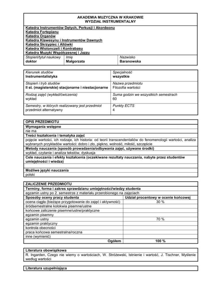 AKADEMIA MUZYCZNA W KRAKOWIE WYDZIAŁ INSTRUMENTALNY Katedra Instrumentów Dętych, Perkusji i Akordeonu Katedra Fortepianu Katedra Organów Katedra Klawesynu i Instrumentów Dawnych Katedra Skrzypiec i Altówki Katedra Wiolonczeli i Kontrabasu Katedra Muzyki Współczesnej i Jazzu Stopień/tytuł naukowy Imię doktor Małgorzata Nazwisko Baranowska Kierunek studiów Instrumentalistyka Specjalność wszystkie Stopień i tryb studiów II st. (magisterskie) stacjonarne i niestacjonarne Nazwa przedmiotu Filozofia wartości Rodzaj zajęć (wykład/ćwiczenia) wykład Suma godzin we wszystkich semestrach 60 Semestry, w których realizowany jest przedmiot przedmiot alternatywny Punkty ECTS 4 OPIS PRZEDMIOTU Wymagania wstępne nie ma Treści kształcenia i tematyka zajęć pojęcie wartości, ich rodzaje, ich historia: od teorii transcendentaliów do fenomenologii wartości, analiza wybranych przykładów wartości: dobro i zło, piękno, wolność, miłość, szczęście Metody nauczania (sposób prowadzenia/odbywania zajęć, używane środki) wykład, czytanie i analiza tekstów, dyskusja Cele nauczania i efekty kształcenia (oczekiwane rezultaty nauczania, nabyte przez studentów umiejętności i wiedza) Możliwe języki nauczania polski ZALICZENIE PRZEDMIOTU Terminy, forma i zakres sprawdzianu umiejętności/wiedzy studenta egzamin ustny po 2. semestrze z materiału przerobionego na zajęciach Sposoby oceny pracy studenta Udział procentowy w ocenie końcowej ocena ciągła (bieżące przygotowanie do zajęć i aktywność) 30 % śródsemestralne kolokwia pisemne/ustne końcowe zaliczenie pisemne/ustne/praktyczne egzamin pisemny egzamin ustny 70 % egzamin praktyczny kontrola obecności praca końcowa semestralna/roczna inne (wymienić) Ogółem 100 % Literatura obowiązkowa R. Ingarden, Czego nie wiemy o wartościach, W. Stróżewski, Istnienie i wartość, J. Tischner, Myślenie według wartości Literatura uzupełniająca P. Ricoeur, Zło. Wyzwanie rzucone filozofii i teologii, P.Ricoeur, Symbolika zła J. Tischner, Filozofia dramatu J. Brach-Czaina, Szczeliny istnienia J. Filek, Filozofia jako etyka H. Arendt, Wola E. Fromm, Ucieczka od wolności I. Berlin, Dwie koncepcje wolności Z. Bauman, Wolność J.S. Mill, O wolności W.Tatarkiewicz, O szczęściu C.S.Lewis, Cztery miłości M. Scheler, Istota i formy sympatii Denis de Rougemont, Miłość a świat kultury zachodniej D. de Rougemont, Mity o miłości Hildebrand, Tischner i in, Wobec wartości W. Stróżewski, W kręgu wartości W. Stróżewski, Wokół piękna