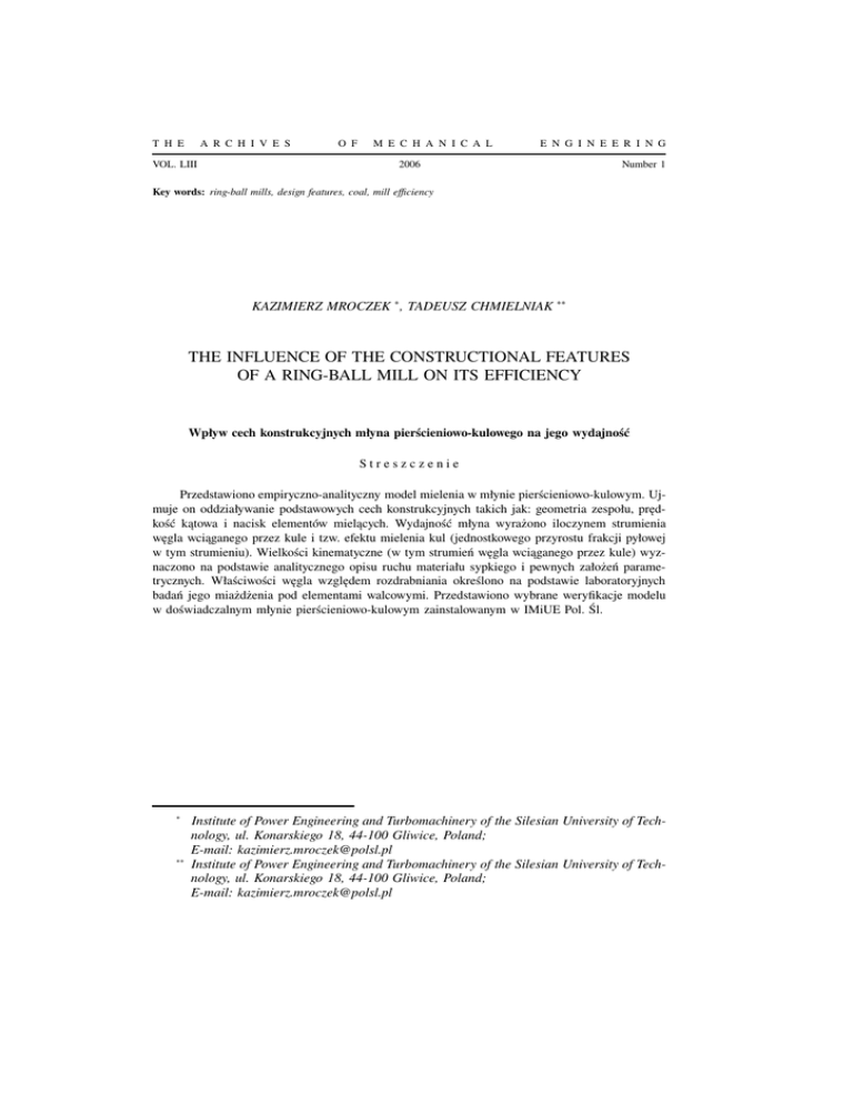 T H E A R C H I V E S VOL. LIII O F M E C H A N I C A L E N G I N E E R I N G 2006 Number 1 Key words: ring-ball mills, design features, coal, mill efficiency KAZIMIERZ MROCZEK ∗ , TADEUSZ CHMIELNIAK ∗∗ THE INFLUENCE OF THE CONSTRUCTIONAL FEATURES OF A RING-BALL MILL ON ITS EFFICIENCY Wpływ cech konstrukcyjnych młyna pierścieniowo-kulowego na jego wydajność Streszczenie Przedstawiono empiryczno-analityczny model mielenia w młynie pierścieniowo-kulowym. Ujmuje on oddziaływanie podstawowych cech konstrukcyjnych takich jak: geometria zespołu, prędkość kątowa i nacisk elementów mielących. Wydajność młyna wyrażono iloczynem strumienia węgla wciąganego przez kule i tzw. efektu mielenia kul (jednostkowego przyrostu frakcji pyłowej w tym strumieniu). Wielkości kinematyczne (w tym strumień węgla wciąganego przez kule) wyznaczono na podstawie analitycznego opisu ruchu materiału sypkiego i pewnych założeń parametrycznych. Właściwości węgla względem rozdrabniania określono na podstawie laboratoryjnych badań jego miażdżenia pod elementami walcowymi. Przedstawiono wybrane weryfikacje modelu w doświadczalnym młynie pierścieniowo-kulowym zainstalowanym w IMiUE Pol. Śl. ∗ ∗∗ Institute of Power Engineering and Turbomachinery of the Silesian University of Technology, ul. Konarskiego 18, 44-100 Gliwice, Poland; E-mail: [email protected] Institute of Power Engineering and Turbomachinery of the Silesian University of Technology, ul. Konarskiego 18, 44-100 Gliwice, Poland; E-mail: [email protected]