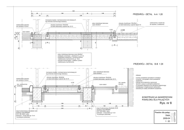 3.84 6 40 6 1.90 64 40 6 1.00 8 mocowanie sùupów i rozmieszczenie œrub kotwi¹cych wg schematu technicznego dostawcy obrze¿e chodnikowe 100x25x8 na ùawie betonowej z oporem bet. B-15 pùyty chodnikowe betonowe szare 50x50x7 obrze¿e trawnikowe 100x20x6 na ùawie betonowej z oporem bet. B-15 nawierzchnia ¿wirowa ¿wir pùukany 0-32mm +2.00 ± 0.00 nawierzchnia z kostki bet. do naprawy / przeùo¿enia ± 0.00 8 16 70 16 60 60 18 10 20 25 10 10 10 teren zieleni 20 PRZEKRÓJ - DETAL A-A 1:20 8 3.00 5 5 23 - pùyty chodnikowe betonowe szare 50x50x7 - podsypka cementowo - piaskowa1:3, gr.4 cm - podbudowa zasadnicza - kryszywo ùamane stabilizowane mechanicznie, gr. 10cm - warstwa wzmacniaj¹ca - podùo¿e z piasku stabilizowane mechanicznie PRZEKRÓJ - DETAL B-B 1:20 pùyty chodnikowe betonowe szare 50x50x7 mocowanie sùupów i rozmieszczenie œrub kotwi¹cych wg schematu technicznego dostawcy obrze¿e trawnikowe 100x20x6 na ùawie betonowej z oporem bet. B-15 obrze¿e chodnikowe 100x25x8 na ùawie betonowej z oporem bet. B-15 +2.00 ± 0.00 istn. nawierzchnia asfaltowa istn. opaska ¿wirowa teren zieleni 60 16 - wymiary projektowe sprawdzaã na bie¿¹co w terenie, w przypadku zmian powiadomiã projektanta - wykopy pod fundamenty wykonywaã rêcznie z uwagi na uzbrojenie podziemne - w przypadku pojawienia siê uzbrojenia podziemnego koliduj¹cego z projektowanymi elementami budowlanymi nale¿y powiadomiã projektanta 20 10 10 nawierzchnia ¿wirowa ¿wir pùukany 0-32mm UWAGA: 5 KONSTRUKCJA NAWIERZCHNI PAWILONU DLA PAL¥CYCH 15 40 1.90 54 35 stopa fundamentowa 40x40x60, B-20 zbrojenie stal¹ RB500W (#12 i #6) doùem i gór¹ poduszka - chudy beton gr. 5 cm na podsypce piaskowej 6 1.50 2.30 40 6 1.65 54 6 20 1.03 6 stopa fundamentowa 40x40x60, B-20 zbrojenie stal¹ RB500W (#12 i #6) doùem i gór¹ poduszka - chudy beton gr. 5 cm na podsypce piaskowej 50 Rys. nr 8 Pawilon dla pal¹cych - Polkowice Detal 2009-04 1 : 20
