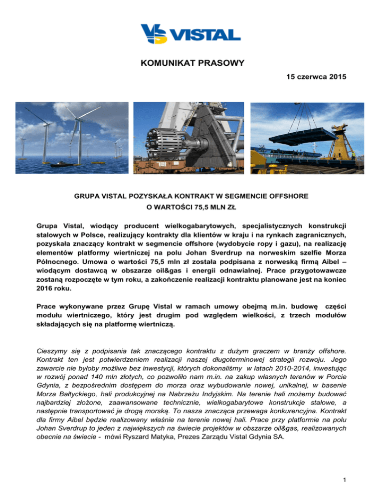KOMUNIKAT PRASOWY 15 czerwca 2015 GRUPA VISTAL POZYSKAŁA KONTRAKT W SEGMENCIE OFFSHORE O WARTOŚCI 75,5 MLN ZŁ Grupa Vistal, wiodący producent wielkogabarytowych, specjalistycznych konstrukcji stalowych w Polsce, realizujący kontrakty dla klientów w kraju i na rynkach zagranicznych, pozyskała znaczący kontrakt w segmencie offshore (wydobycie ropy i gazu), na realizację elementów platformy wiertniczej na polu Johan Sverdrup na norweskim szelfie Morza Północnego. Umowa o wartości 75,5 mln zł została podpisana z norweską firmą Aibel – wiodącym dostawcą w obszarze oil&gas i energii odnawialnej. Prace przygotowawcze zostaną rozpoczęte w tym roku, a zakończenie realizacji kontraktu planowane jest na koniec 2016 roku. Prace wykonywane przez Grupę Vistal w ramach umowy obejmą m.in. budowę części modułu wiertniczego, który jest drugim pod względem wielkości, z trzech modułów składających się na platformę wiertniczą. Cieszymy się z podpisania tak znaczącego kontraktu z dużym graczem w branży offshore. Kontrakt ten jest potwierdzeniem realizacji naszej długoterminowej strategii rozwoju. Jego zawarcie nie byłoby możliwe bez inwestycji, których dokonaliśmy w latach 2010-2014, inwestując w rozwój ponad 140 mln złotych, co pozwoliło nam m.in. na zakup własnych terenów w Porcie Gdynia, z bezpośrednim dostępem do morza oraz wybudowanie nowej, unikalnej, w basenie Morza Bałtyckiego, hali produkcyjnej na Nabrzeżu Indyjskim. Na terenie hali możemy budować najbardziej złożone, zaawansowane technicznie, wielkogabarytowe konstrukcje stalowe, a następnie transportować je drogą morską. To nasza znacząca przewaga konkurencyjna. Kontrakt dla firmy Aibel będzie realizowany właśnie na terenie nowej hali. Prace przy platformie na polu Johan Sverdrup to jeden z największych na świecie projektów w obszarze oil&gas, realizowanych obecnie na świecie - mówi Ryszard Matyka, Prezes Zarządu Vistal Gdynia SA. 1 Dodatkowych informacji udziela: Beata Cioczek M+G tel. +48 22 416 01 02, +48 508 385 432 e-mail: [email protected] NAJWAŻNIEJSZE INFORMACJE O VISTAL GDYNIA S.A. Grupa Vistal jest wiodącym producentem specjalistycznych, wielkogabarytowych, konstrukcji stalowych o najwyższej jakości w Polsce, którego doświadczenie i organizacja pozwalają na oferowanie różnorodnych typów konstrukcji stalowych, zarówno dla partnerów polskich, jak i zagranicznych, w tym na bardzo wymagających rynkach skandynawskich czy na rynku niemieckim. Grupa Vistal rozpoczęła działalność 24 lata temu, obecnie tworzy ją łącznie 12 spółek specjalizujących się w poszczególnych segmentach działalności w zakresie wytwarzania konstrukcji stalowych. Głównym przedmiotem działalności Grupy jest wytwarzanie i montaż stalowych konstrukcji spawanych wszelkiego typu, w tym dla sektora infrastrukturalnego, offshore, budownictwa kubaturowego oraz energetycznego. Grupa oferuje również usługi zabezpieczeń antykorozyjnych, wykonawstwa rurociągów oraz konstrukcje ze stali nierdzewnej i aluminium dla sektora ochrony środowiska. Ponadto w ramach świadczonych usług znajdują się kompleksowe usługi wykonywania powłok antykorozyjnych, w tym cynkowanie. Szeroka i kompleksowa oferta stanowi istotną przewagę konkurencyjną Grupy VISTAL. Grupa działa w wielu sektorach rynkowych, główna działalność skupiona jest na następujących segmentach: infrastruktura – budowa i montaż mostów oraz wiaduktów, tuneli, estakad i barier akustycznych marine – budowa kadłubów specjalistycznych jednostek pływających i statków m.in. dla budowy farm wiatrowych, obsługi platform wiertniczych, wydobywczych ropy. i gazu, jachtów stalowych, a także dużych dźwigów dla infrastruktury portowej. offshore – konstrukcje stalowe związane z przemysłem wydobycia ropy i gazu oraz elementy dla morskich elektrowni wiatrowych. budownictwo specjalistyczne (przemysłowe, kubaturowe, hydrotechniczne) – wytwarzanie konstrukcji stalowych m.in. dla obiektów sportowych, przemysłowych, hydrotechnicznych i innych obiektów użyteczności publicznej pozostałe konstrukcje stalowe - wieże linii energetycznych i telekomunikacyjnych, elementy konstrukcji elektrowni i elektrociepłowni, elementy konstrukcji stalowych dla oczyszczalni ścieków, silosów, zbiorników Zakłady produkcyjne Grupy Vistal są bardzo korzystnie zlokalizowane – Grupa ma dostęp do 6,5 ha terenów portowych, z długością nabrzeża 900 m (tereny na Nabrzeżu Indyjskim i Nabrzeżu Węgierskim) oraz do szlaków morskich. Pozwala to na prefabrykację konstrukcji i transport drogą morską. Korzystna lokalizacja umożliwiła też Grupie m.in. pozyskanie zleceń na realizacje konstrukcji okrętowych dla norweskich i holenderskich odbiorców Tereny należące do Grupy znajdują się na obszarze Pomorskiej Specjalnej Strefy Ekonomicznej. Oferta VISTAL spełnia najwyższe wymagania jakościowe wynikające z krajowych i europejskich norm, a także specyficznych wymagań branżowych m.in. dla konstrukcji offshore, obiektów kolejowych czy dźwigowych. Potwierdzeniem jakości są świadectwa i certyfikaty wraz ze sprawnie funkcjonującym Zintegrowanym Systemem Zarządzania zgodnym z normami: ISO 9001: 2008 (system zarządzania jakością), ISO 14001: 2004 (system zarządzania środowiskowego), OHS.A.S 18001: 2007 (system zarządzania higieną i bezpieczeństwem prac). Grupa VISTAL posiada liczne certyfikaty branżowe, m.in.: PN-EN ISO 3834-2 dotyczący wymagań jakości spawania materiałów metalowych, DNV - spawanie blach S355 do 105 mm, spawanie odlewów stalowych do 120 mm, DIN 188007 Kl. E - dopuszczenie do wykonawstwa elementów nośnych ze stali pracujących, 2 DIN 4132 - dopuszczenie do wykonawstwa obiektów kolejowych, Ril 804 - dopuszczenie do wykonawstwa obiektów dźwigowych, Fb. 103/104 Głównymi akcjonariuszami Vistal Gdynia S.A. są Pan Ryszard Matyka, Prezes Zarządu Vistal Gdynia S.A., posiadaj