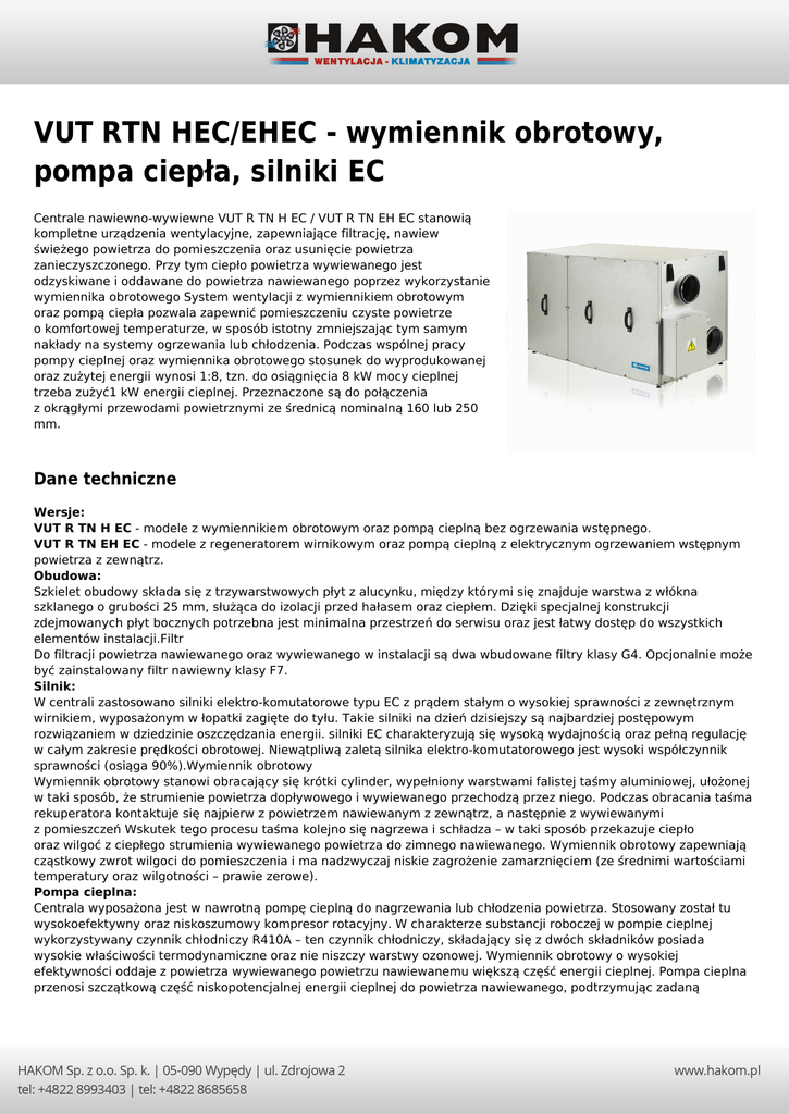 VUT RTN HEC/EHEC - wymiennik obrotowy, pompa ciepła, silniki EC Centrale nawiewno-wywiewne VUT R TN H EC / VUT R TN EH EC stanowią kompletne urządzenia wentylacyjne, zapewniające filtrację, nawiew świeżego powietrza do pomieszczenia oraz usunięcie powietrza zanieczyszczonego. Przy tym ciepło powietrza wywiewanego jest odzyskiwane i oddawane do powietrza nawiewanego poprzez wykorzystanie wymiennika obrotowego System wentylacji z wymiennikiem obrotowym oraz pompą ciepła pozwala zapewnić pomieszczeniu czyste powietrze o komfortowej temperaturze, w sposób istotny zmniejszając tym samym nakłady na systemy ogrzewania lub chłodzenia. Podczas wspólnej pracy pompy cieplnej oraz wymiennika obrotowego stosunek do wyprodukowanej oraz zużytej energii wynosi 1:8, tzn. do osiągnięcia 8 kW mocy cieplnej trzeba zużyć1 kW energii cieplnej. Przeznaczone są do połączenia z okrągłymi przewodami powietrznymi ze średnicą nominalną 160 lub 250 mm. Dane techniczne Wersje: VUT R TN H EC - modele z wymiennikiem obrotowym oraz pompą cieplną bez ogrzewania wstępnego. VUT R TN EH EC - modele z regeneratorem wirnikowym oraz pompą cieplną z elektrycznym ogrzewaniem wstępnym powietrza z zewnątrz. Obudowa: Szkielet obudowy składa się z trzywarstwowych płyt z alucynku, między którymi się znajduje warstwa z włókna szklanego o grubości 25 mm, służąca do izolacji przed hałasem oraz ciepłem. Dzięki specjalnej konstrukcji zdejmowanych płyt bocznych potrzebna jest minimalna przestrzeń do serwisu oraz jest łatwy dostęp do wszystkich elementów instalacji.Filtr Do filtracji powietrza nawiewanego oraz wywiewanego w instalacji są dwa wbudowane filtry klasy G4. Opcjonalnie może być zainstalowany filtr nawiewny klasy F7. Silnik: W centrali zastosowano silniki elektro-komutatorowe typu EC z prądem stałym o wysokiej sprawności z zewnętrznym wirnikiem, wyposażonym w łopatki zagięte do tyłu. Takie silniki na dzień dzisiejszy są najbardziej postępowym rozwiązaniem w dziedzinie oszczędzania energii. silniki EC charakteryzują się wysoką wydajnością oraz pełną regulację w całym zakresie prędkości obrotowej. Niewątpliwą zaletą silnika elektro-komutatorowego jest wysoki współczynnik sprawności (osiąga 90%).Wymiennik obrotowy Wymiennik obrotowy stanowi obracający się krótki cylinder, wypełniony warstwami falistej taśmy aluminiowej, ułożonej w taki sposób, że strumienie powietrza dopływowego i wywiewanego przechodzą przez niego. Podczas obracania taśma rekuperatora kontaktuje się najpierw z powietrzem nawiewanym z zewnątrz, a następnie z wywiewanymi z pomieszczeń Wskutek tego procesu taśma kolejno się nagrzewa i schładza – w taki sposób przekazuje ciepło oraz wilgoć z ciepłego strumienia wywiewanego powietrza do zimnego nawiewanego. Wymiennik obrotowy zapewniają cząstkowy zwrot wilgoci do pomieszczenia i ma nadzwyczaj niskie zagrożenie zamarznięciem (ze średnimi wartościami temperatury oraz wilgotności – prawie zerowe). Pompa cieplna: Centrala wyposażona jest w nawrotną pompę cieplną do nagrzewania lub chłodzenia powietrza. Stosowany został tu wysokoefektywny oraz niskoszumowy kompresor rotacyjny. W charakterze substancji roboczej w pompie cieplnej wykorzystywany czynnik chłodniczy R410A – ten czynnik chłodniczy, składający się z dwóch składników posiada wysokie właściwości termodynamiczne oraz nie niszczy warstwy ozonowej. Wymiennik obrotowy o wysokiej efektywności oddaje z powietrza wywiewanego powietrzu nawiewanemu większą część energii cieplnej. Pompa cieplna przenosi szczątkową część niskopotencjalnej energii cieplnej do powietrza nawiewanego, podtrzymując zadaną przez użytkownika temperaturę powietrza. Nagrzewnica: Centrala VUT R TN EH EC wyposażona w nagrzewnicę elektryczną, przeznaczoną do ogrzewania wstępnego powietrza z zewnątrz przy niskiej temperaturze otoczenia. Wykorzystanie ogrzewania wstępnego pozwala skrócić częstotliwość włączenia cykli rozmrażania pompy cieplnej, co zwiększa skuteczność użytkową centrali. Nagrzewnica jest podzielona na dwa elementy aktywne, co pozwala w sposób oszczędny zużywać energię elektryczną oraz zapewniać przy tym wystarczającą moc nagrzewania. Sterowanie i automatyka: Centrala posiada wbudowany system automatyki oraz wielofunkcyjny panel sterowania A17 (th-Tune) lub A18 (pGD1). Do kompletu wchodzi również przewód o długości 10 m do połączenia centrali z panelem sterowania. Podstawowe tryby pracy instalacji: Tryb "Auto": Centrala pracuje w trybie automatycznym, zapewniając wentylację nawiewno-wywiewną w pomieszczeniu oraz podtrzymując ustawioną przez użytkownika temperaturę powietrza w pomieszczeniu. Tryb "grzanie": Centrala zapewnia wentylację nawiewno--wywiewną w pomieszczeniu oraz podtrzymuje temperaturę powietrza w pomieszczeniu nie niższą niż jest ustawiona przez użytkownika. Jeżeli temperatura powietrza w pomieszczeniu jest poniżej ustawionej normy, włącza się rekuperator oraz pompa cieplna (do ogrzewania). Tryb "chłodzenie": Centrala zapewnia wentylację nawiewno-wywiewną oraz podtrzymuje temperaturę powietrza w pomieszczeniu nie wyższą niż jest ustawiona przez użytkownika. Jeżeli temperatura powietrza w pomieszczeniu jest wyższa niż jest ustawiona przez użytkownika, włącza się rekuperator oraz pompa cieplna (do chłodzenia). Tryb "rekuperacja": Centrala zapewnia wentylację nawiewno-wywiewną oraz podtrzymuje temperaturę powietrza w pomieszczeniu za pomocą rekuperatora bez włączenia pompy cieplnej. Aktywuje się w trybach "Auto", "Grzanie", "Ochłodzenie", jeżeli do zapewnienia zadanej przez użytkownika temperatury powietrza wystarczy praca rekuperatora i nie ma potrzeby aktywowania pompy cieplnej. Również możliwa jest aktywacja ręczna w menu centrali lub panelu sterowania A18 (pGD1). Tryb "wentylacja": Centrala zapewnia wentylację nawiewno--wywiewną bez utrzym
