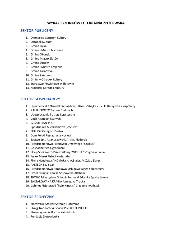 WYKAZ CZŁONKÓW LGD KRAJNA ZŁOTOWSKA SEKTOR PUBLICZNY 1. 2. 3. 4. 5. 6. 7. 8. 9. 10. 11. 12. 13. Okoneckie Centrum Kultury Ośrodek Kultury Gmina Lipka Gmina i Miasto Jastrowie Gmina Okonek Gmina Miasto Złotów Gmina Złotów Gmina i Miasto Krajenka Gmina Tarnówka Gmina Zakrzewo Gminny Ośrodek Kultury Starostwo Powiatowe w Złotowie Krajeński Ośrodek Kultury SEKTOR GOSPODARCZY 1. 2. 3. 4. 5. 6. 7. 8. 9. 10. 11. 12. 13. 14. 15. 16. 17. 18. 19. 20. Hipomedical 2 Ośrodek Rehabilitacji Dzieci Zabajka 2 s.c. K.Klaczyńska i wspólnicy P.H.U. CROTEX Tomasz Stelmach Ubezpieczenia i Usługi Logistyczne Cech Rzemiosł Różnych SZCZOT-MAL PPUH Spółdzielnia Mieszkaniowa „Zacisze” FUH ZSK Grzegorz Dudko Dom Polski Restauracja Noclegi Zacisze Sp.j. A.Januszewski, A. i M. Fiedurek Przedsiębiorstwo Przemysłu Drzewnego "SZAŁER" Gospodarstwo Ogrodnicze Sklep Spożywczo-Przemysłowy "WOJTUŚ" Zbigniew Capar Jasiek Marek Usługi Kurierskie Firma Handlowa ANDMAR s.c. A.Blajer, M.Zając Blajer PALTECH Sp. z o.o. Przedsiębiorstwo Handlowo-Usługowe Kinga Sobieszczyk Hotel "Krajna" Teresa Sosnowska-Allaham TIVOLO Mieczysław Gniot & Romuald Zdrenka Spółka Jawna ZACZAROWANA KRAINA Agnieszka Trocka Gabinet Fizjoterapii "Fizjo-Kinesis" Grzegorz Iwańczyk SEKTOR SPOŁECZNY 1. 2. 3. 4. Złotowskie Stowarzyszenie Kulturalne Okręg Nadnotecki PZW w Pile KOŁO MIEJSKIE Stowarzyszenie Rodzin Katolickich Fundacja Złotowianka 5. 6. 7. 8. 9. 10. 11. 12. 13. 14. 15. 16. 17. 18. 19. 20. 21. 22. 23. 24. 25. 26. 27. 28. 29. 30. 31. 32. 33. 34. 35. 36. 37. 38. 39. 40. 41. 42. 43. 44. 45. 46. 47. 48. 49. 50. Miejski Ludowy Klub Sportowy „SPARTA” Koło PZW „KRAJNA” Stowarzyszenie Lokalna Grupa Rybacka Pojezierze Krajeńskie Oddział Krajeński „KRAJNA” Związek Artystów Plastyków Polski Związek Niewidomych Okręg Wielkopolski Zarząd Koła Powiatowego Organizacja Turystyczna Północnej Wielkopolski „Dolina Noteci" Stowarzyszenie Przyjazna Edukacja Stowarzyszenie Przyjaciół Harcerstwa Ziemi Złotowskiej "RODŁO" ZHP Chorągiew Wlkp. Hufiec Złotów Stowarzyszenie dla Rozwoju Starej Wiśniewki i Okolic "GROMADA" Stowarzyszenie dla rozwoju wsi Stawnica i okolic "BLISKO SIEBIE" Ochotnicza Straż Pożarna w Tarnówce Polski Związek Emerytów, Rencistów i Inwalidów, Zarząd Oddziału Rejonowego w Okonku Towarzystwo Miłośników Krajenki Stowarzyszenie Inicjatyw Lokalnych "Horyzont" Stowarzyszenie Inicjatyw Lokalnych "Tilia" Stowarzyszenie Wspólnie Możemy Więcej Ochotnicza Straż Pożarna im. Jana Waldowskiego Ochotnicza Straż Pożarna Augustowo - Głubczyn Stowarzyszenie Pomocy Publicznej Szkole Podstawowej w Głubczynie Tomasz Zabrocki Marcin Tessmer Marta Paciorek Karolina Liwińska Tomasz Sławski Marta Glugla Marcin Podmokły Adriana Ziturus Wojciech Herbert Bortnowski Ewa Smolarz Małgorzata Miłoch Paweł Michał Owsianny Arkadiusz Michalski Magdalena Borsich Ewa Brożek Paweł Balcerzyk Piotr Kozłowski Wiesław Fidurski Aleksandra Sawicka Małgorzata Dunikowska Magdalena Paciorek Mariusz Piękniewski Wojciech Polski Małgorzata Banasiak-Piec Paweł Michalski Aleksandra Zachęć Zestawienie nie uwzględnia członków założycieli i złożonych deklaracji o przystąpieniu